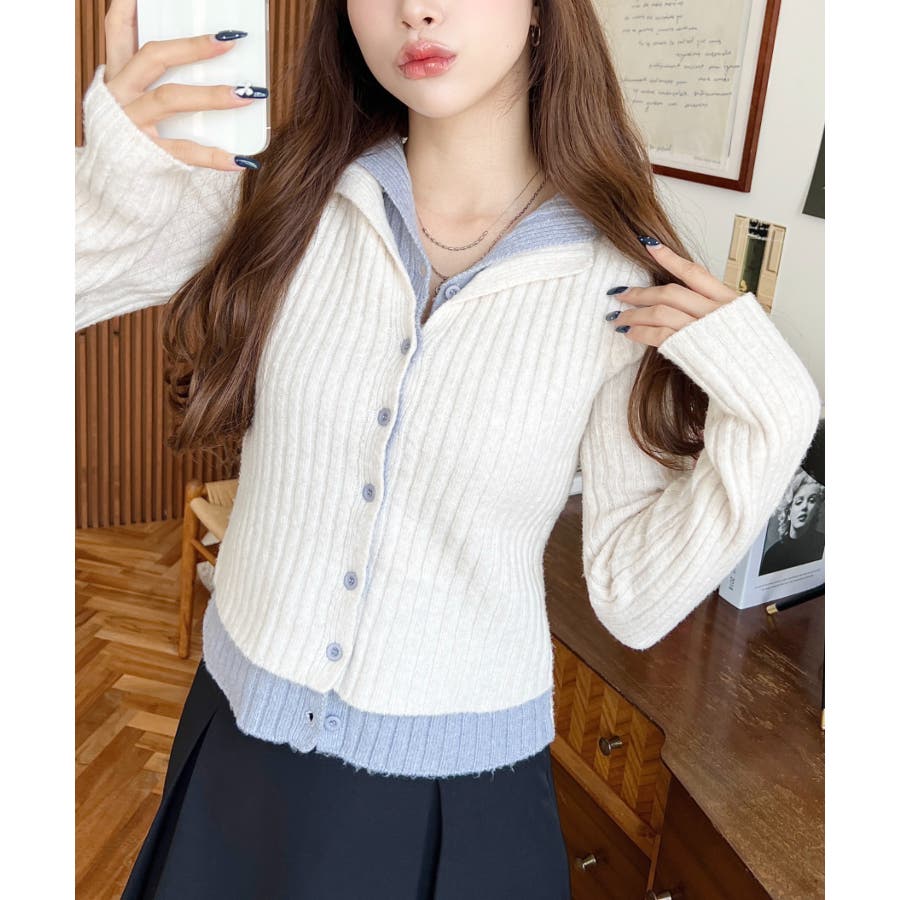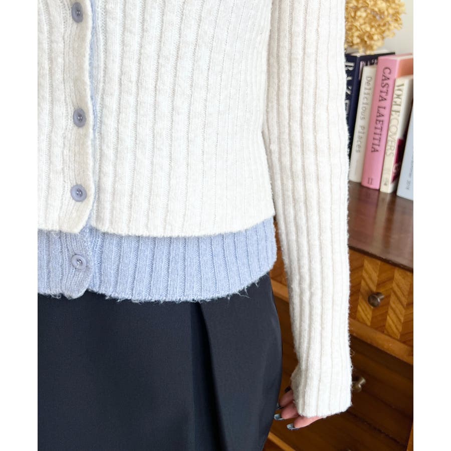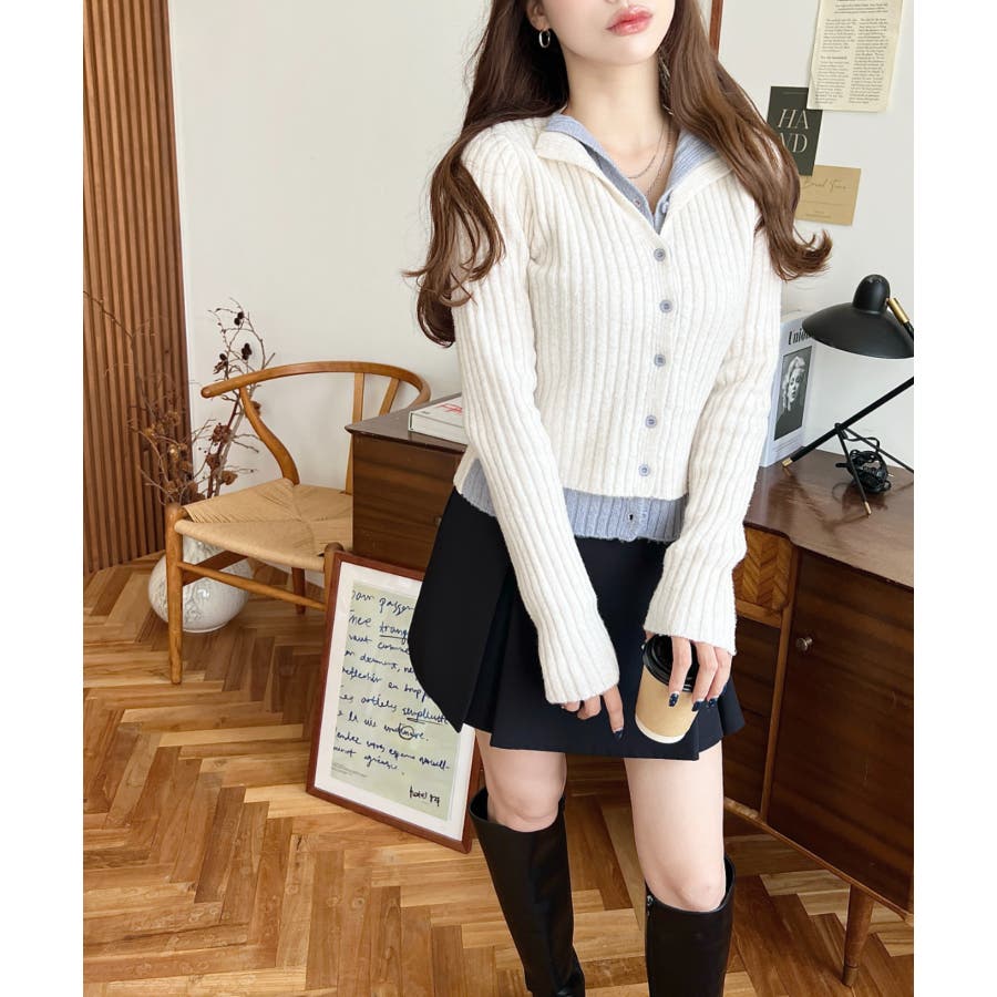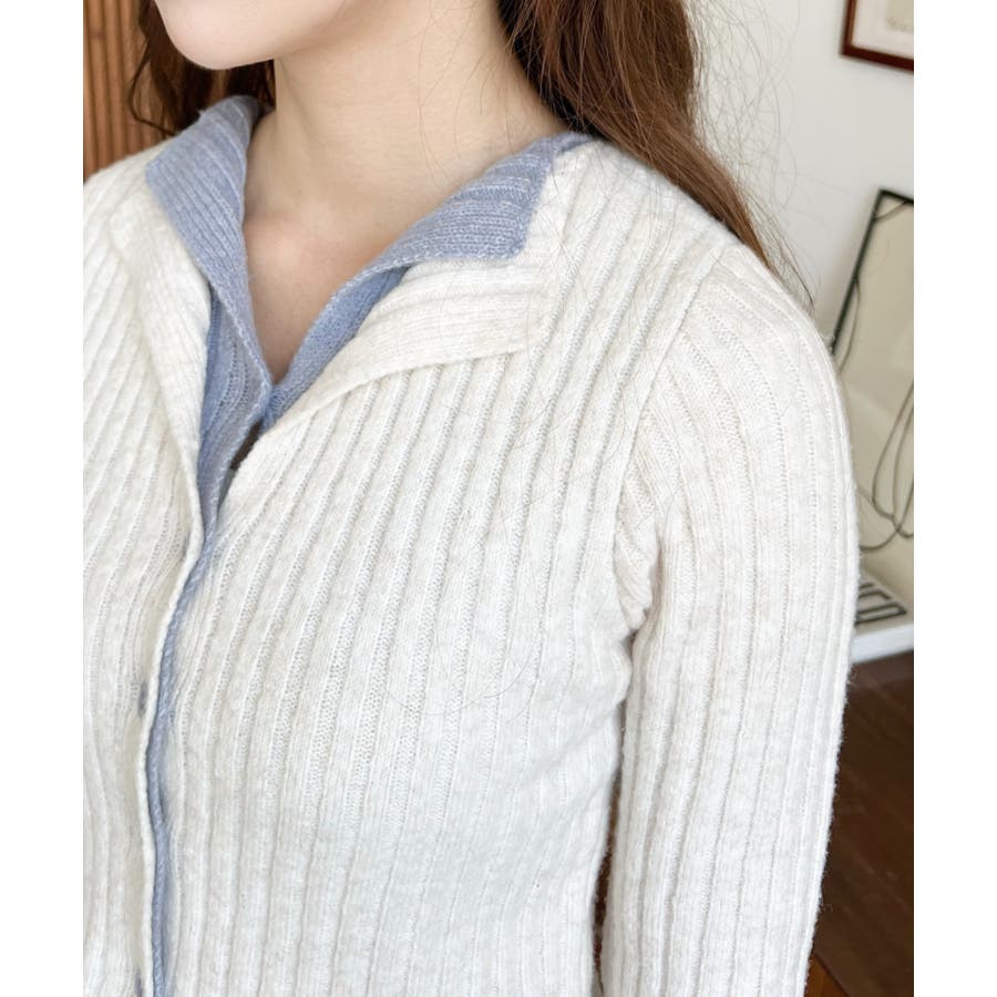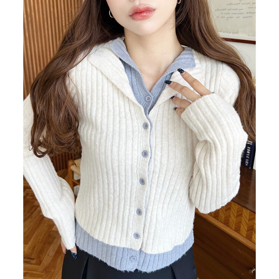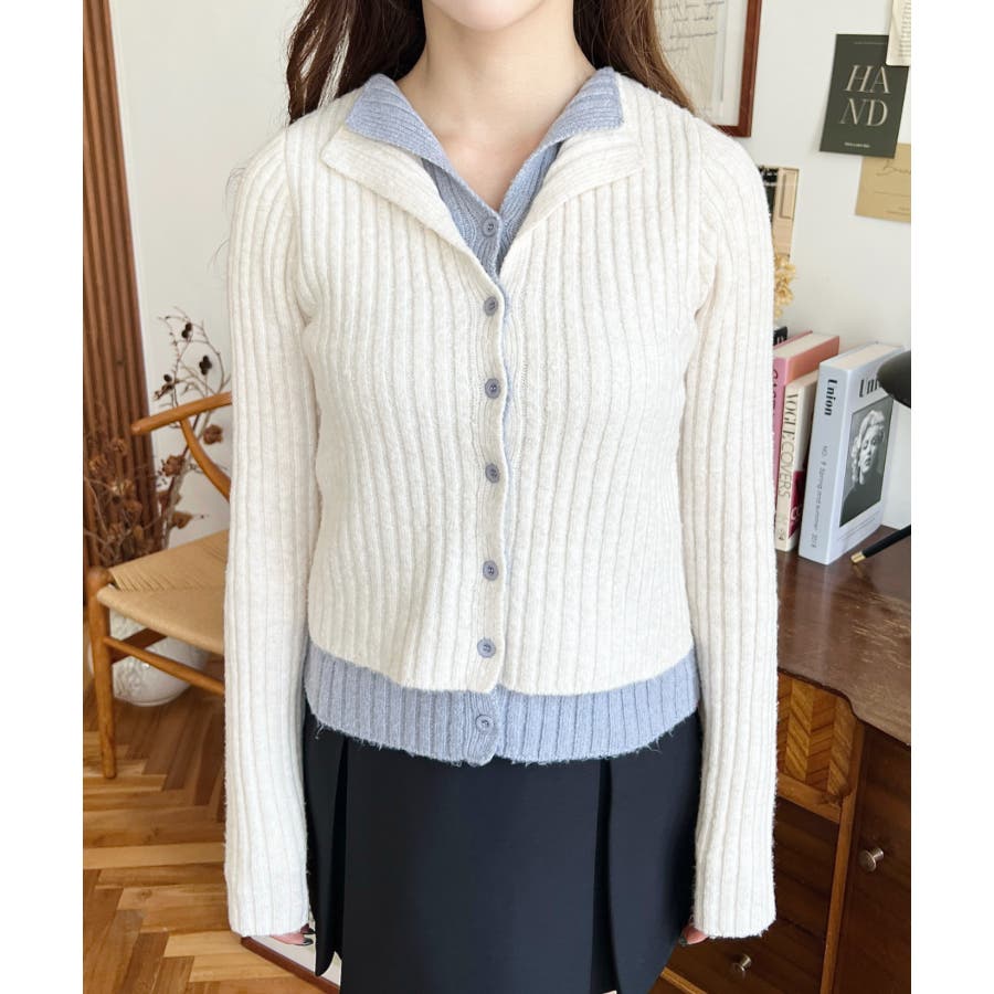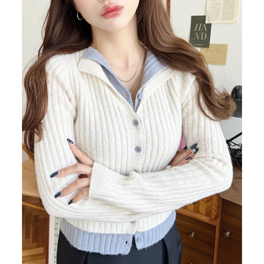 レイヤードカーディガン風リブニットトップス