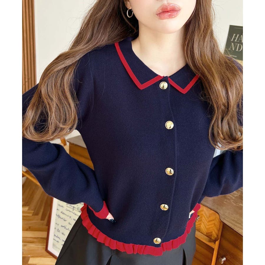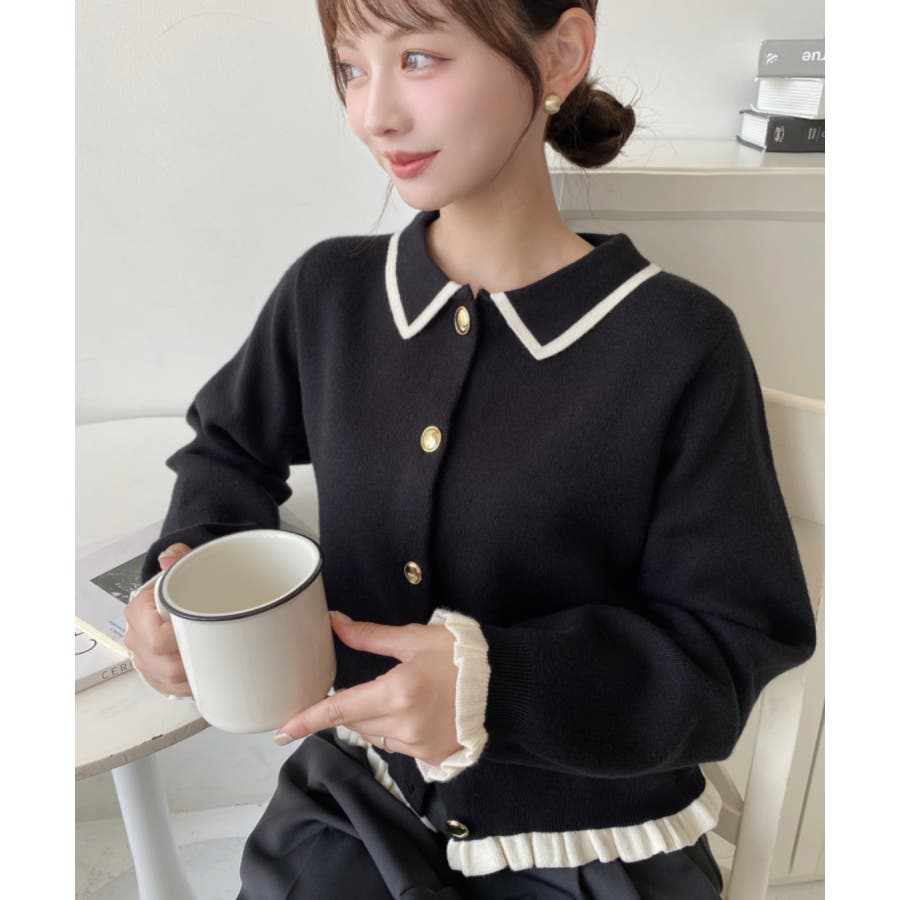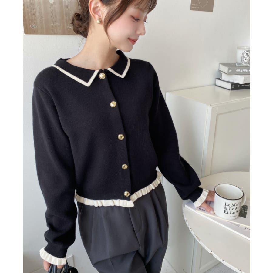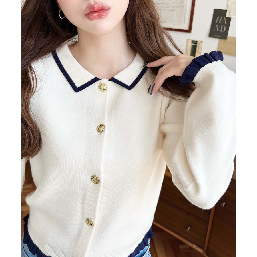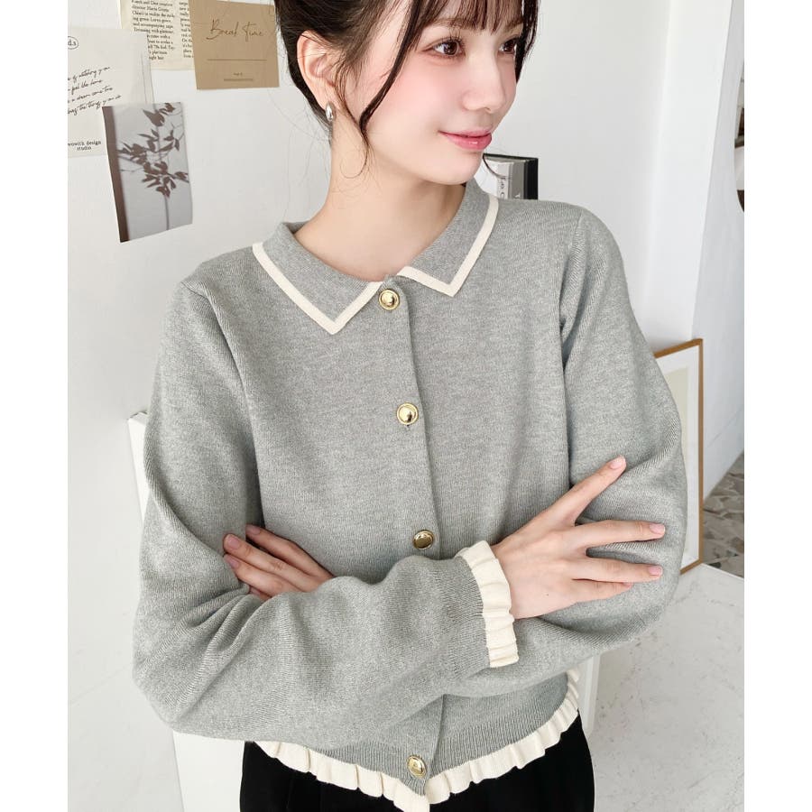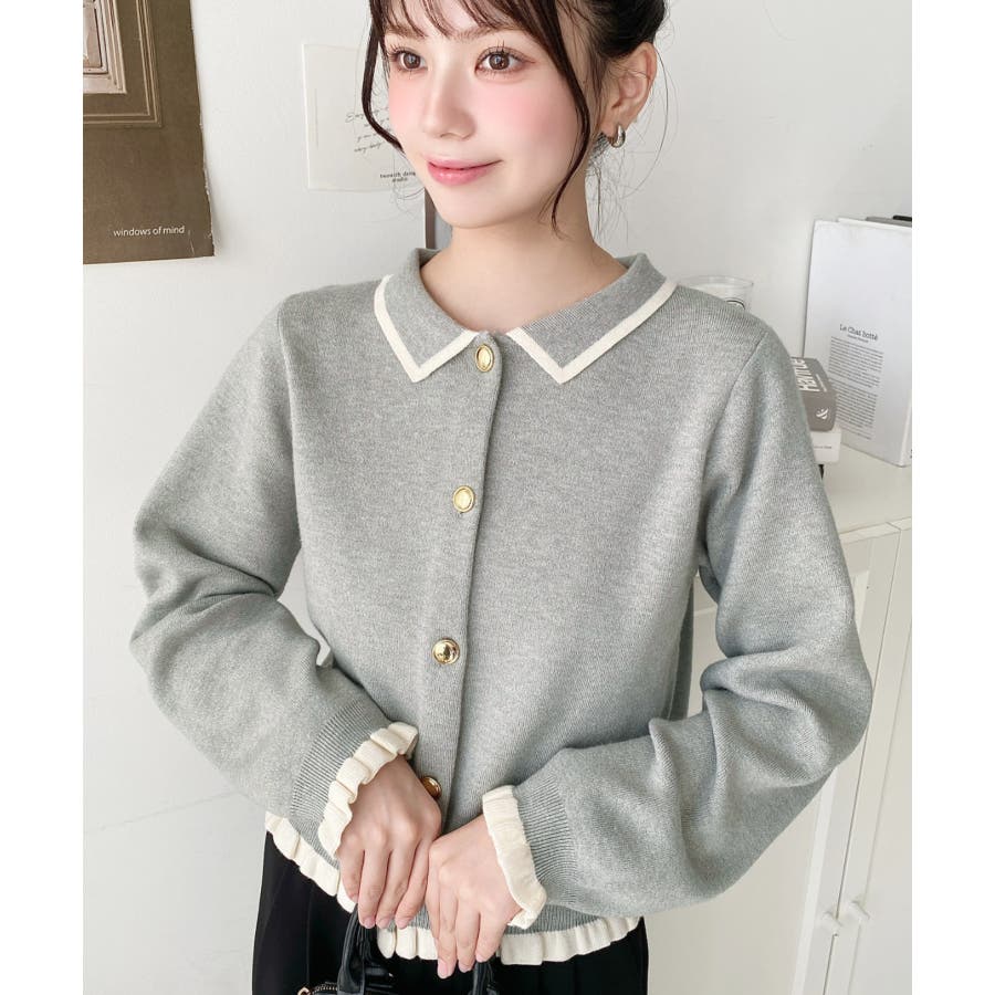 【裾フリルが可愛いアクセント♪えり付き配色カーディガン】