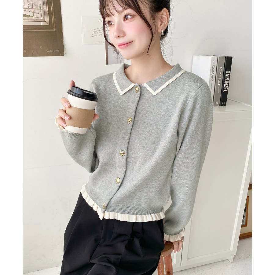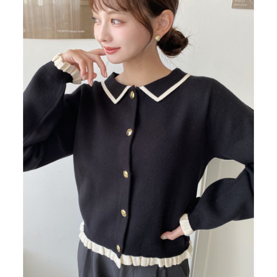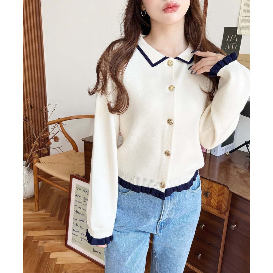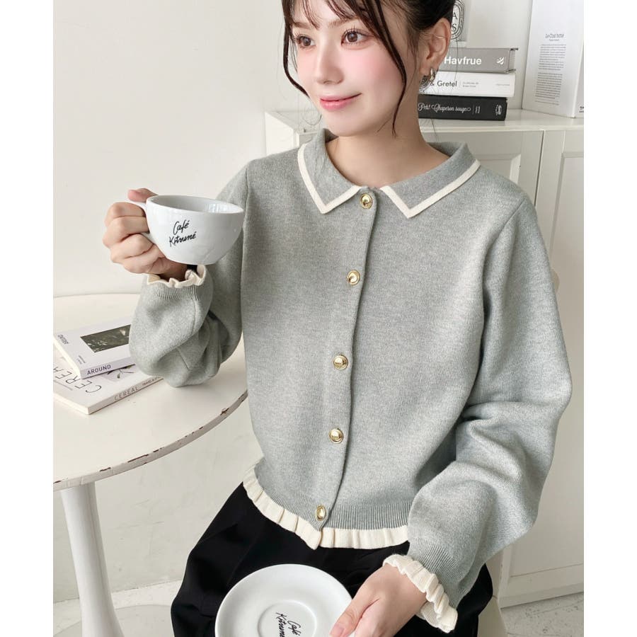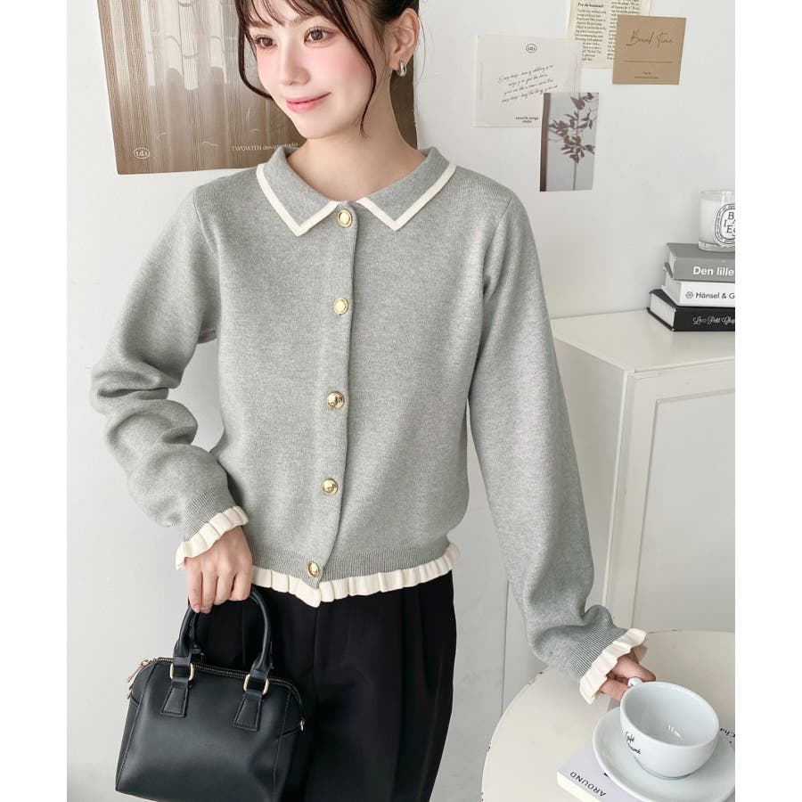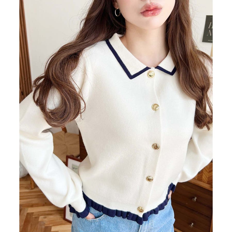 【裾フリルが可愛いアクセント♪えり付き配色カーディガン】