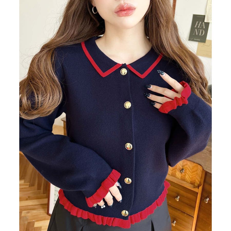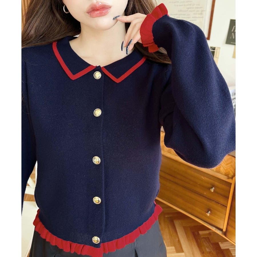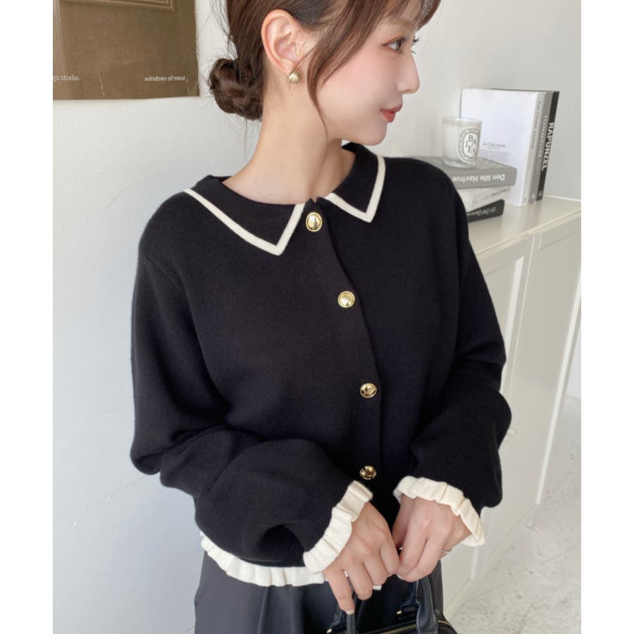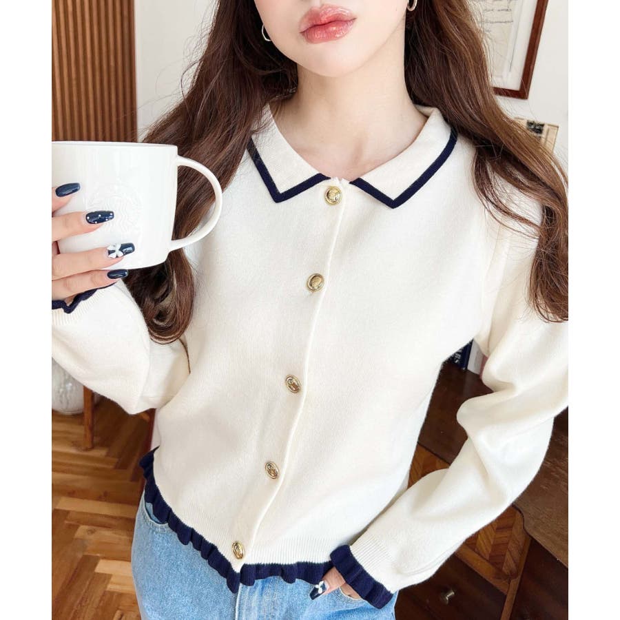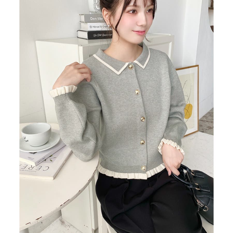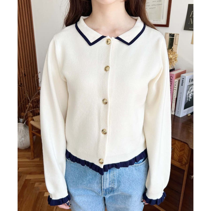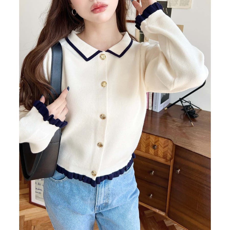 【裾フリルが可愛いアクセント♪えり付き配色カーディガン】