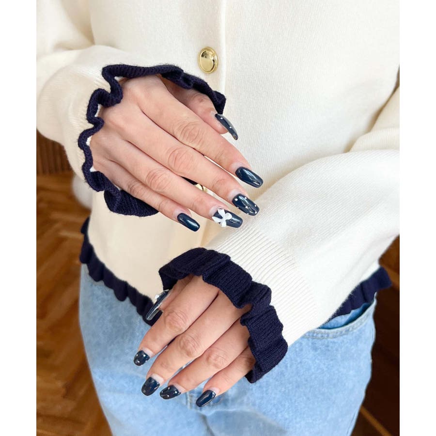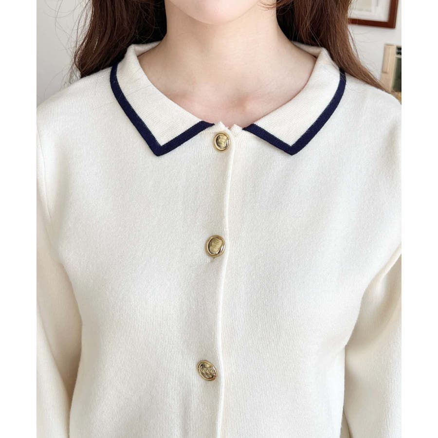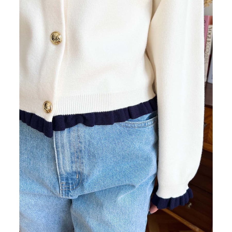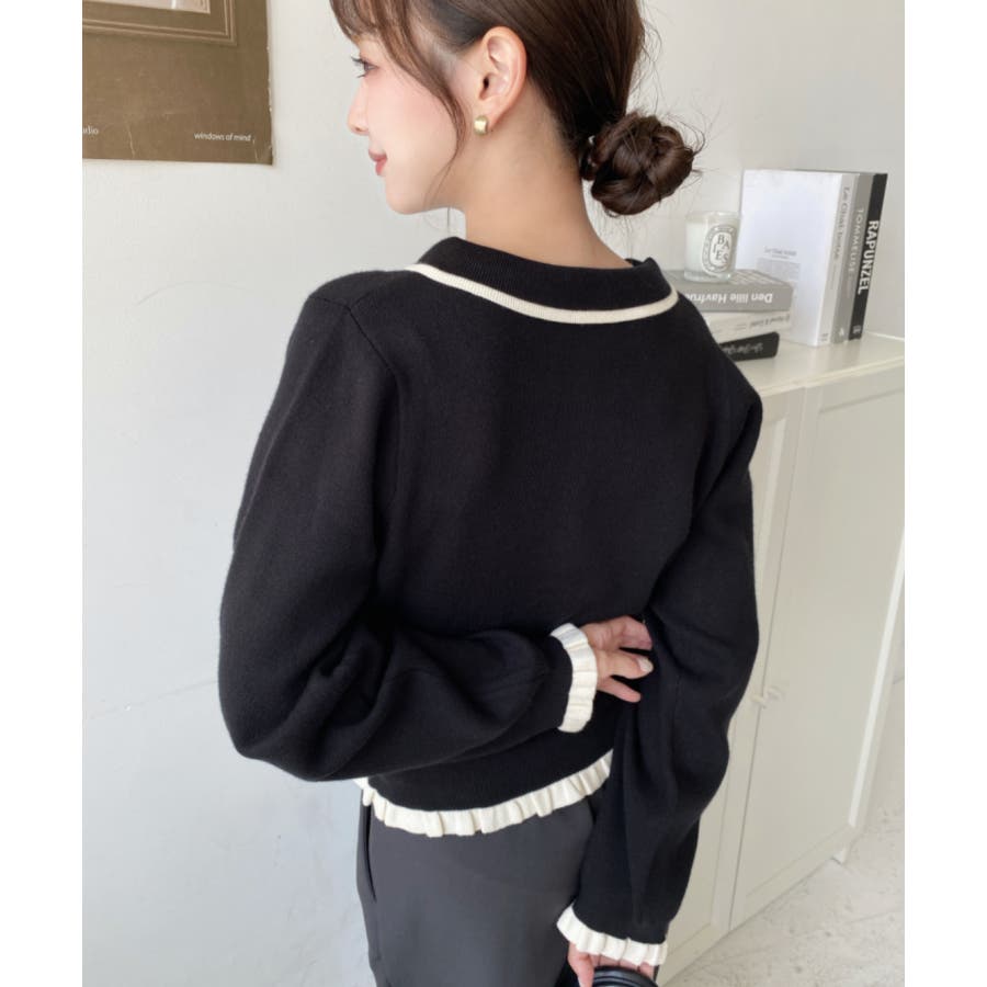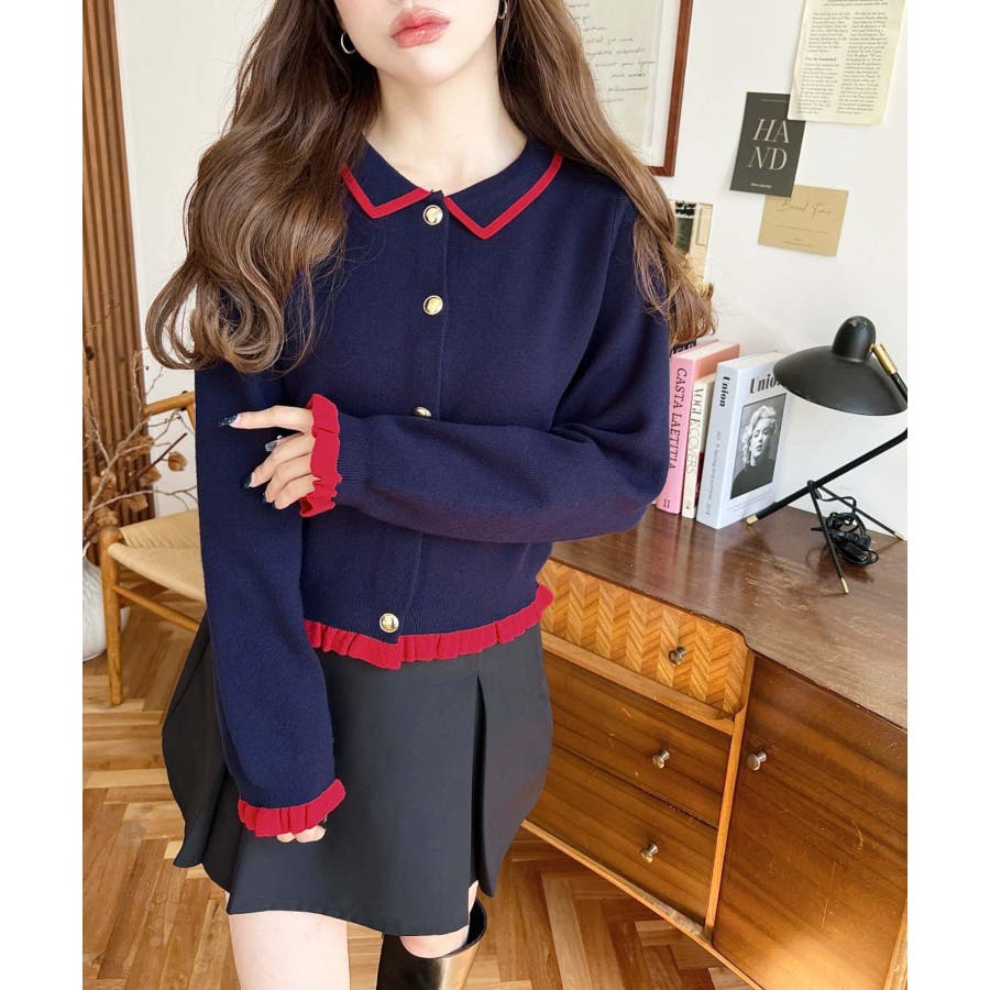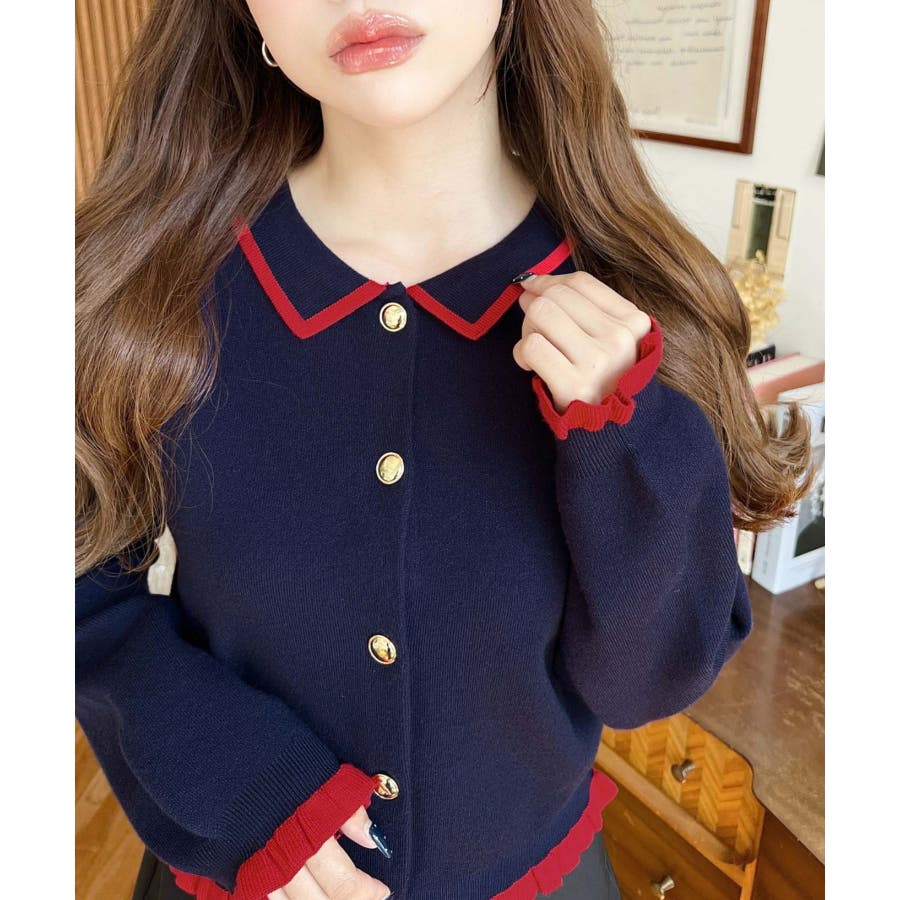 【裾フリルが可愛いアクセント♪えり付き配色カーディガン】