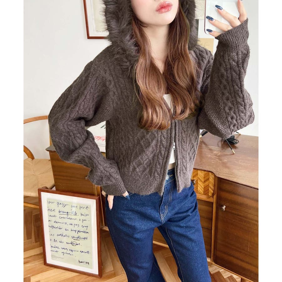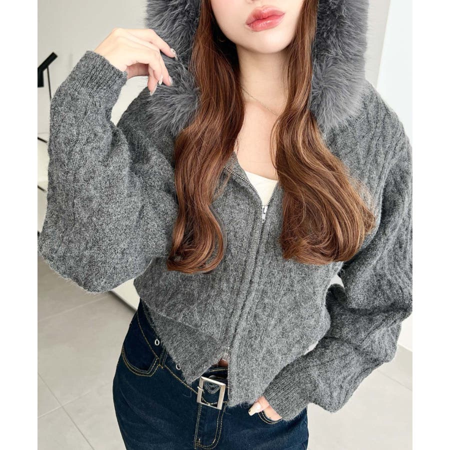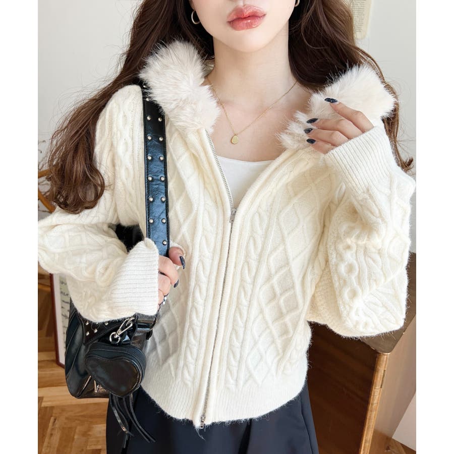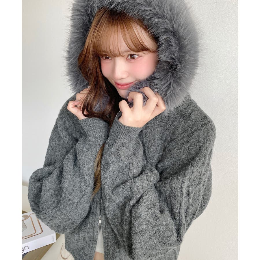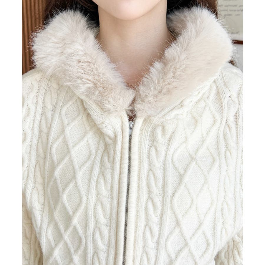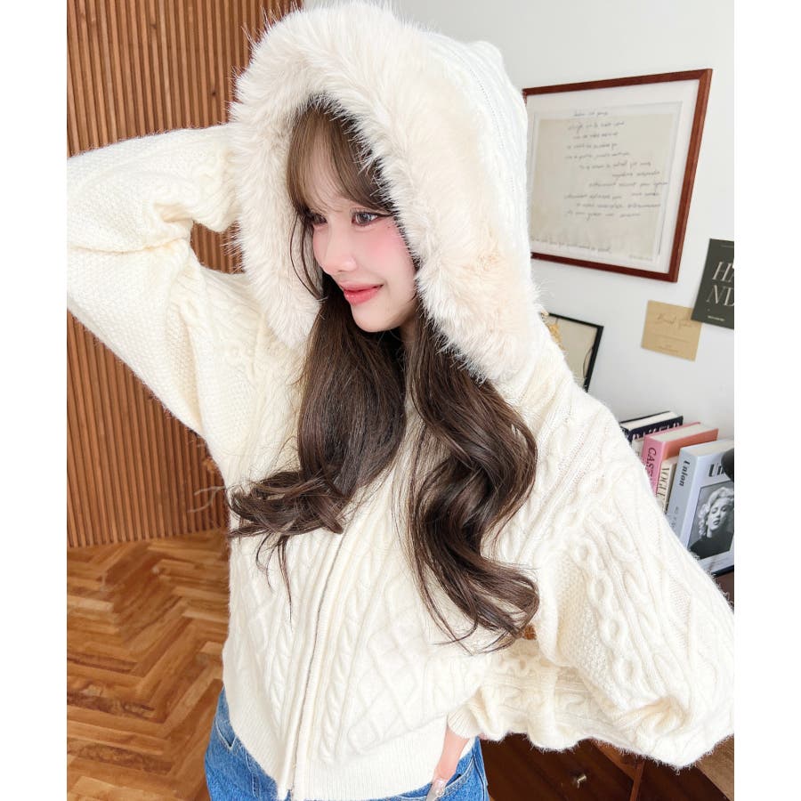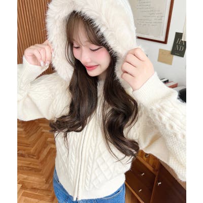 【ざっくりケーブル編みとふわふわファーフードで、冬の主役カーディガン◎】