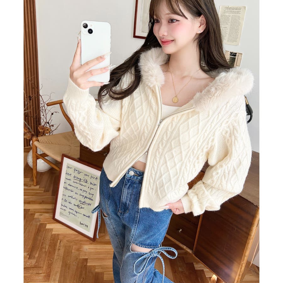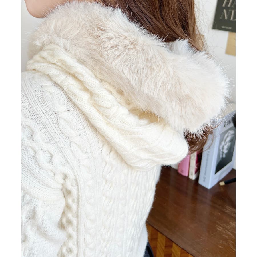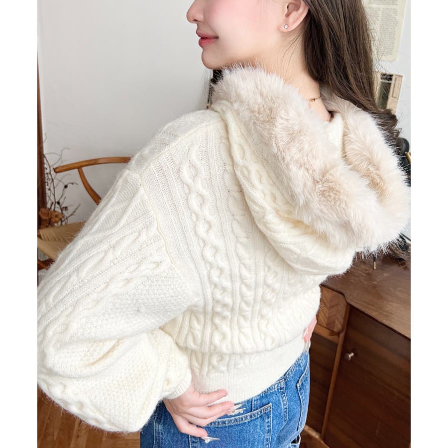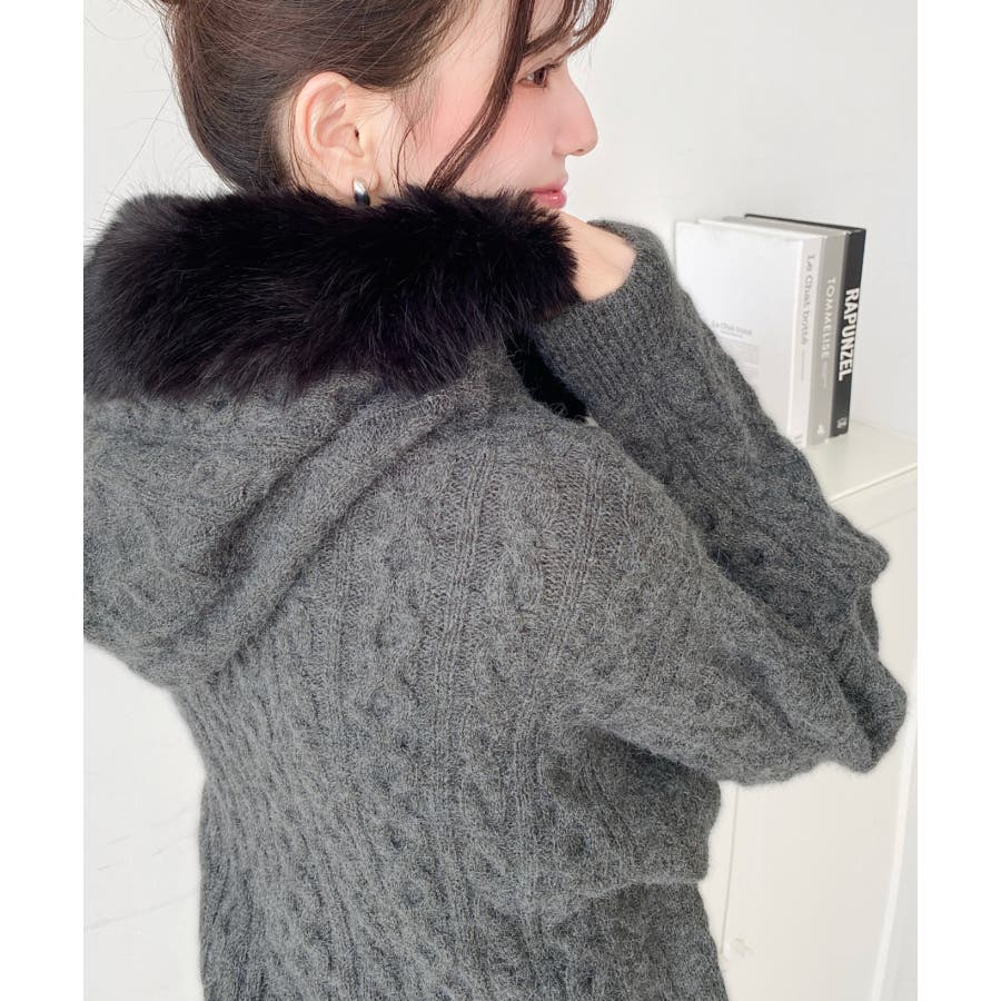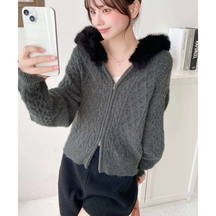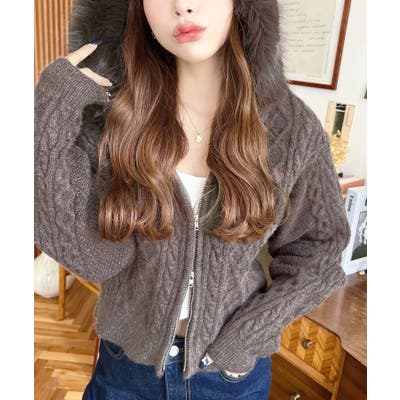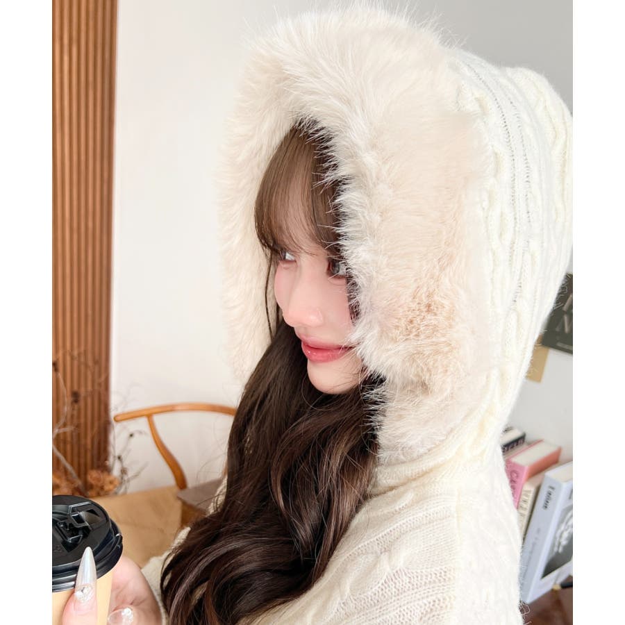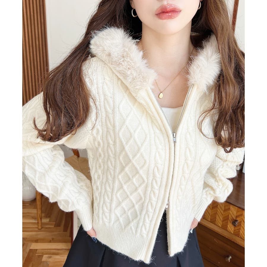 【ざっくりケーブル編みとふわふわファーフードで、冬の主役カーディガン◎】