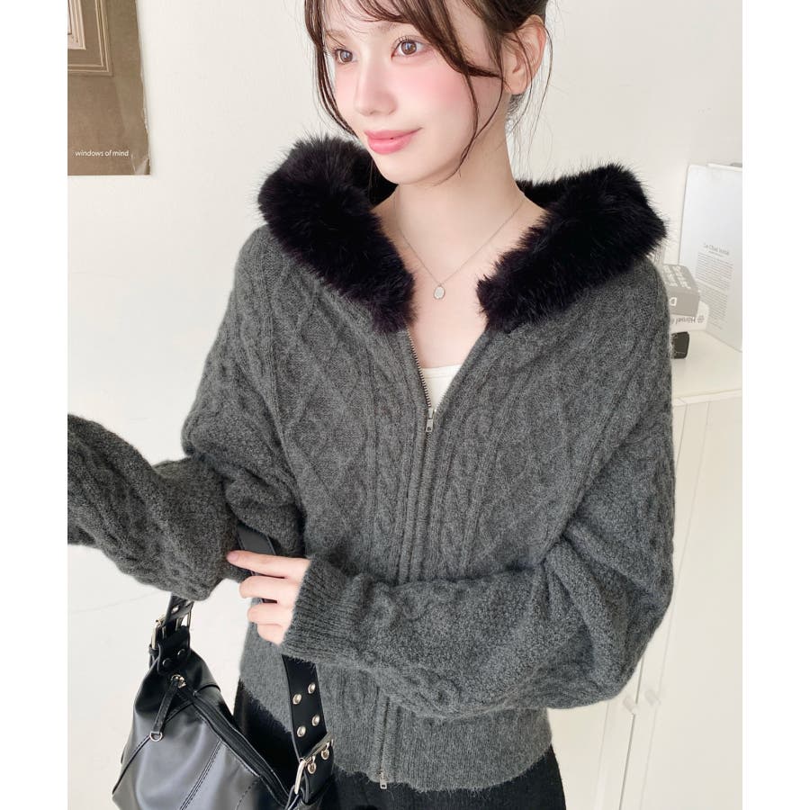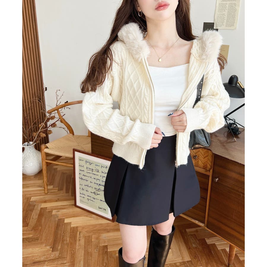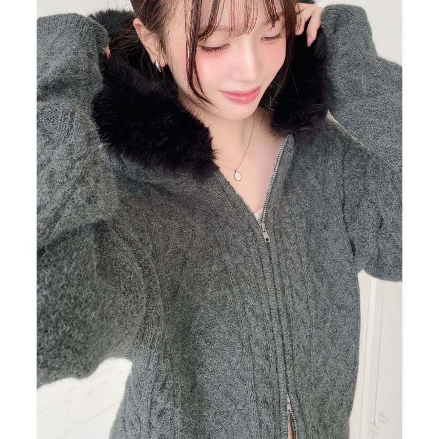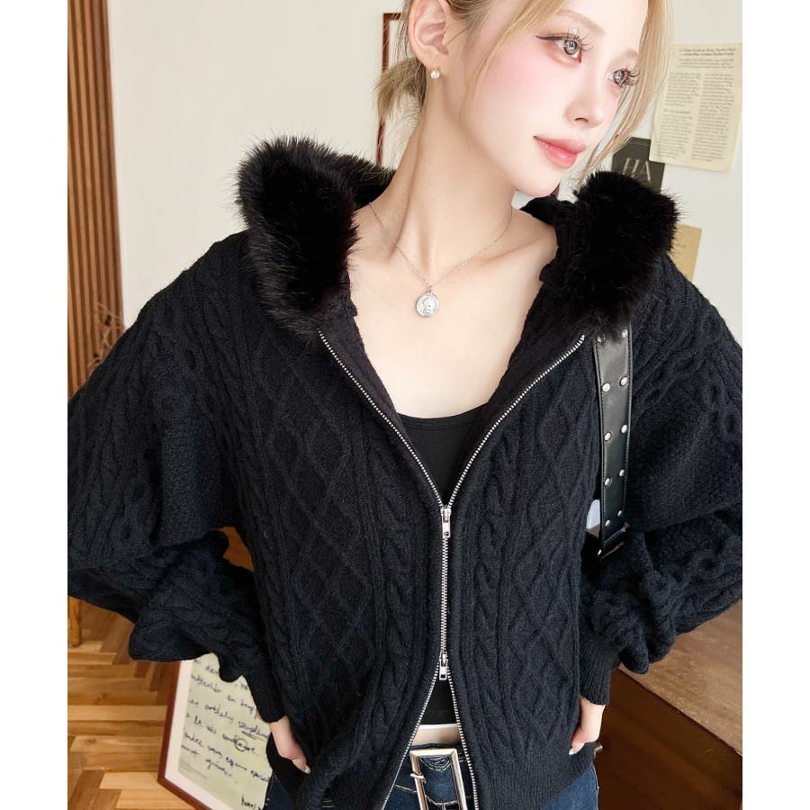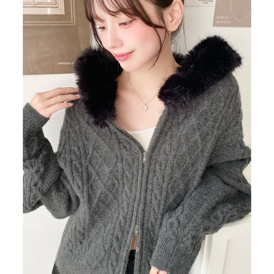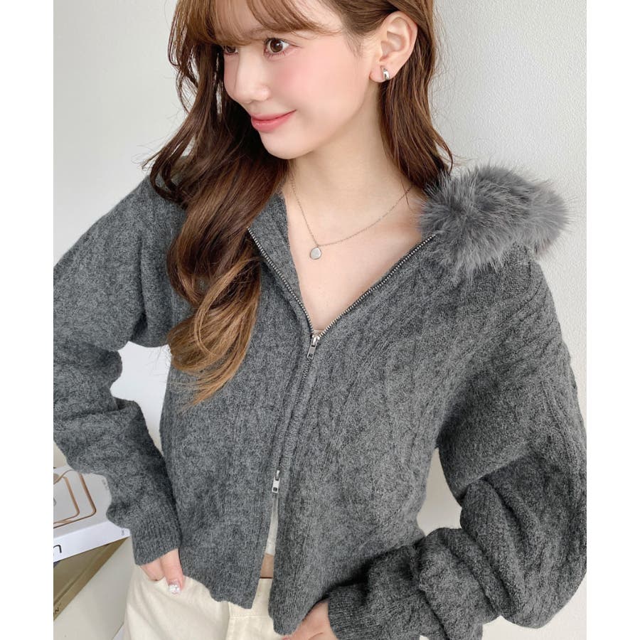 【ざっくりケーブル編みとふわふわファーフードで、冬の主役カーディガン◎】