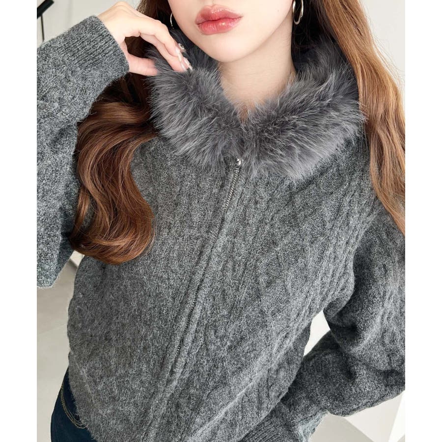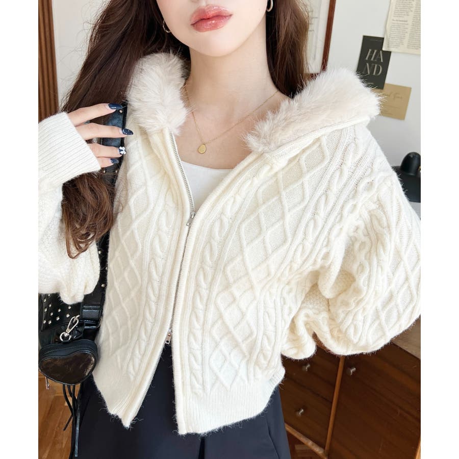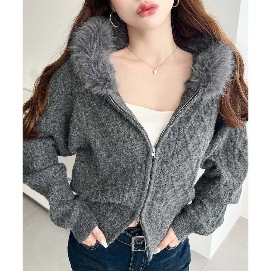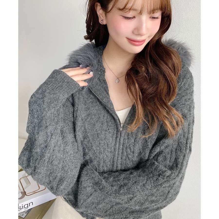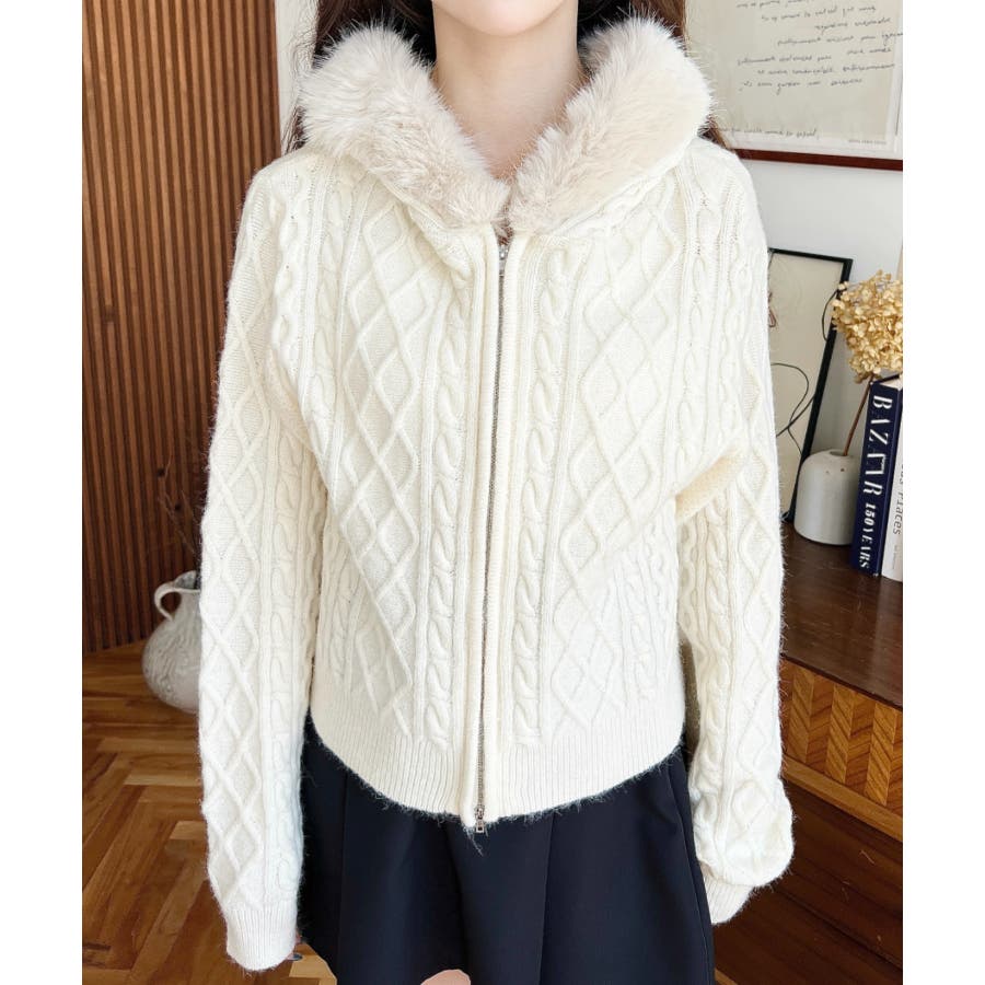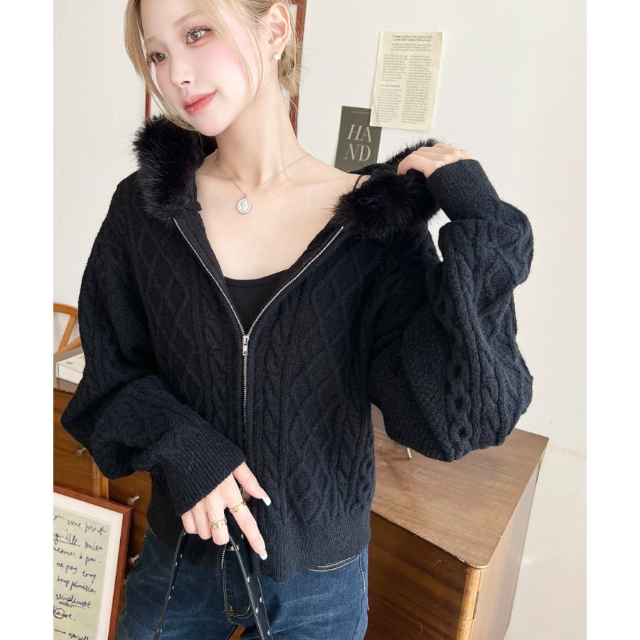 【ざっくりケーブル編みとふわふわファーフードで、冬の主役カーディガン◎】