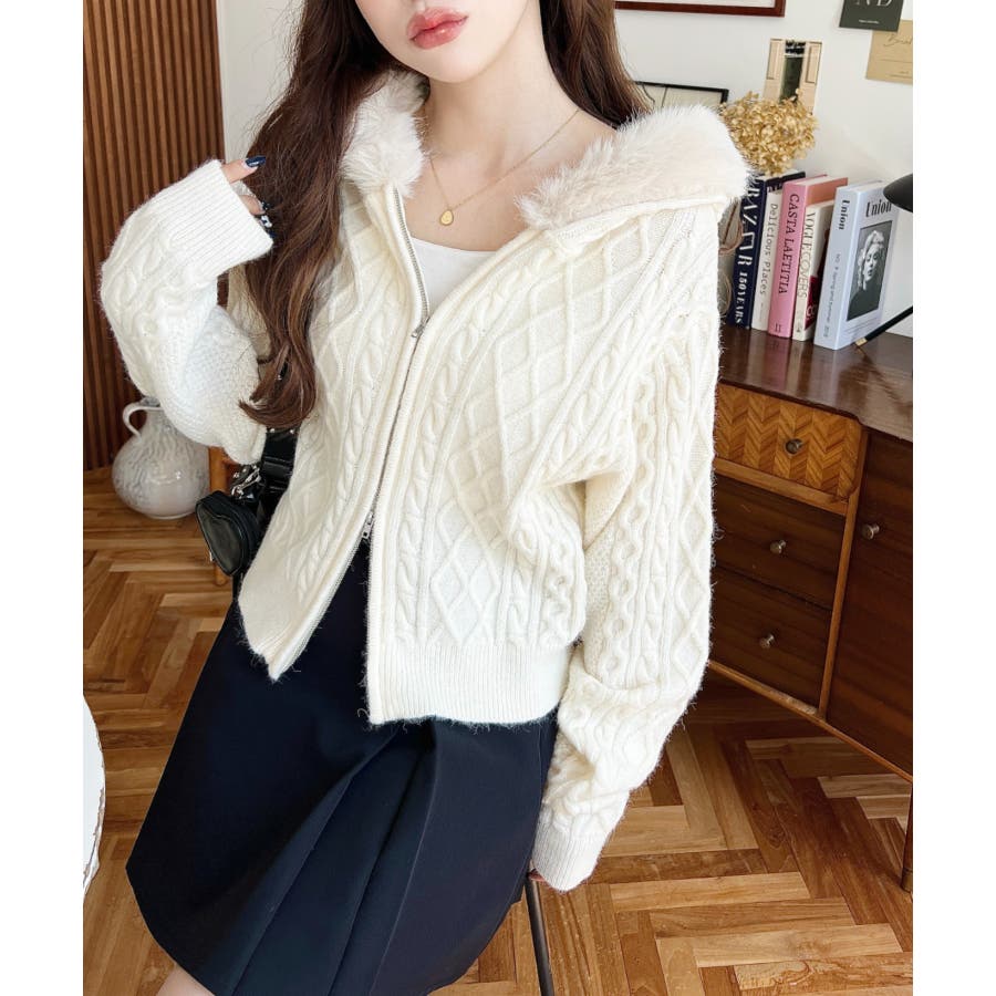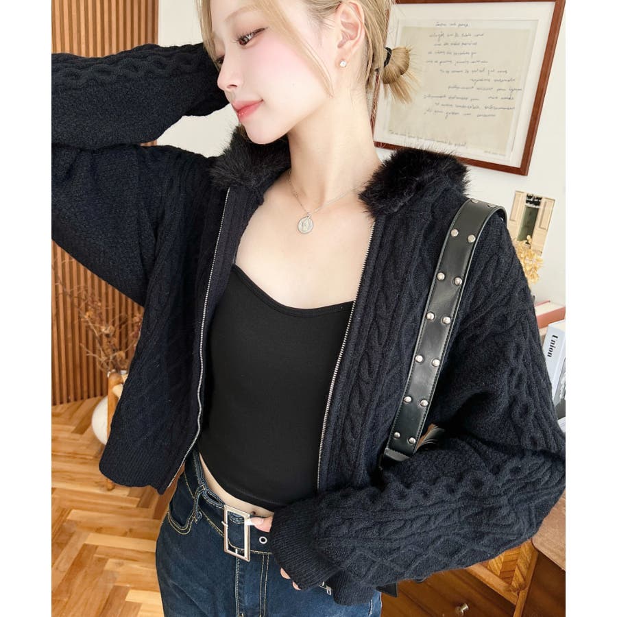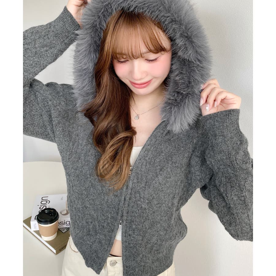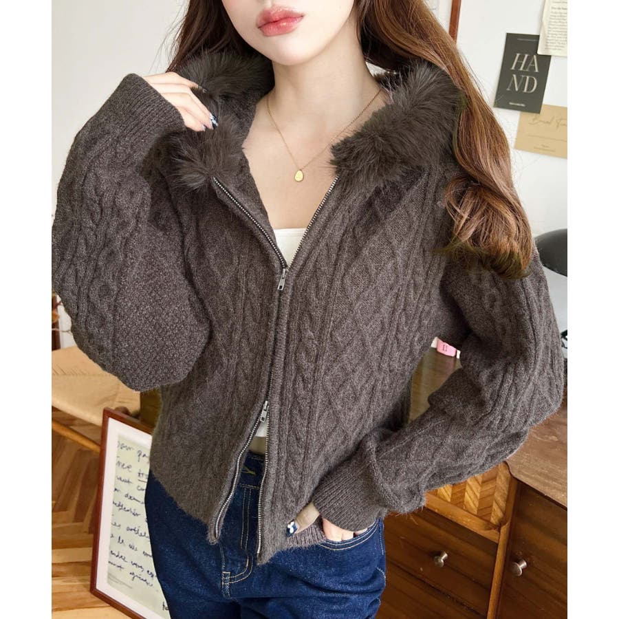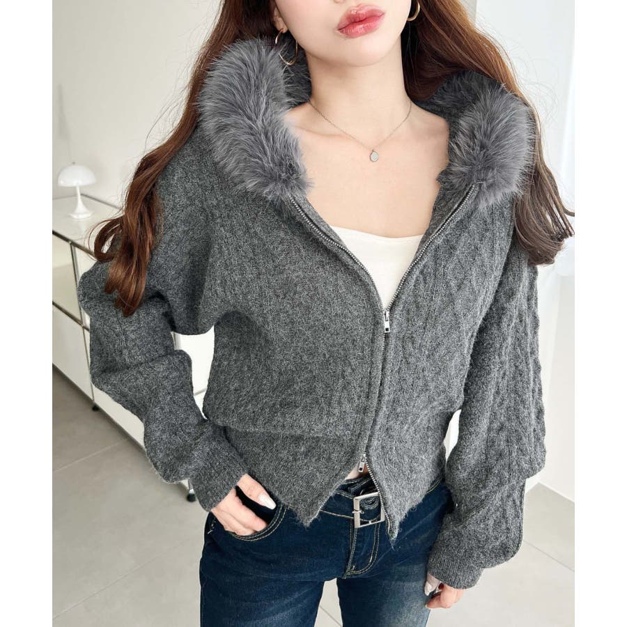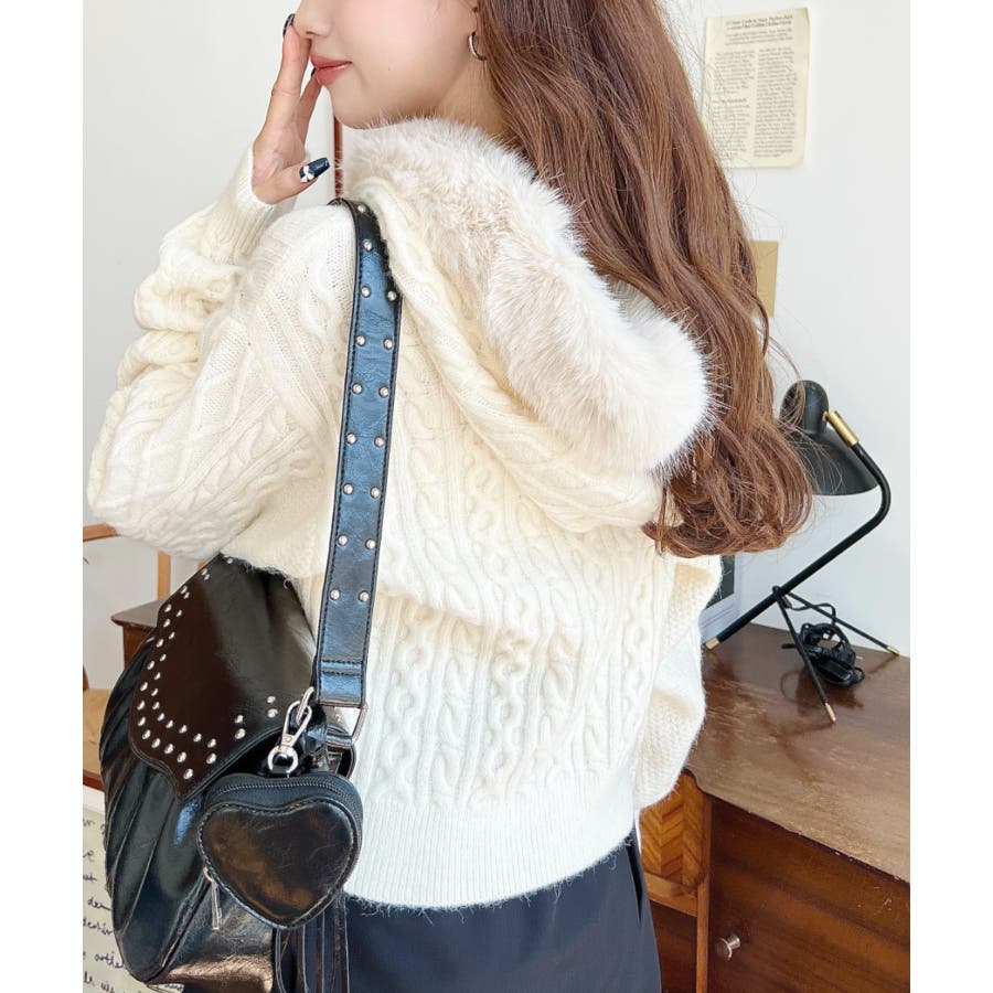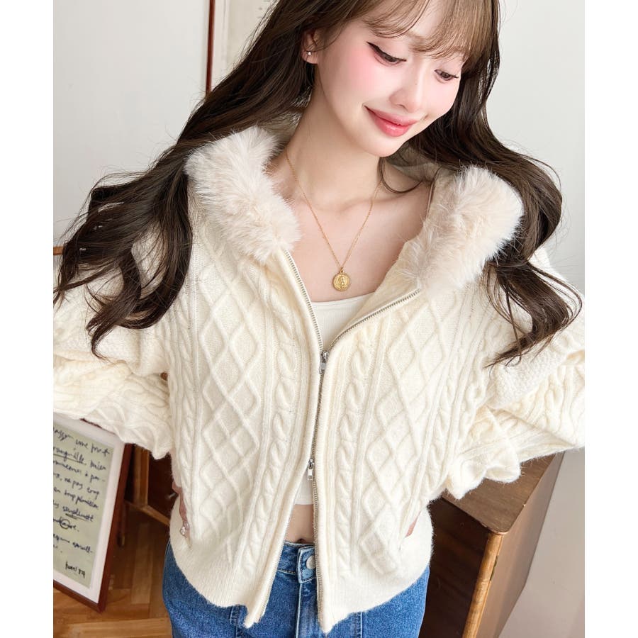 【ざっくりケーブル編みとふわふわファーフードで、冬の主役カーディガン◎】
