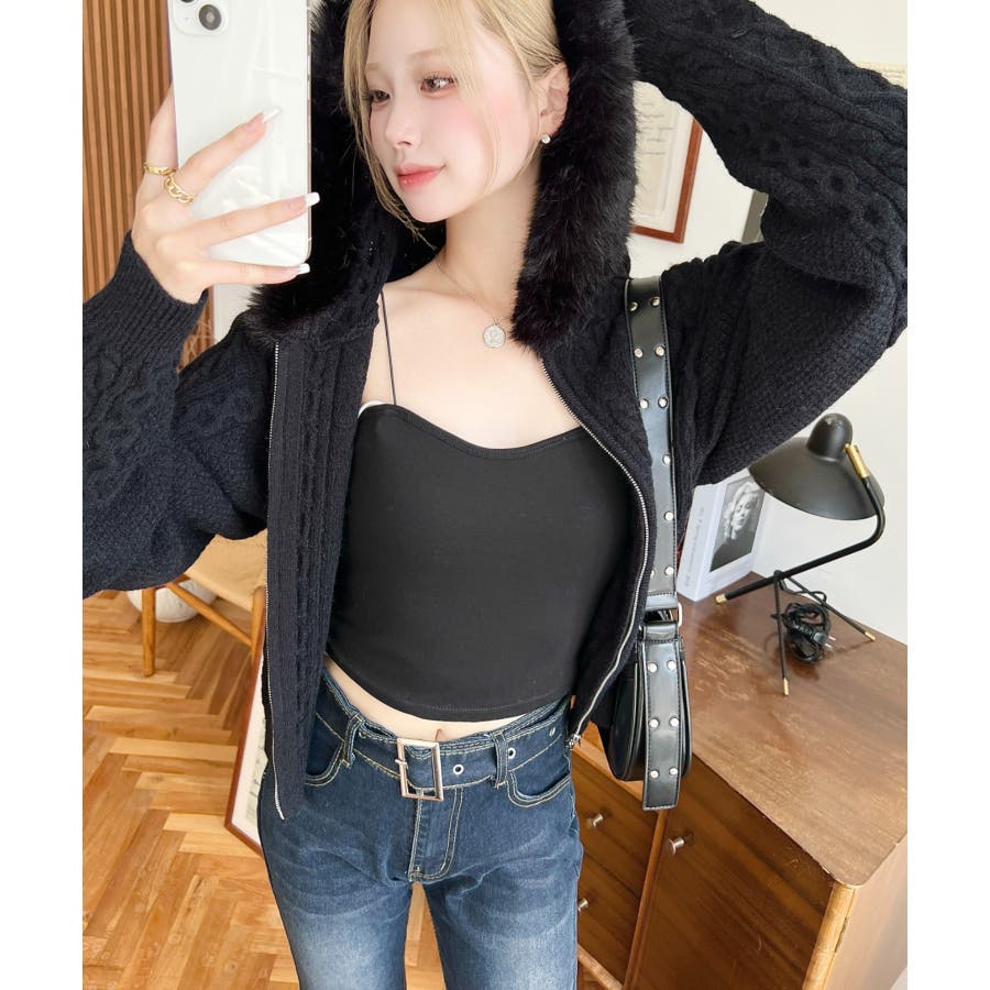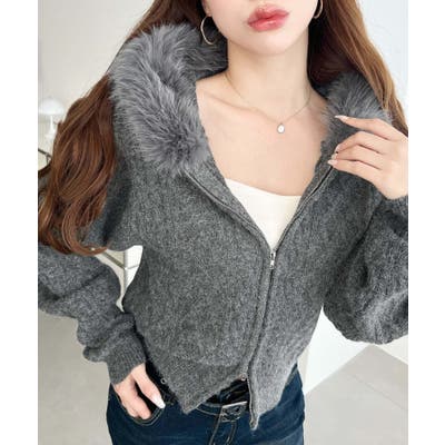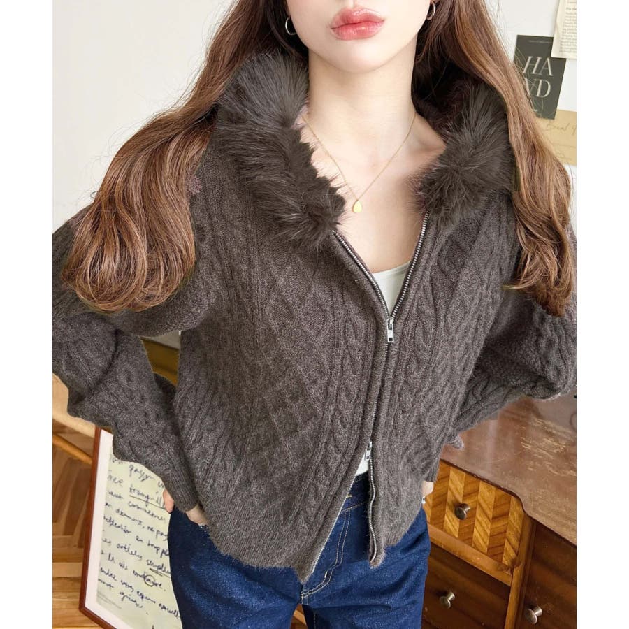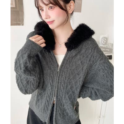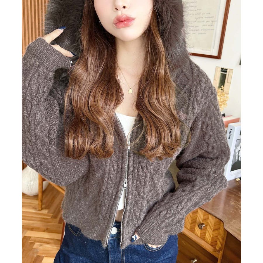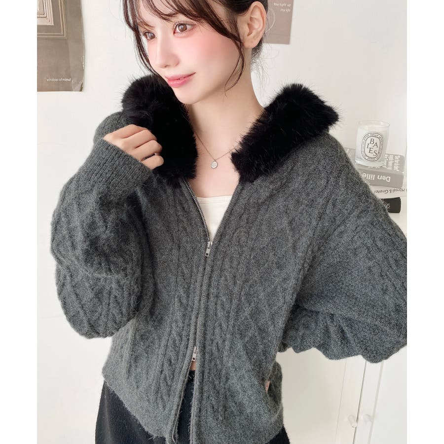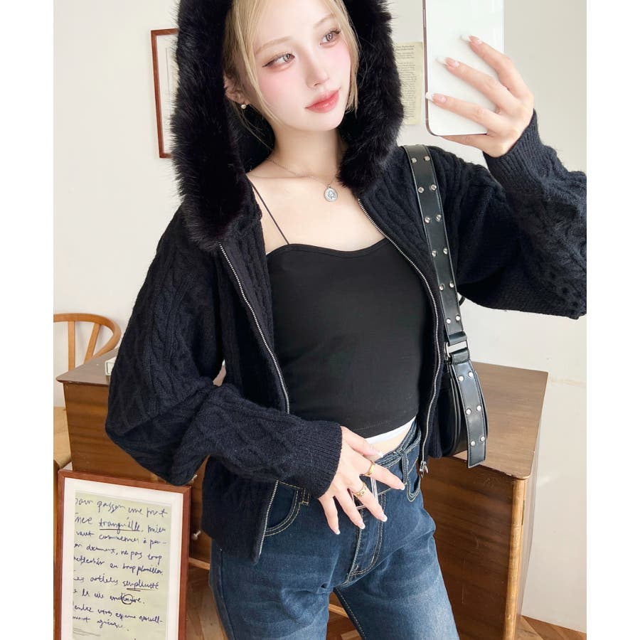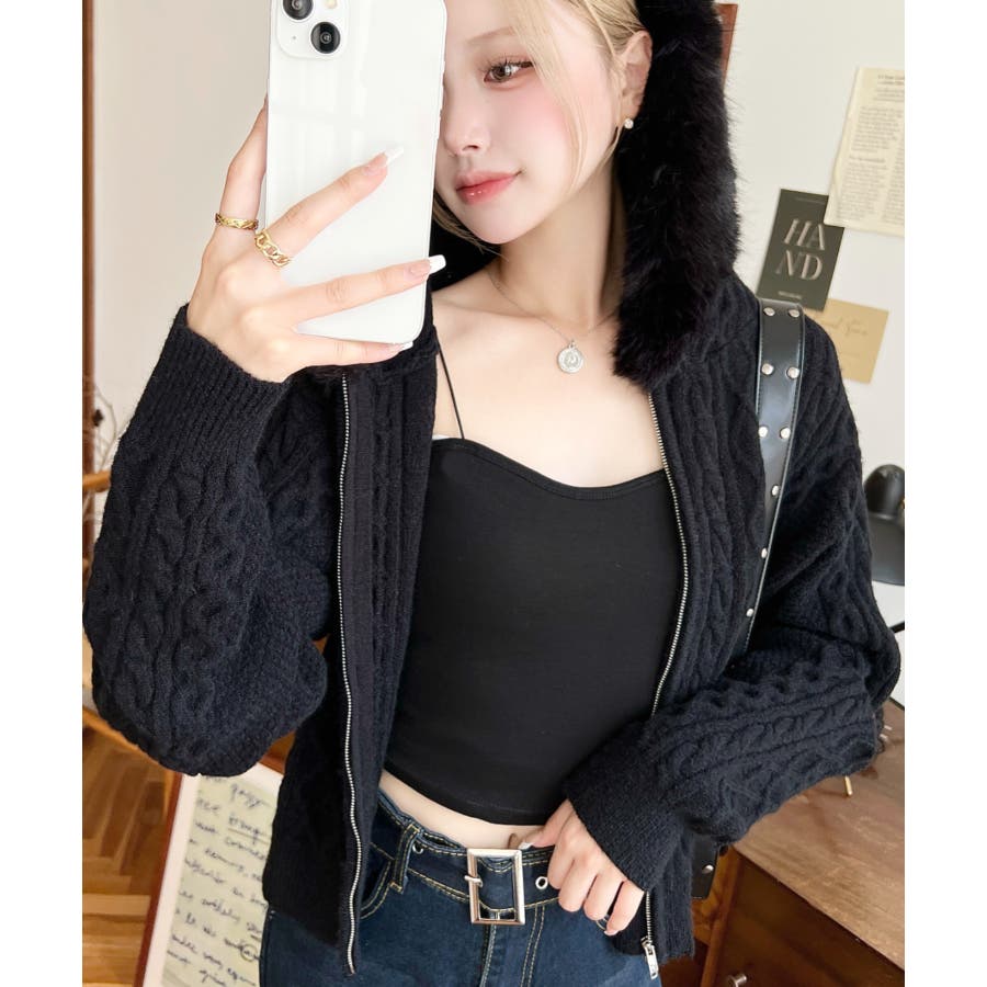 【ざっくりケーブル編みとふわふわファーフードで、冬の主役カーディガン◎】