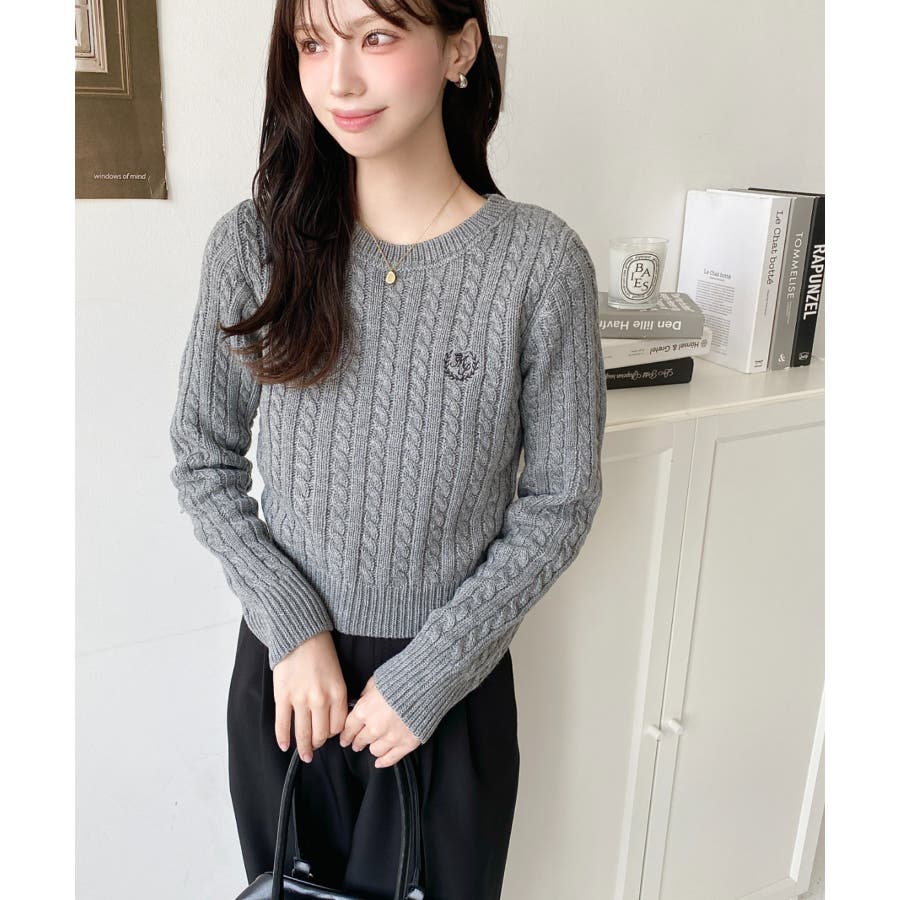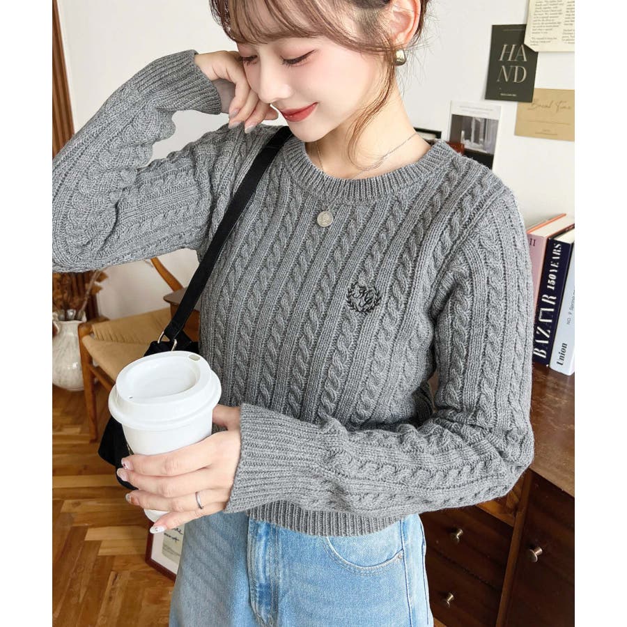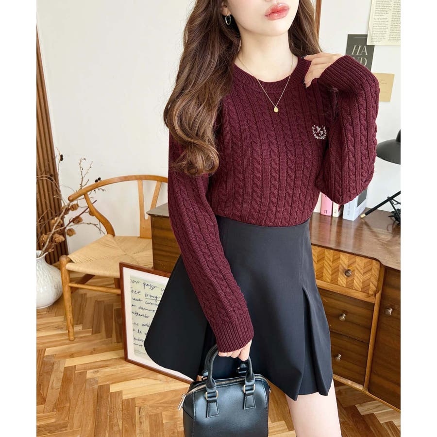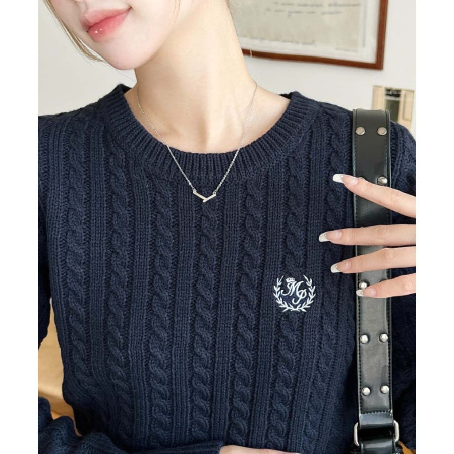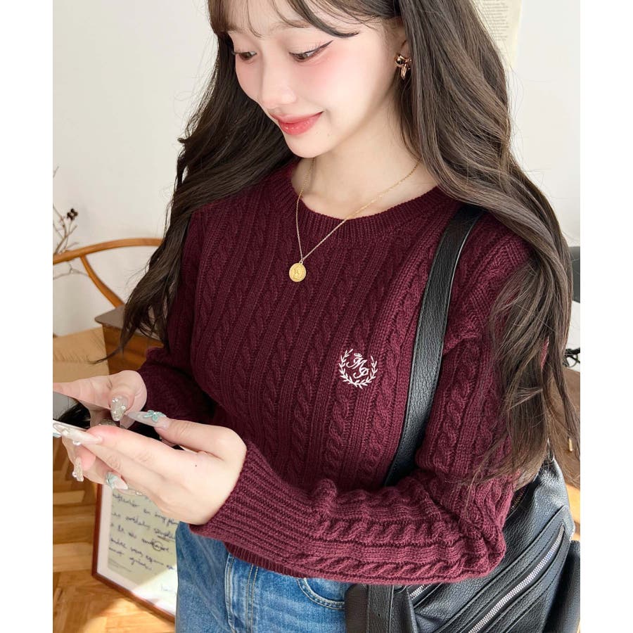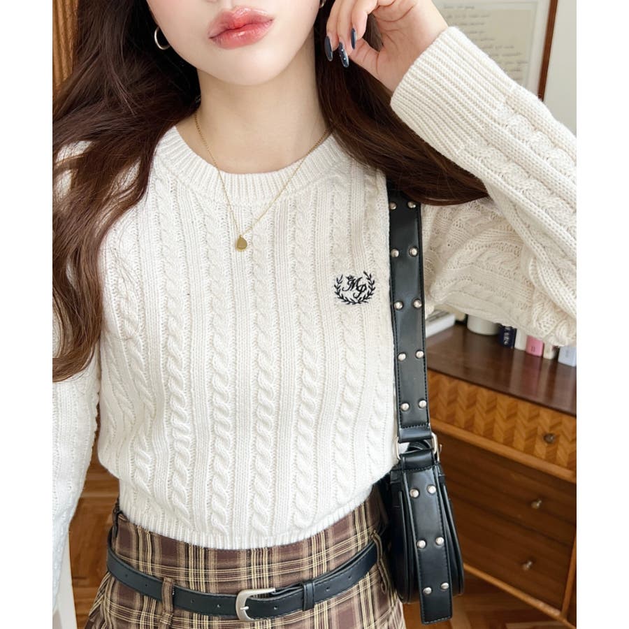 ・立体感のあるケーブル編みが存在感を放ちながらも、胸元の小さな刺繍が程よい抜け感をプラス