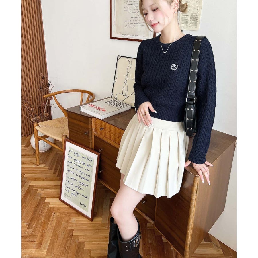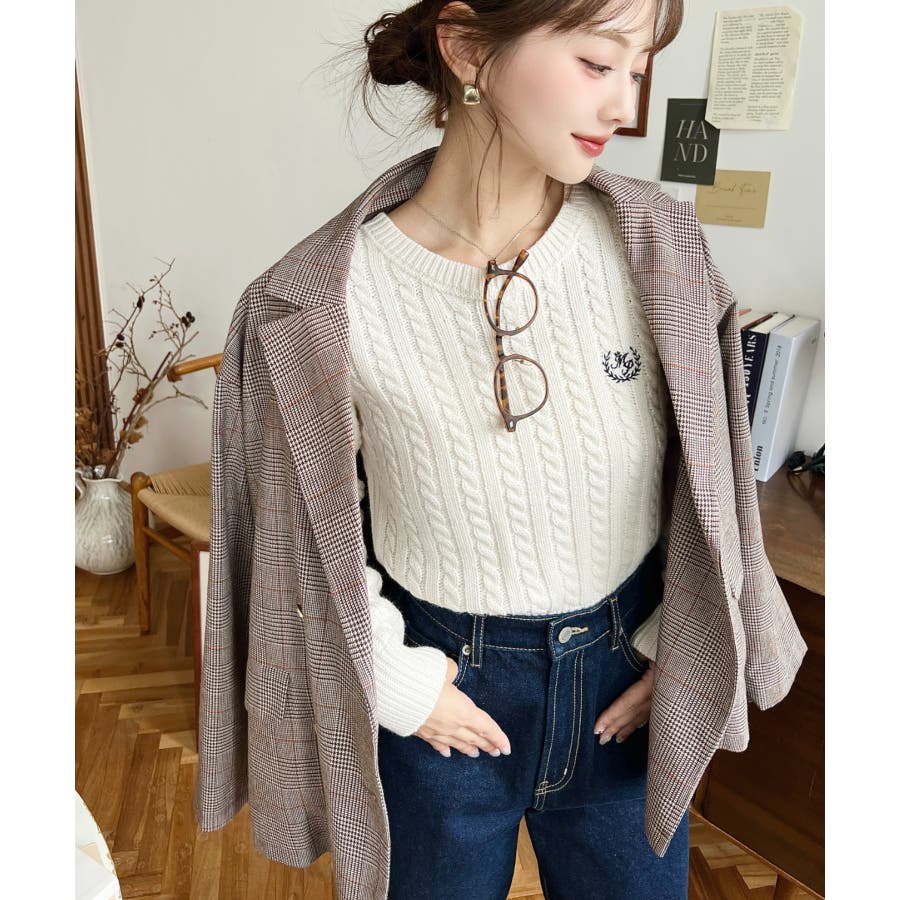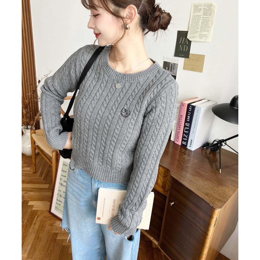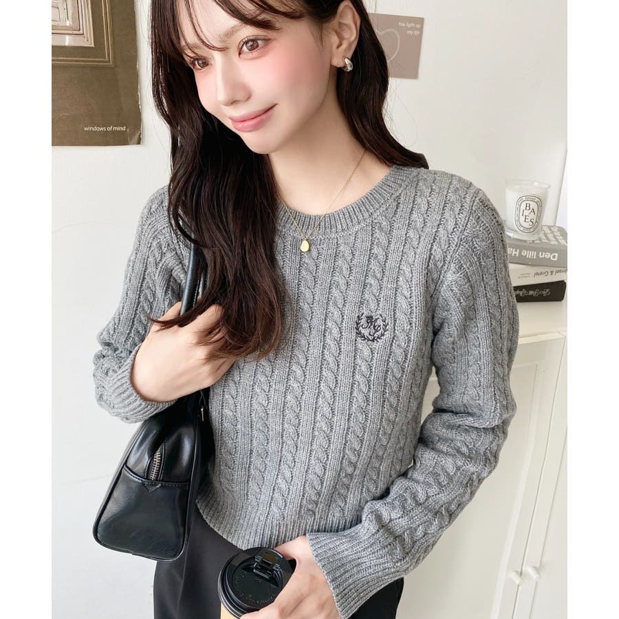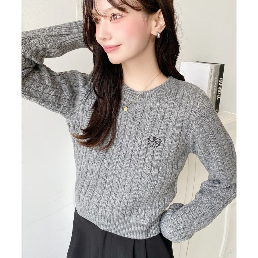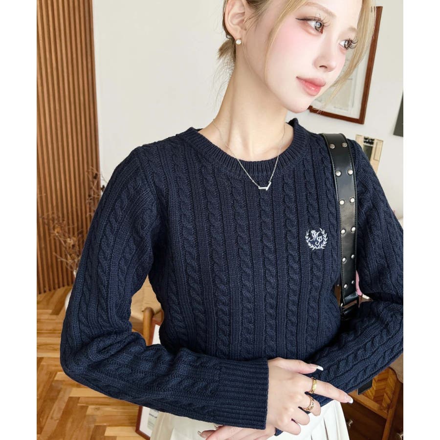 ・立体感のあるケーブル編みが存在感を放ちながらも、胸元の小さな刺繍が程よい抜け感をプラス