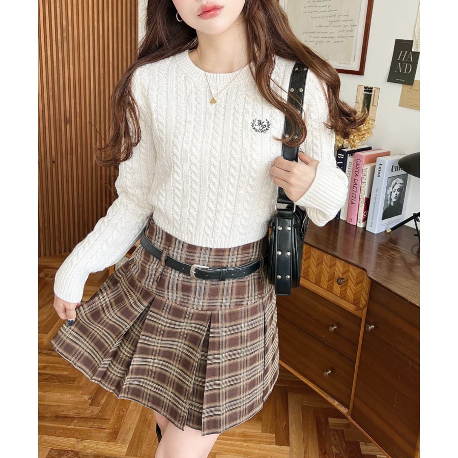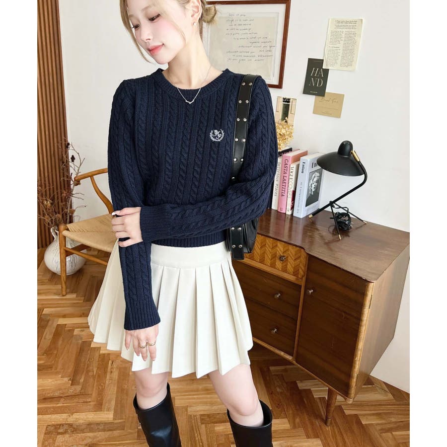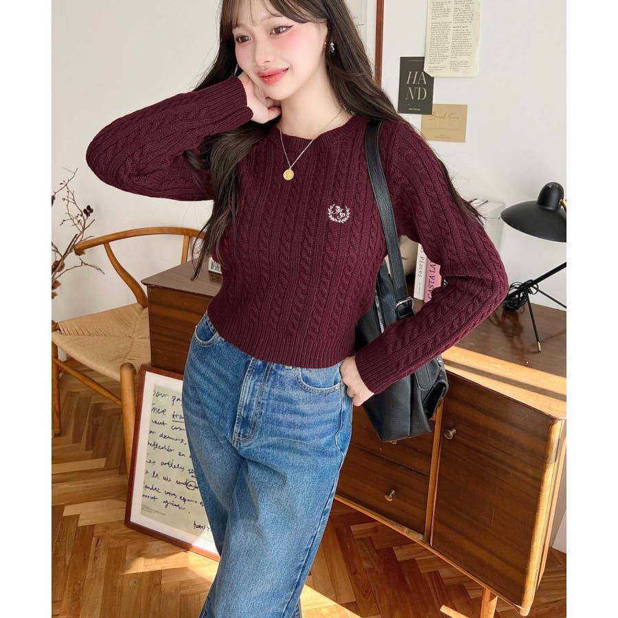 刺繍入りケーブルショート丈ニットプルオーバー