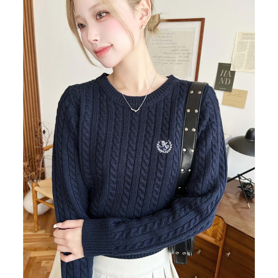 ケーブル編みだけじゃなくて、胸元のワンポイントのロゴがさりげなくて可愛いです♪