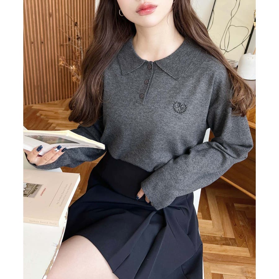 【チャコールグレー】ワンポイント刺繍入り衿付きポロニット12G