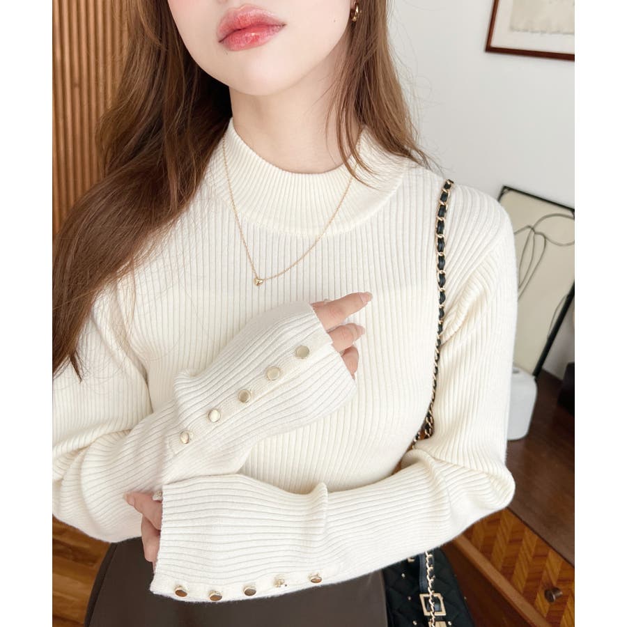 袖口ボタンボトルネックリブニットプルオーバー12G