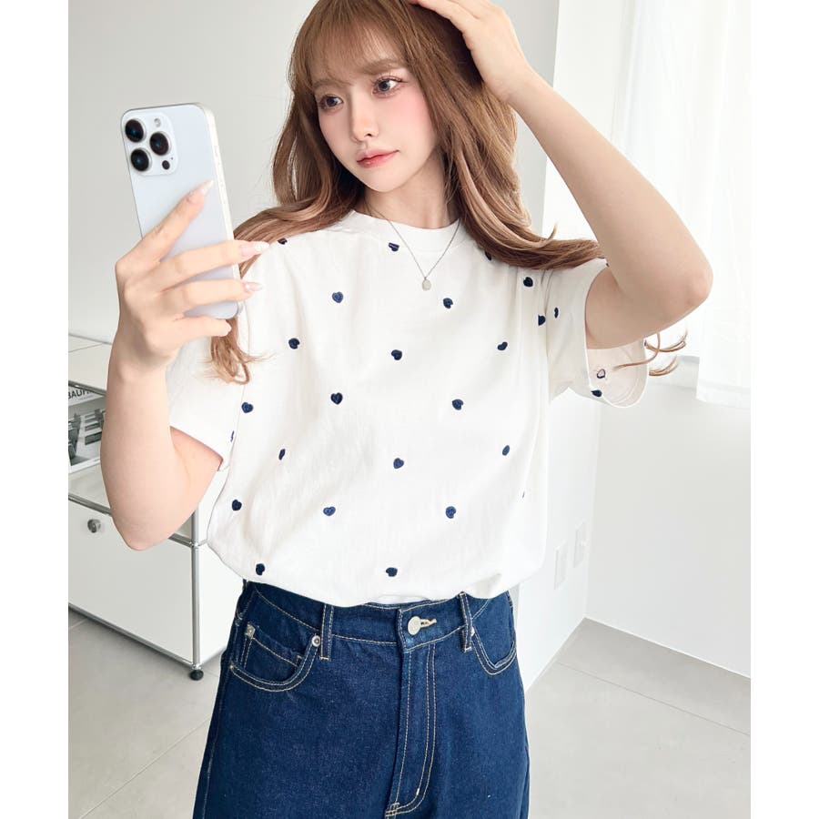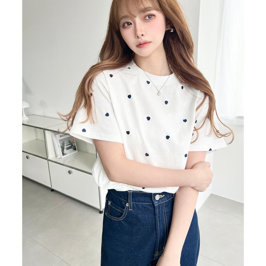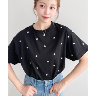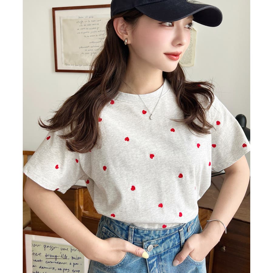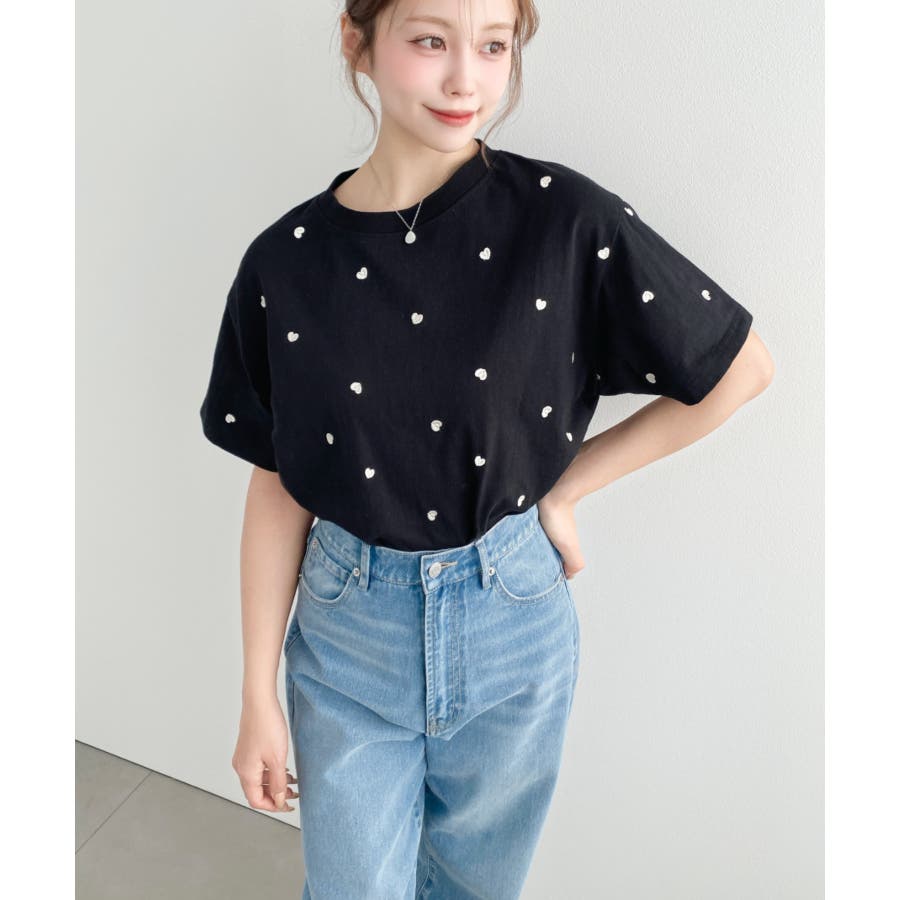 ・定番トレンドのハート柄がランダムに施された刺繍が可愛さ◎の半袖Tシャツ。