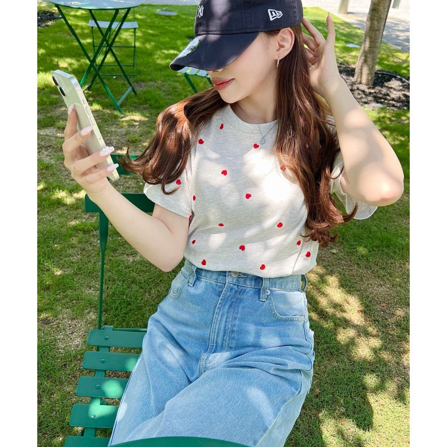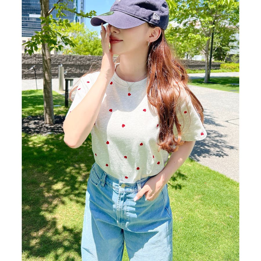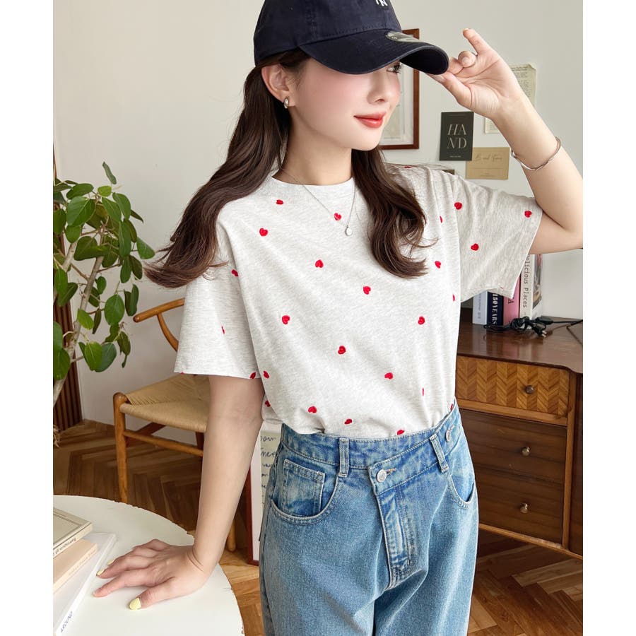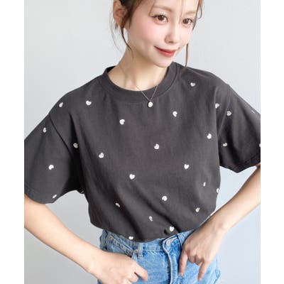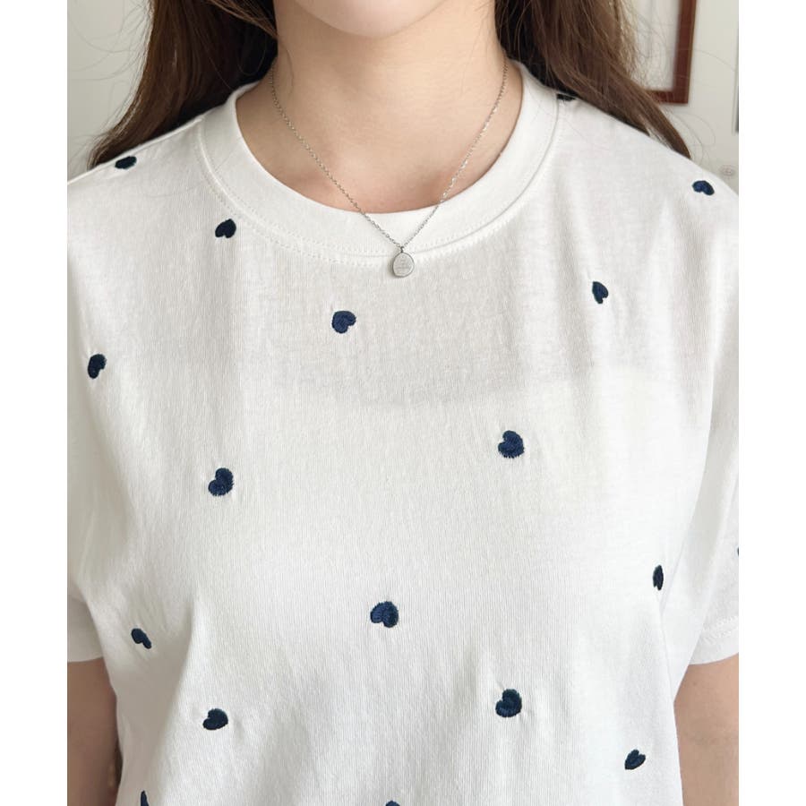 ・定番トレンドのハート柄がランダムに施された刺繍が可愛さ◎の半袖Tシャツ。