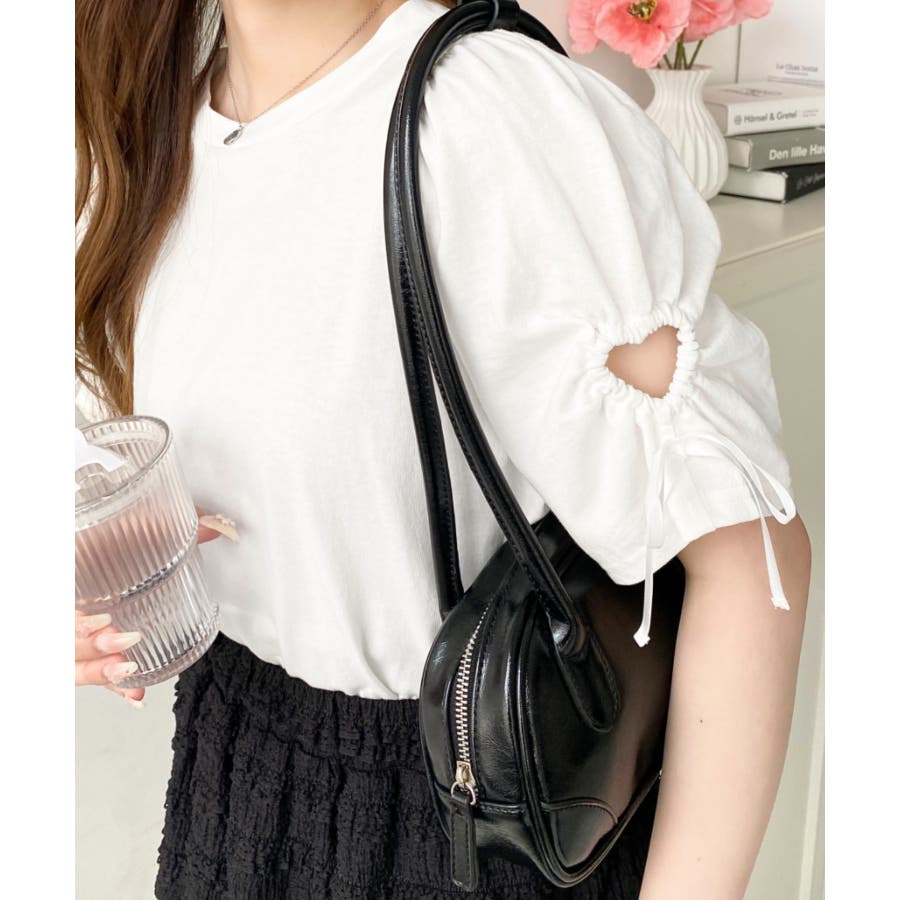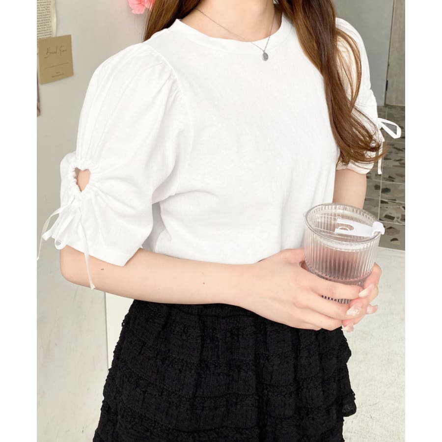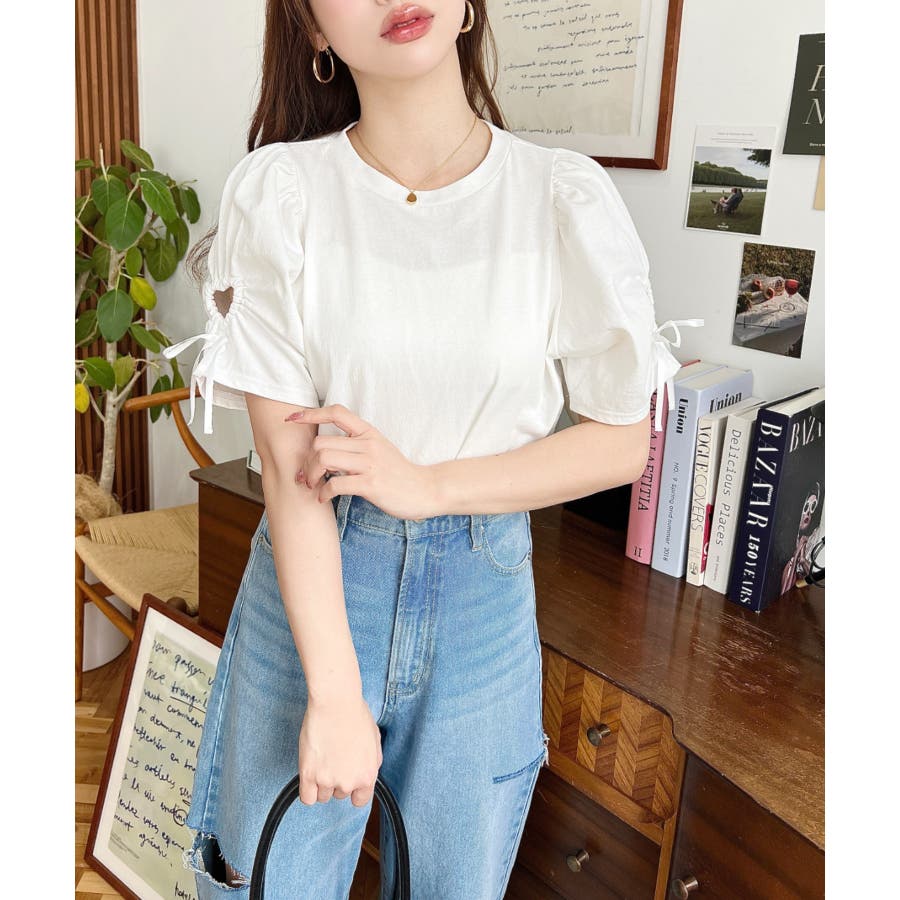 ・パフスリーブにハートのくり抜きデザインがフェミニン要素たっぷりで可愛い半袖Tシャツ◎