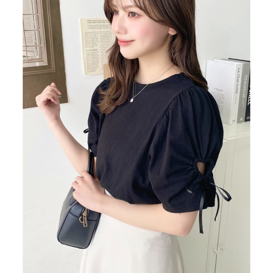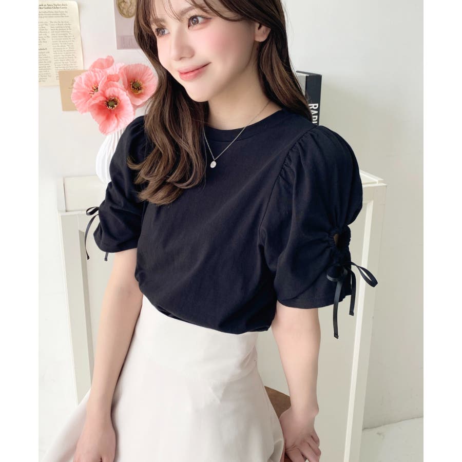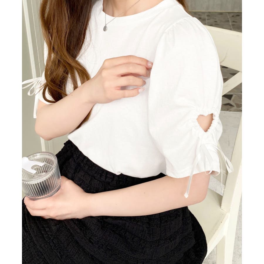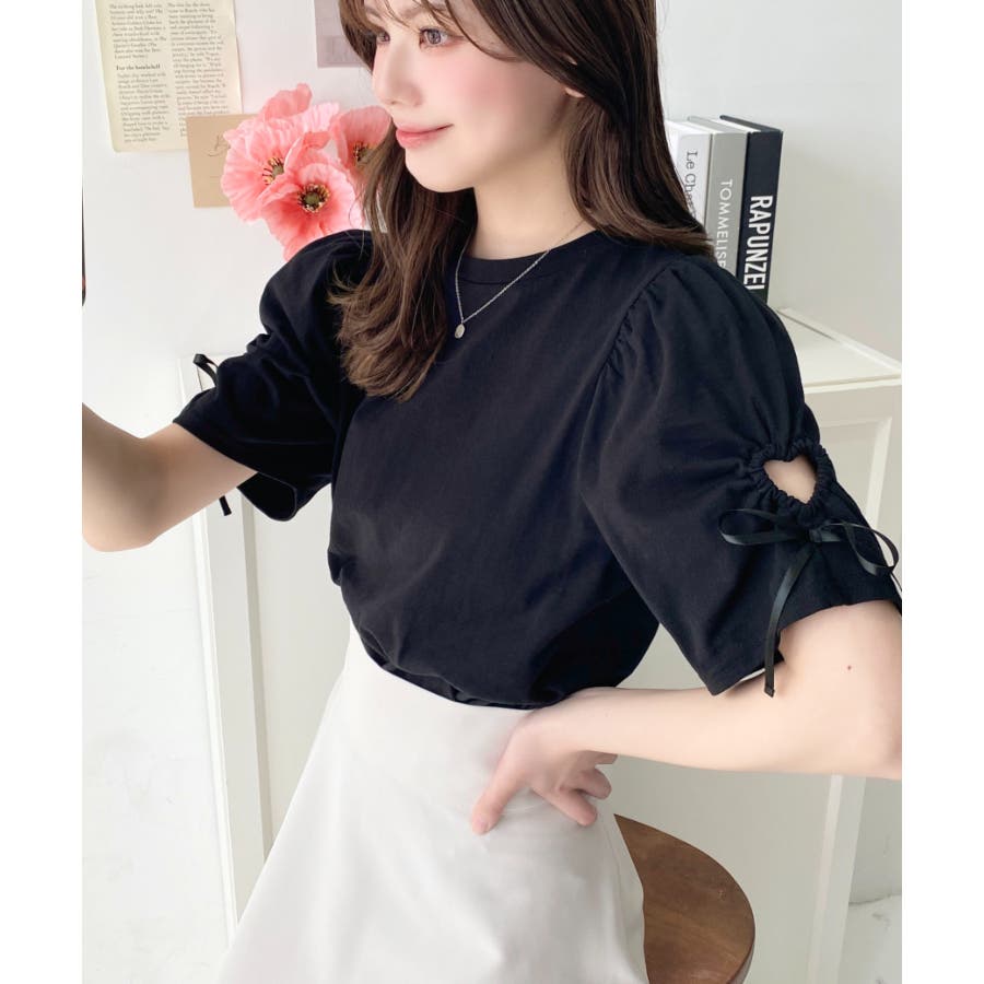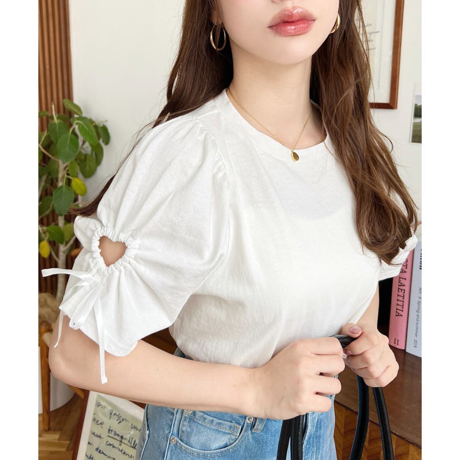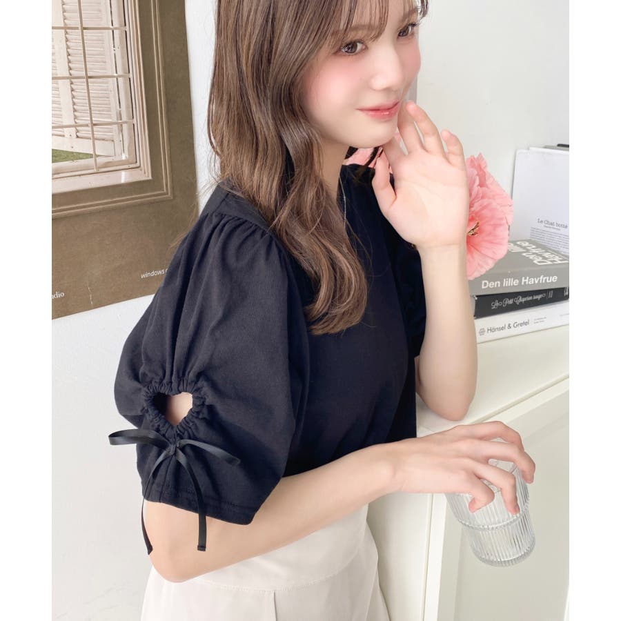 袖のハートホールとリボンのディテールが可愛らしいアクセントになっていて、シンプルなボトムに合わせるだけでも女の子らしい雰囲気になります◎