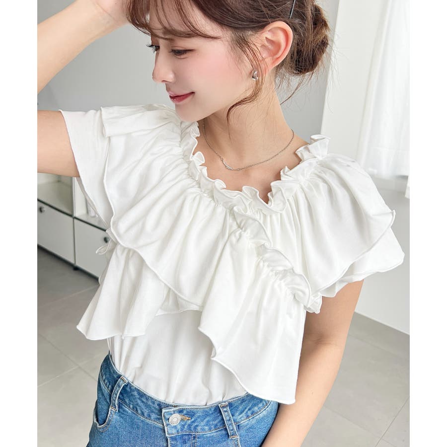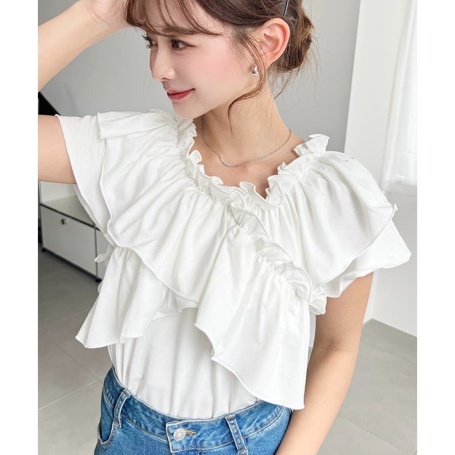 ・ゆるやかなフリルが大きくデザインされた、春のフェミニンコーデには欠かせないトップスです!