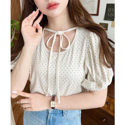 ・ドット柄と首元のリボンが女性らしく一枚でトレンド感のあるガーリーな印象に♪