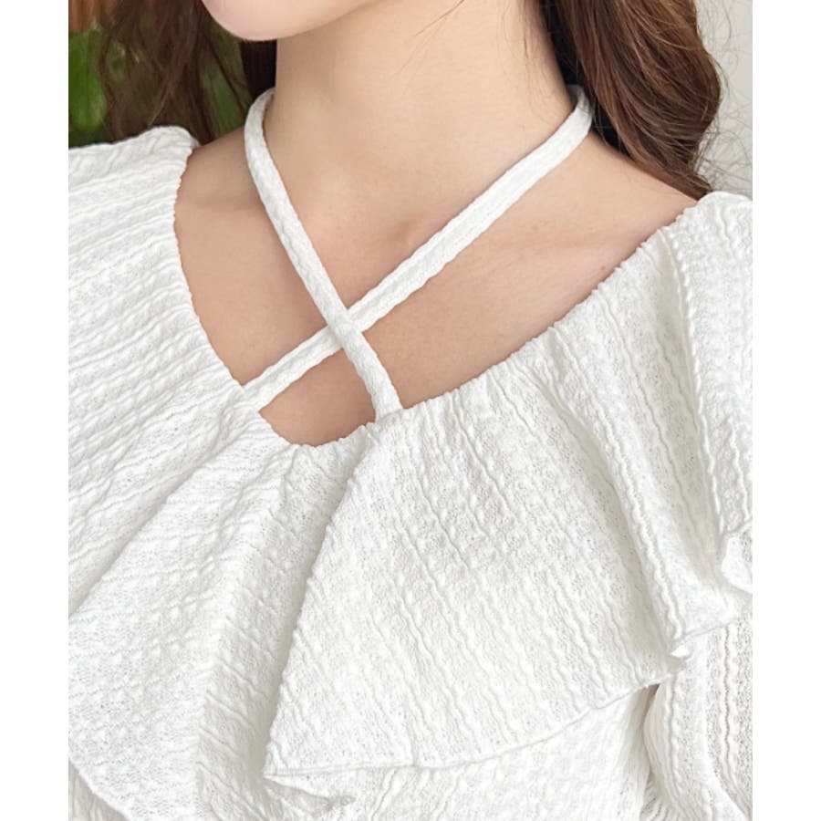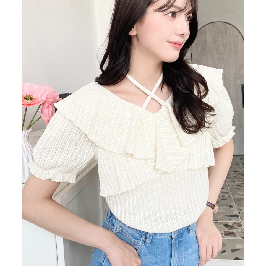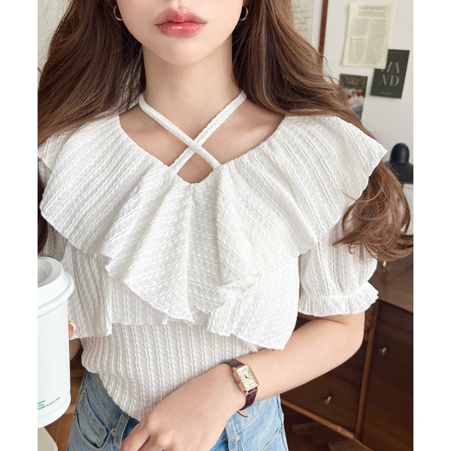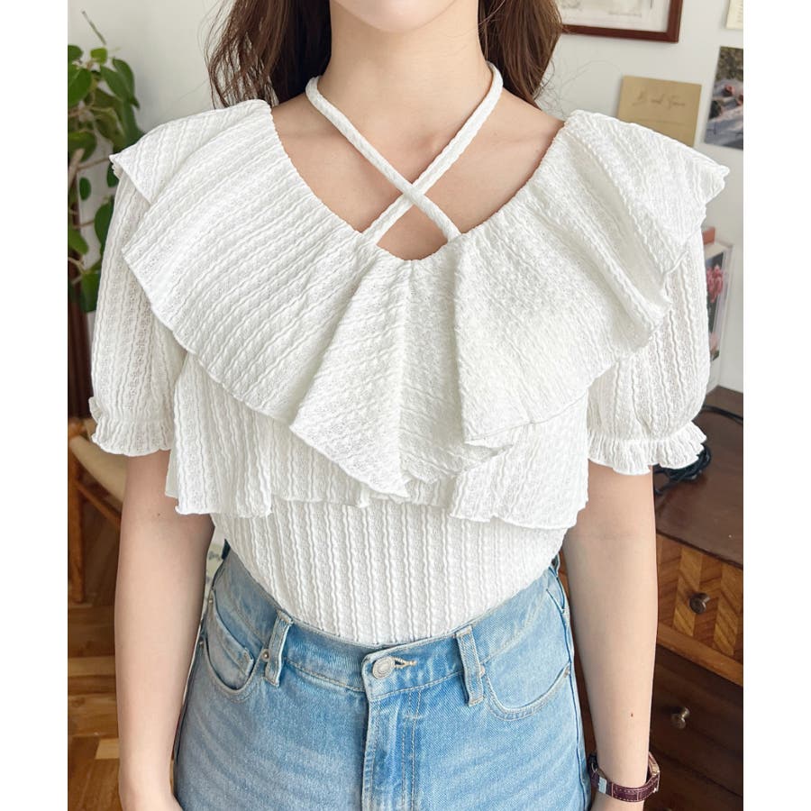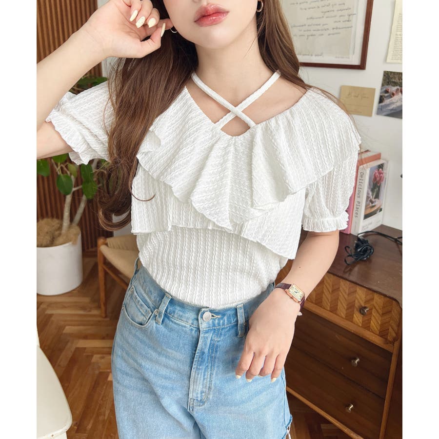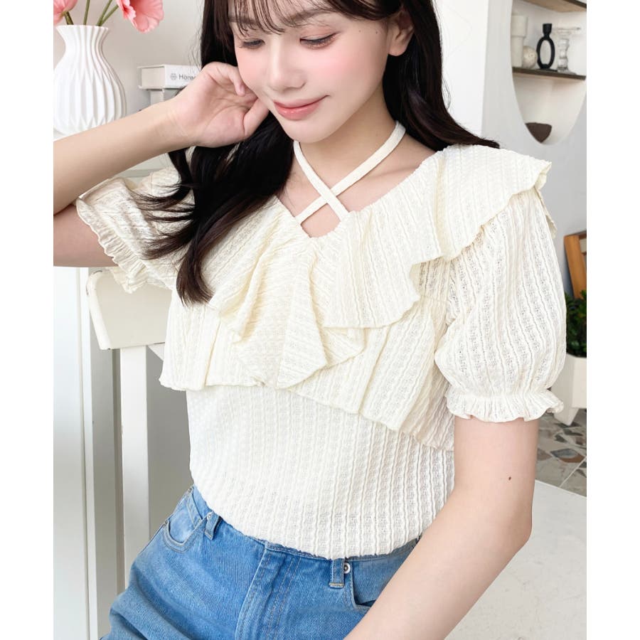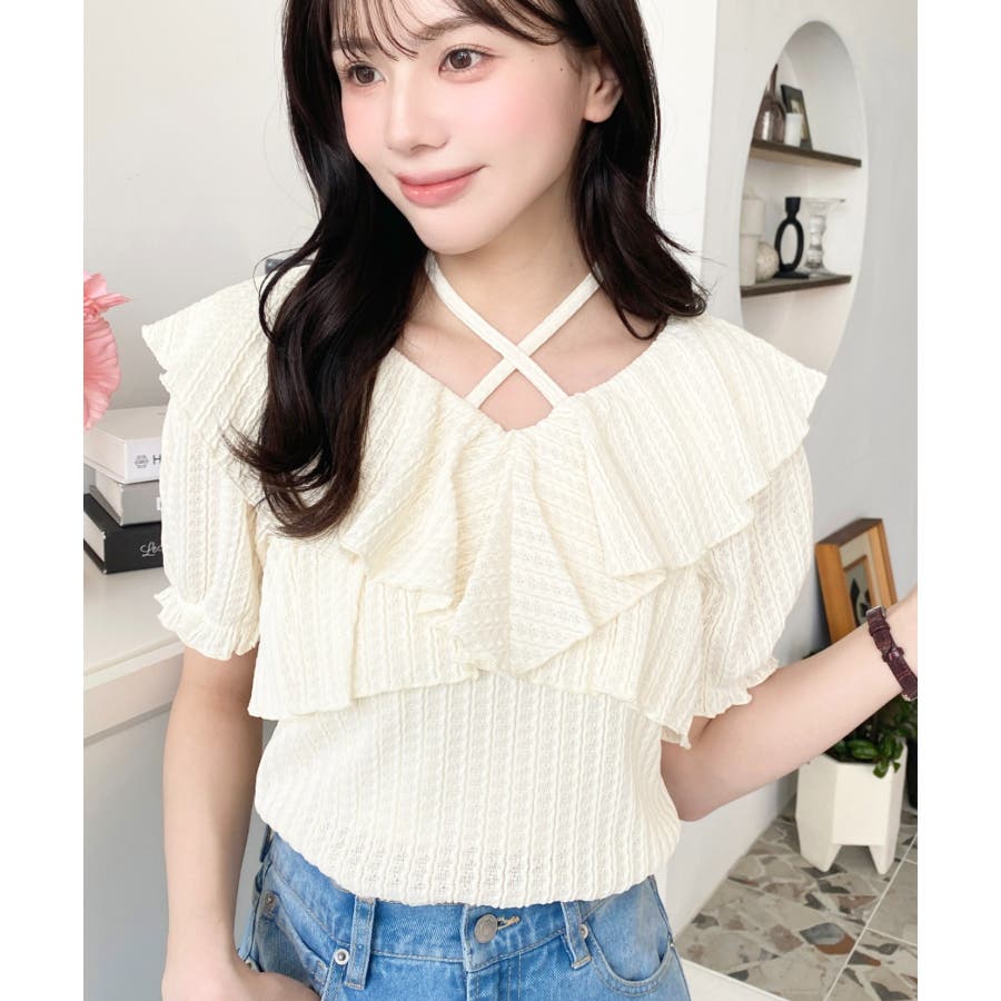 細かいストライプレースと大振りなフリル、クロスホルターネックがコーデに抜け感が出ます◎