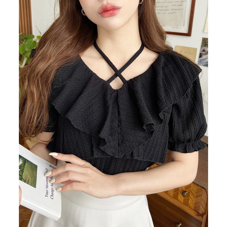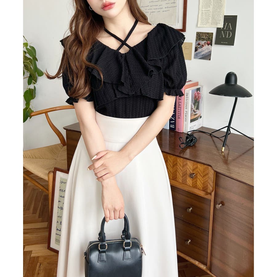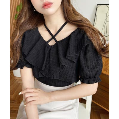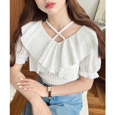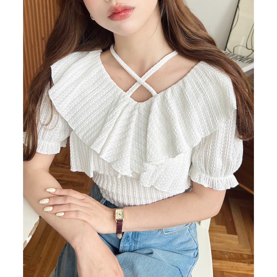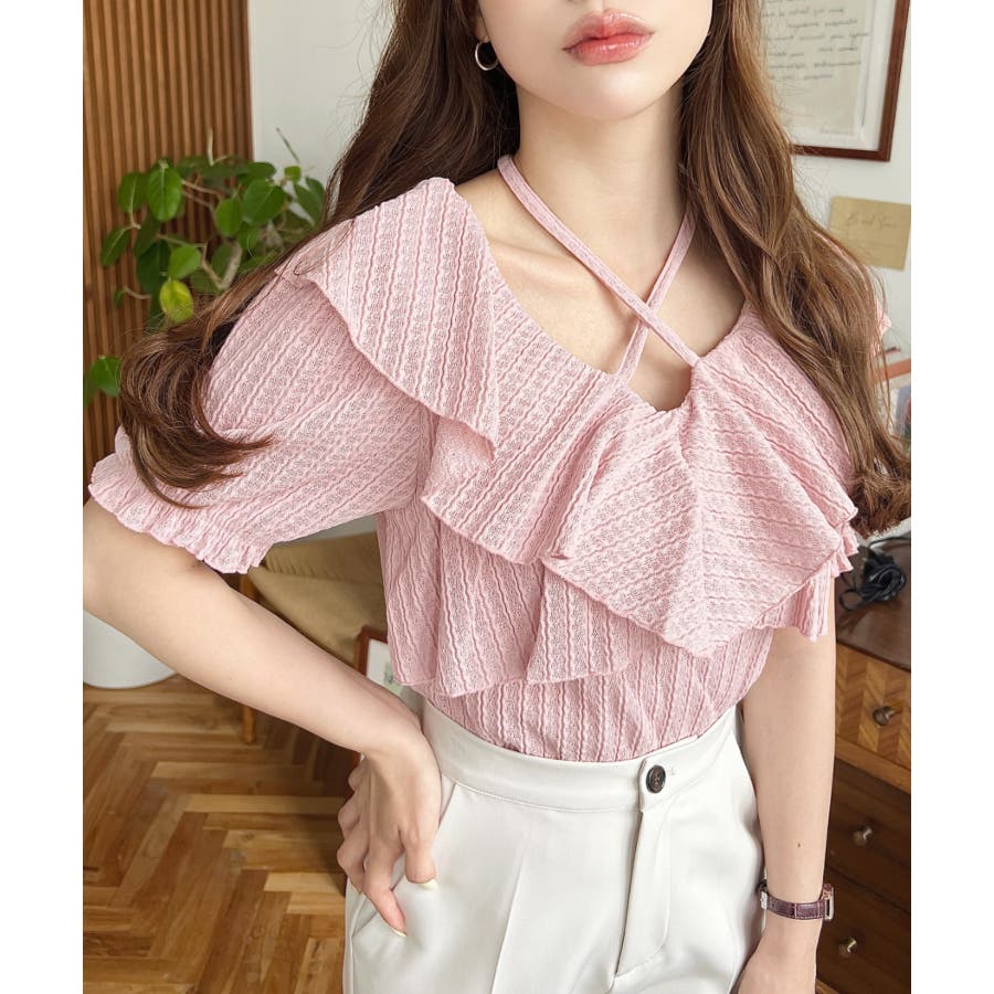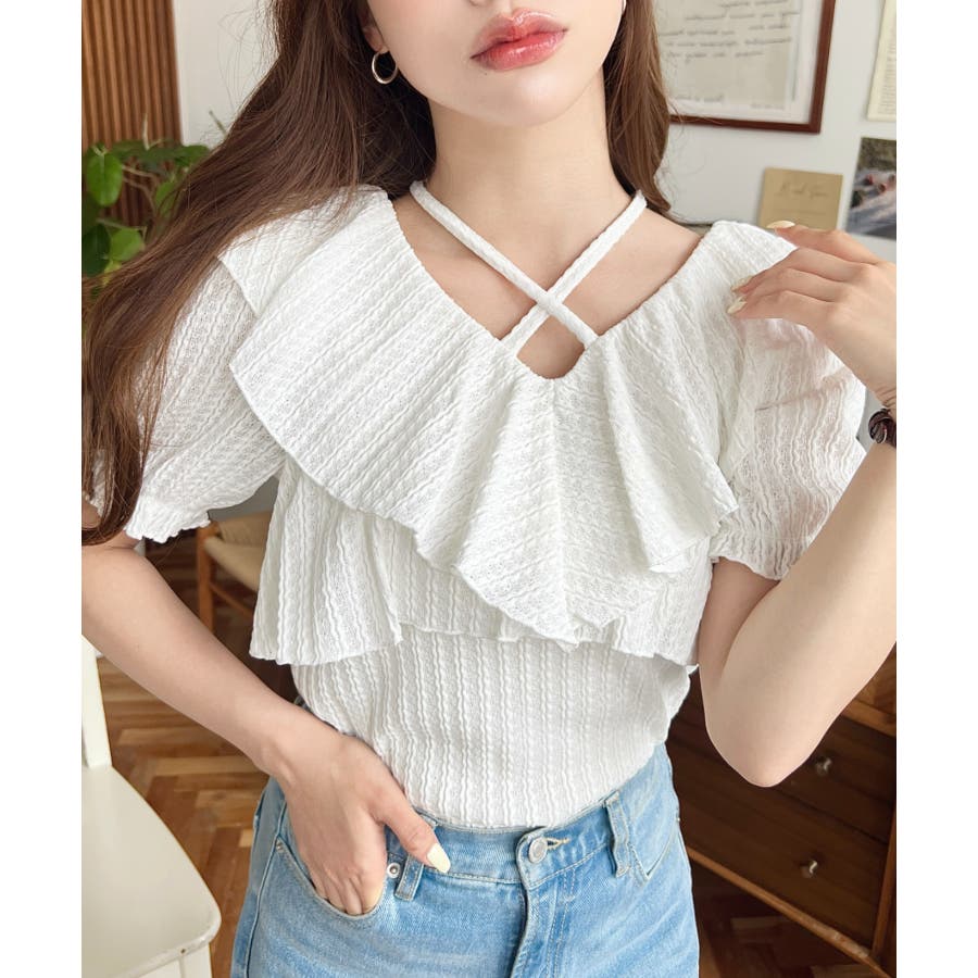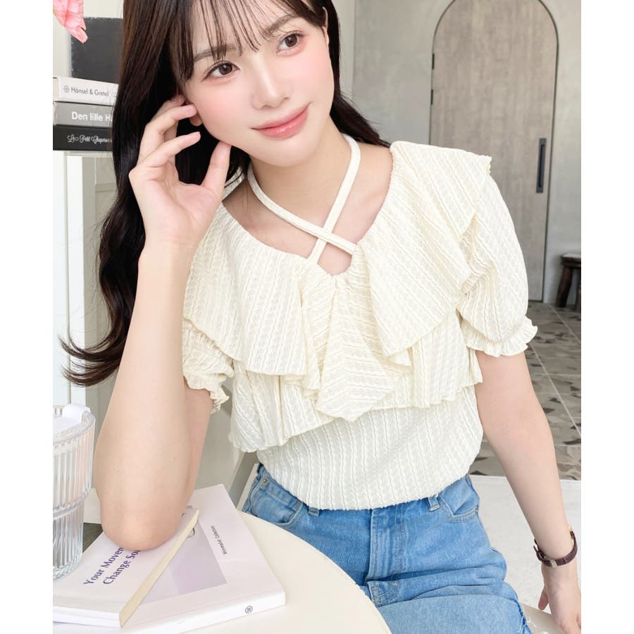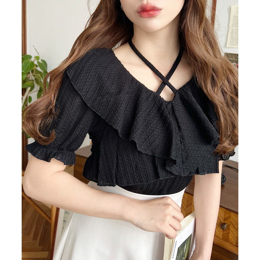 細かいストライプレースと大振りなフリル、クロスホルターネックがコーデに抜け感が出ます◎
