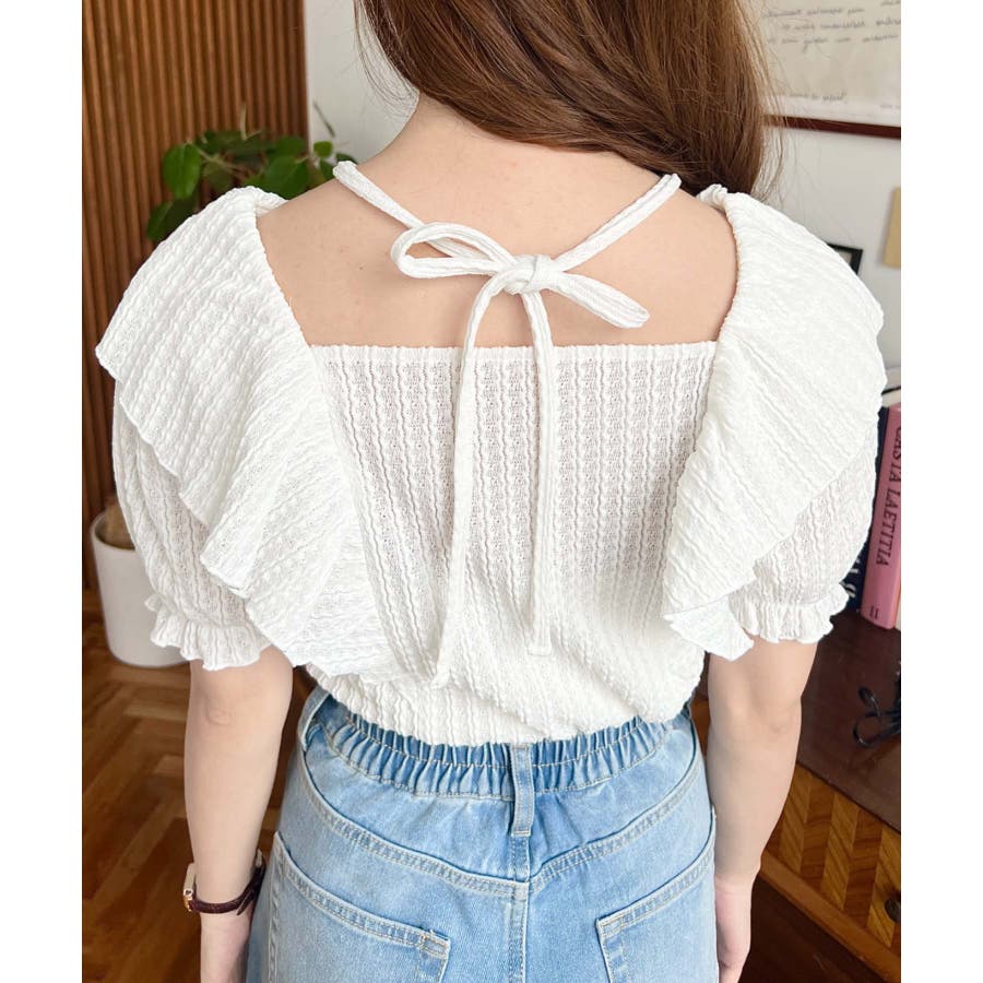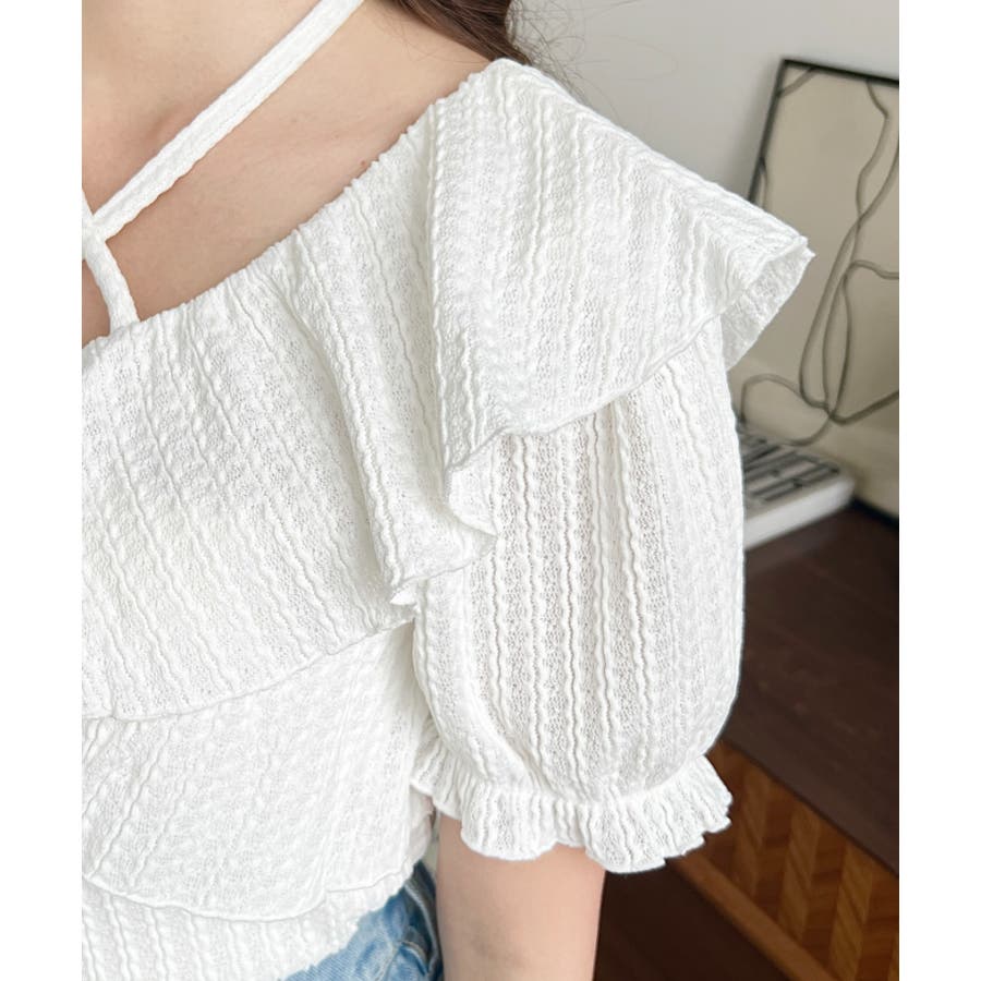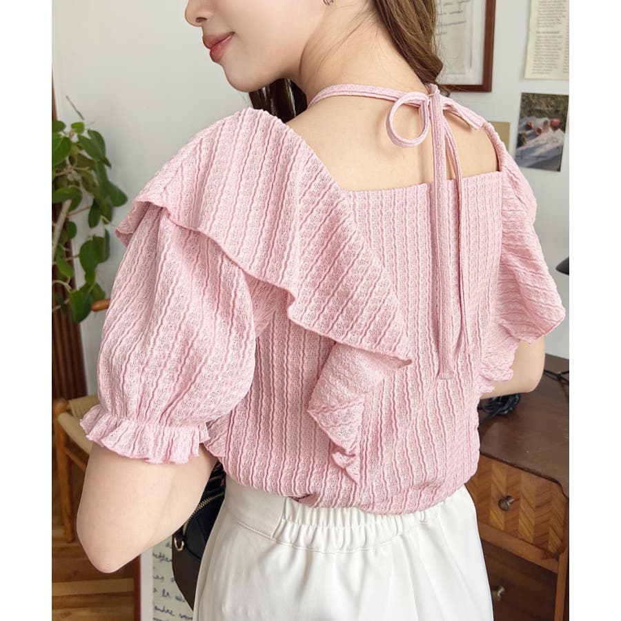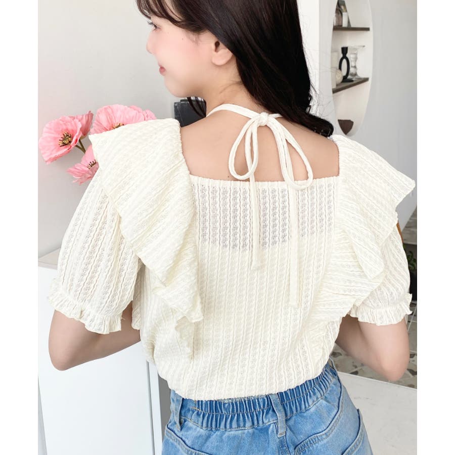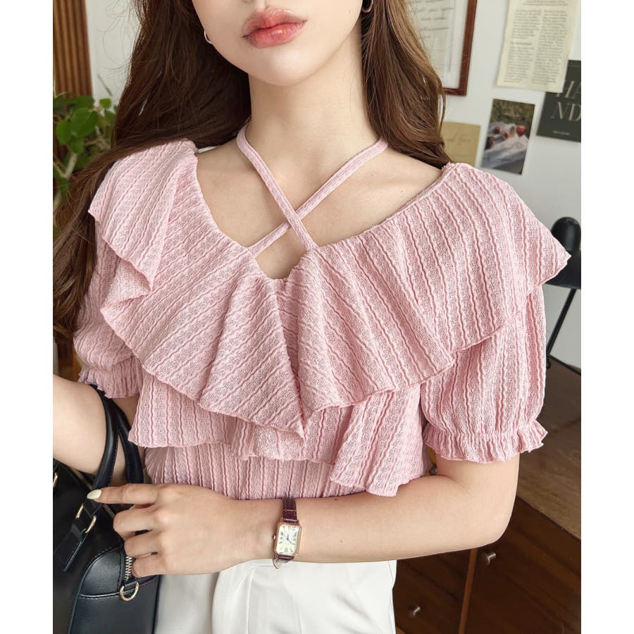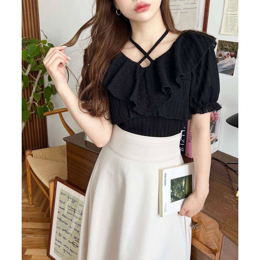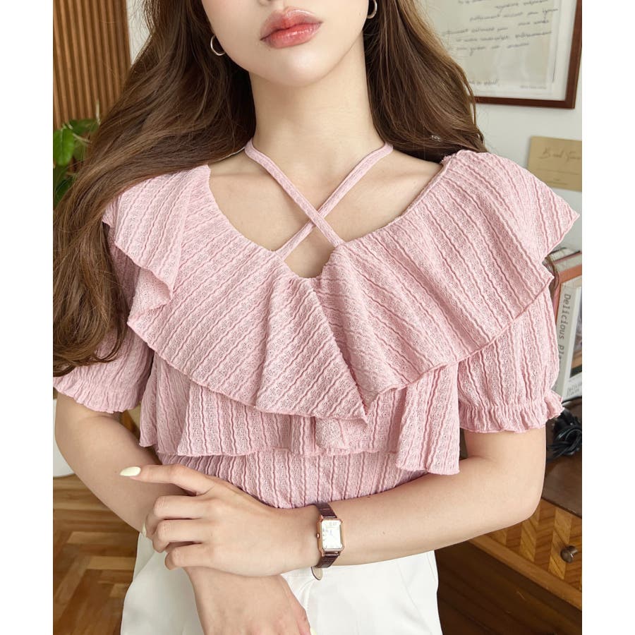 細かいストライプレースと大振りなフリル、クロスホルターネックがコーデに抜け感が出ます◎