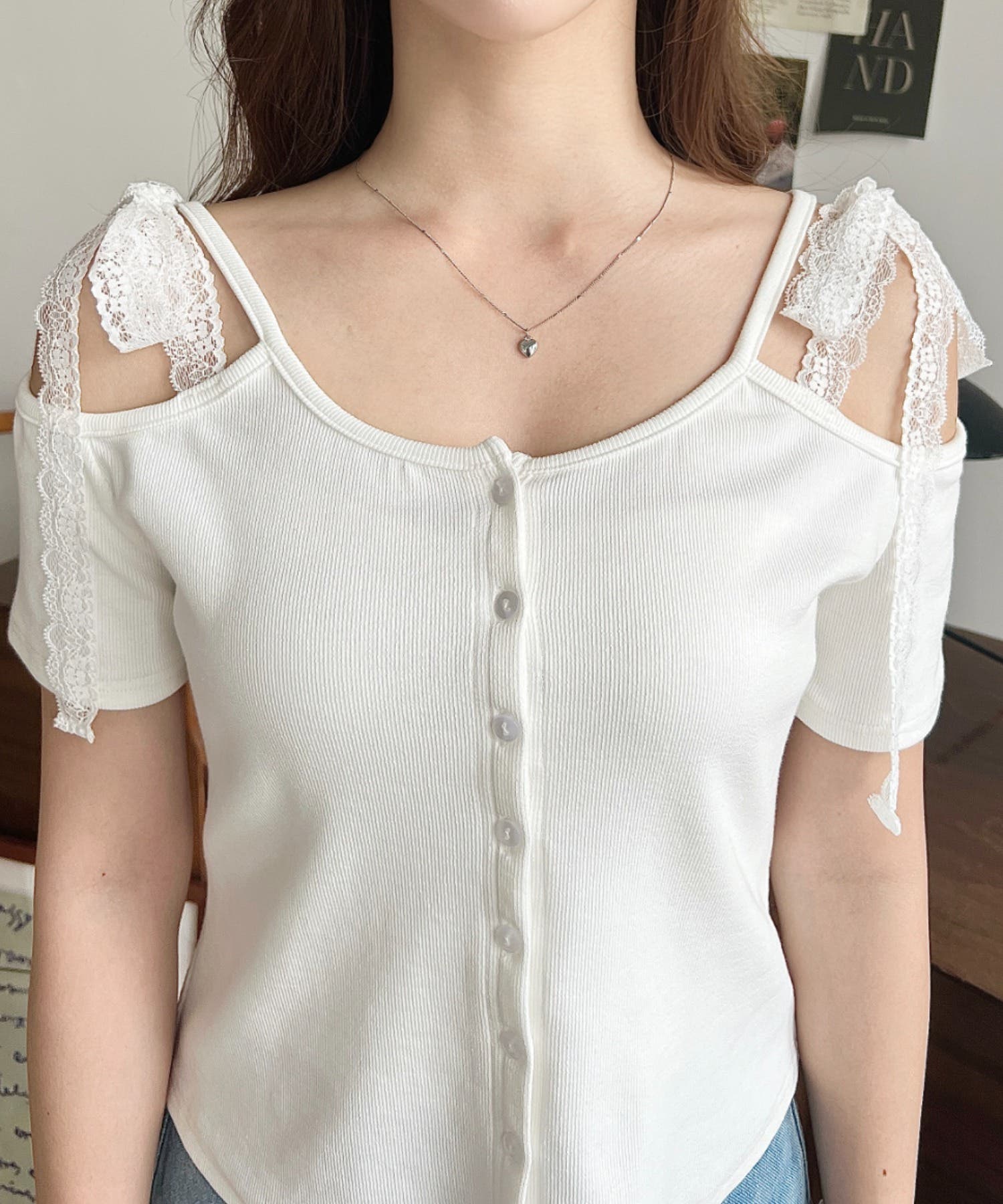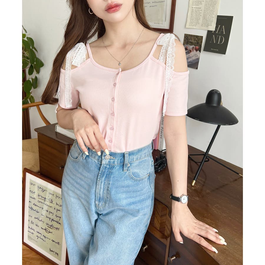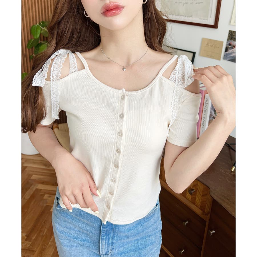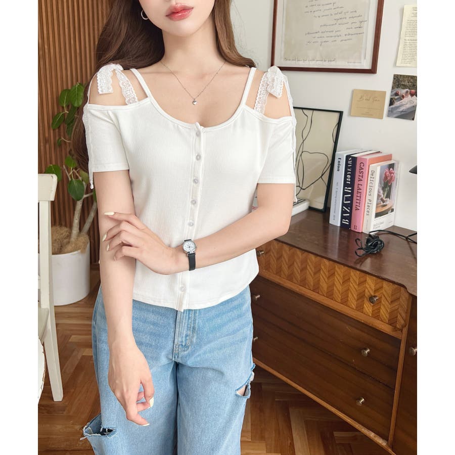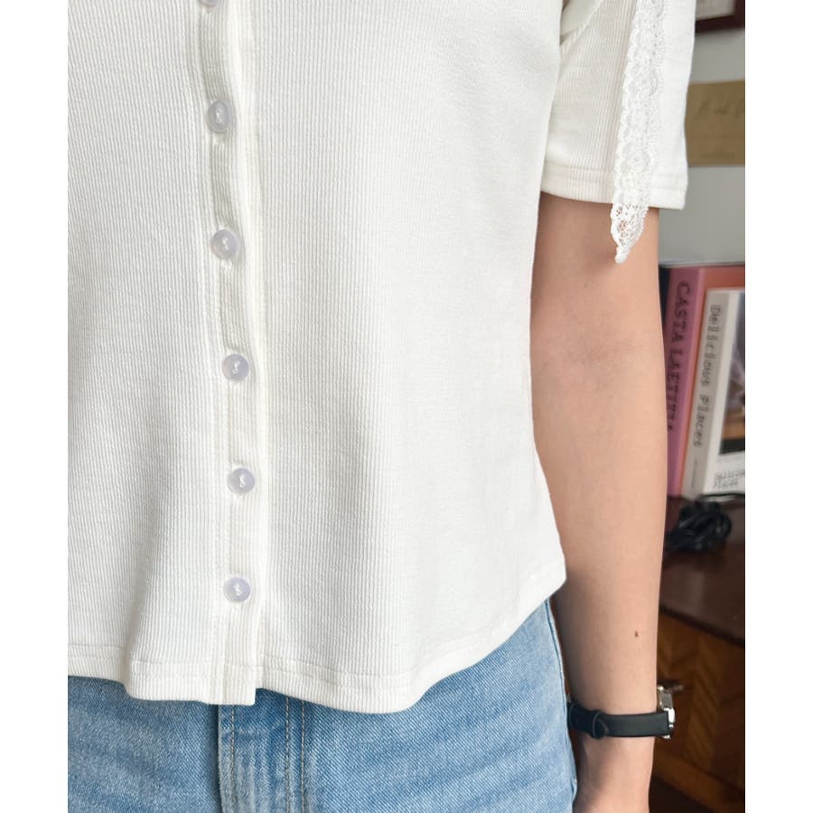 ・小さなボタンやレースリボンがアクセントになり、シンプルなボトムから柄物まで相性抜群な1枚。