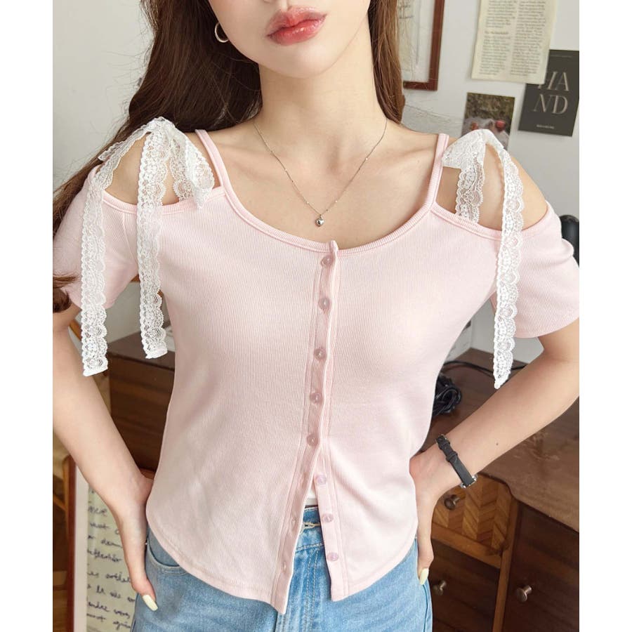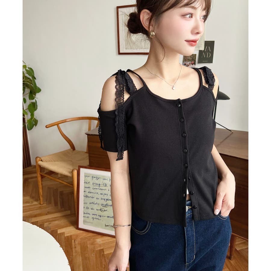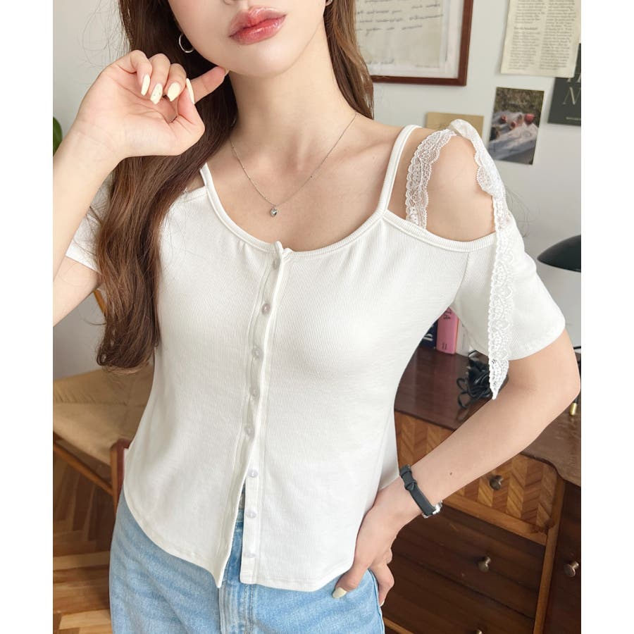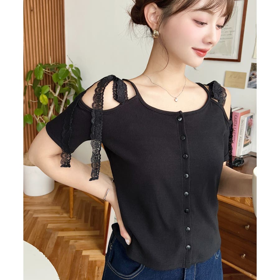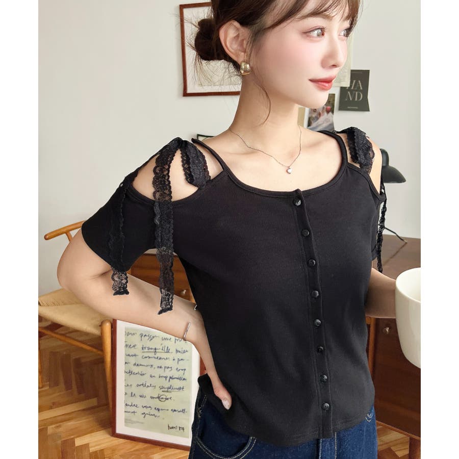 ・小さなボタンやレースリボンがアクセントになり、シンプルなボトムから柄物まで相性抜群な1枚。