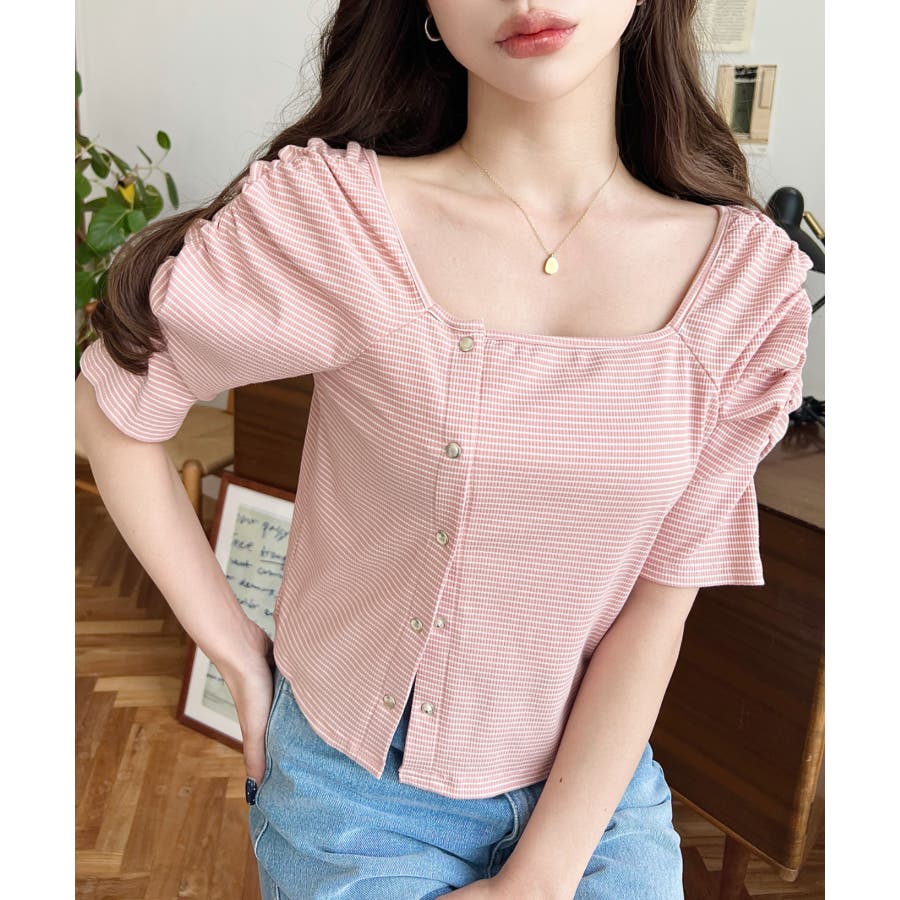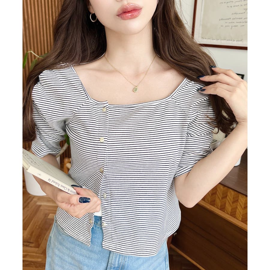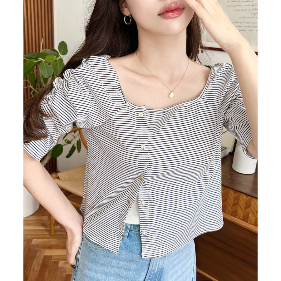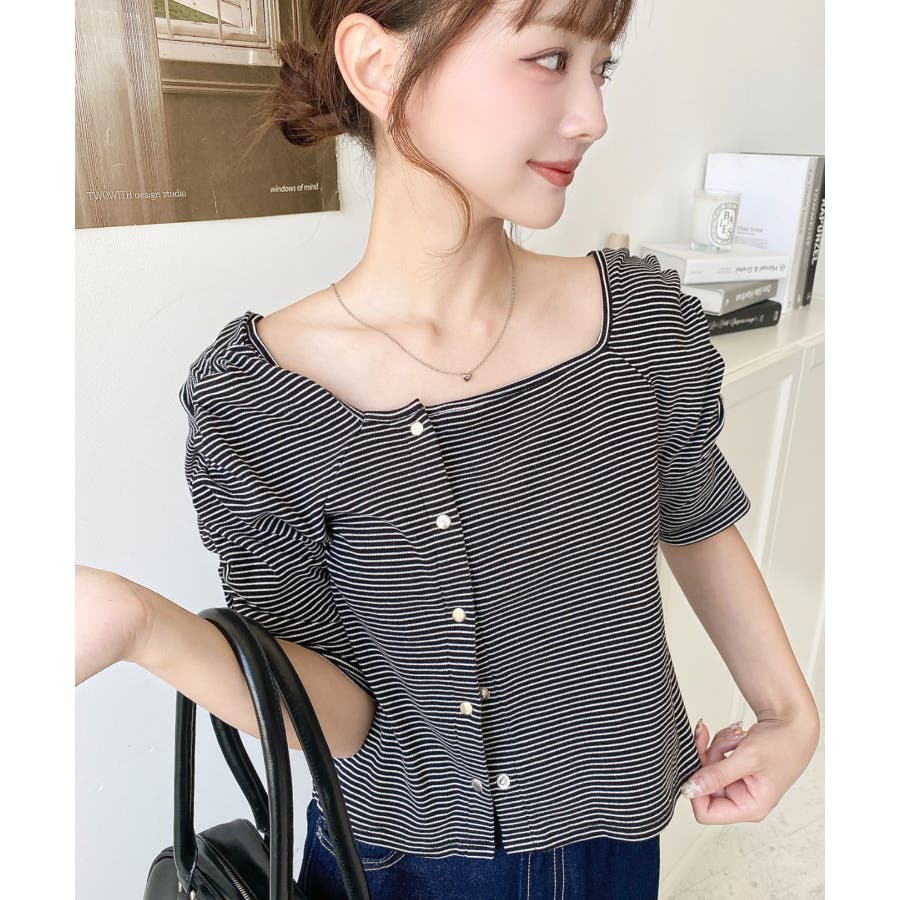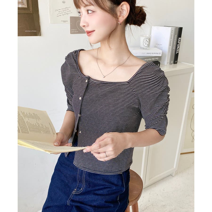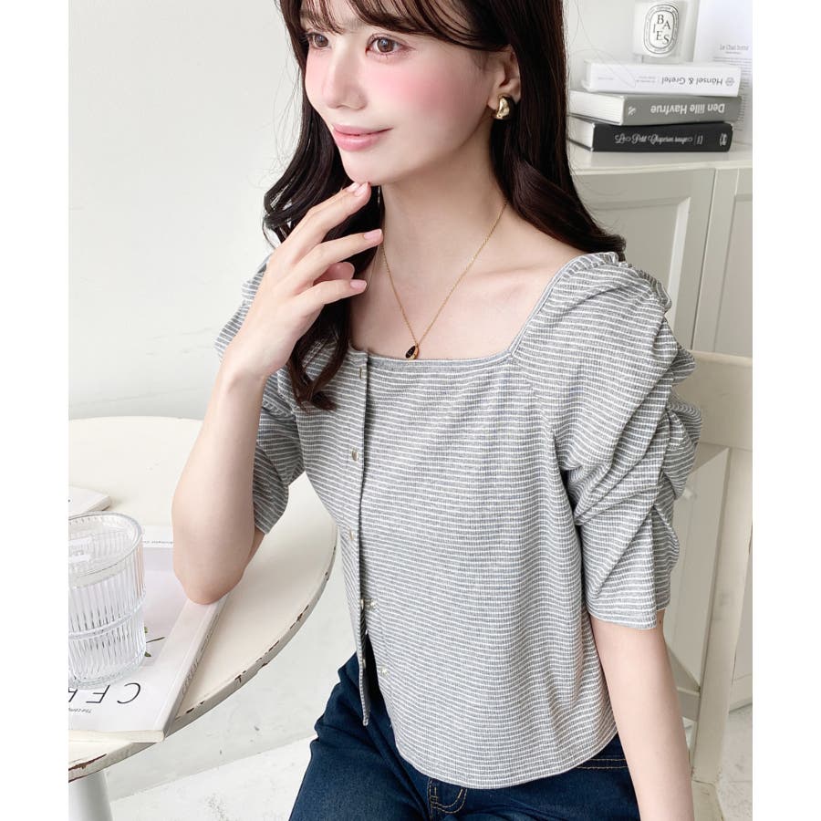 ・広めに開いたスクエアネックデザインが、顔周りをすっきり見せ小顔効果に!ヘアスタイルも選ばない着回しやすい1枚◎