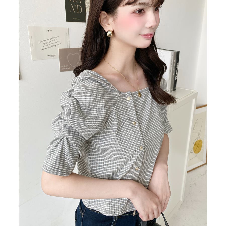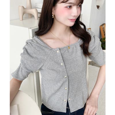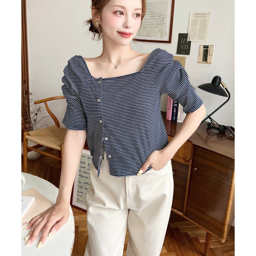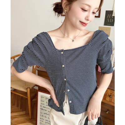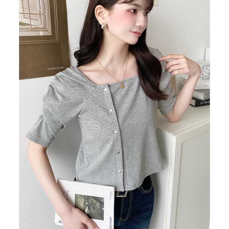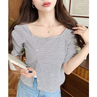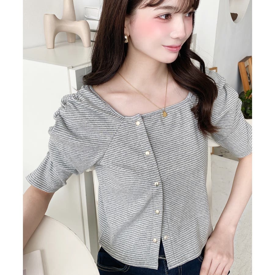 ・袖のギャザーやアシンメトリーにデザインされた小さなボタンが、シンプルでさりげなくお洒落見えする半袖ボーダートップスです♪