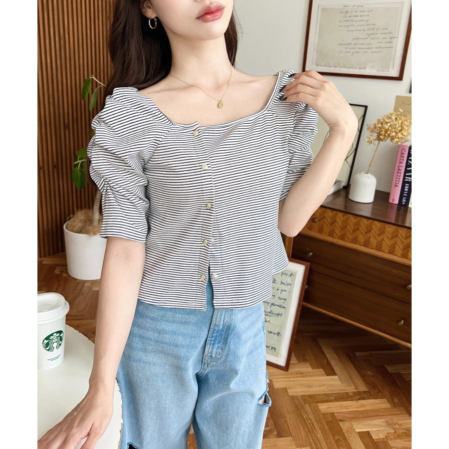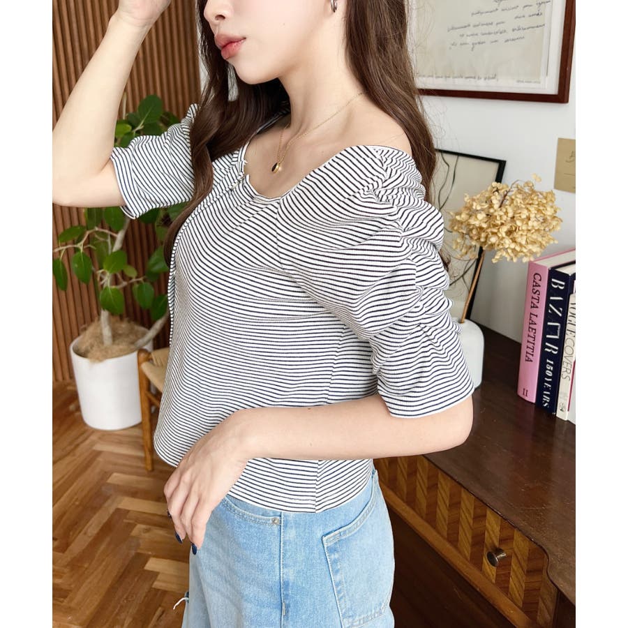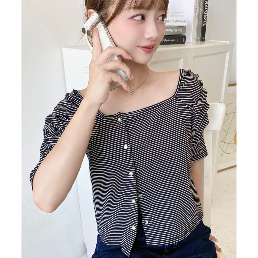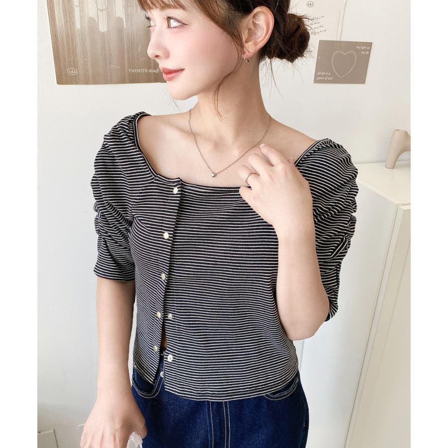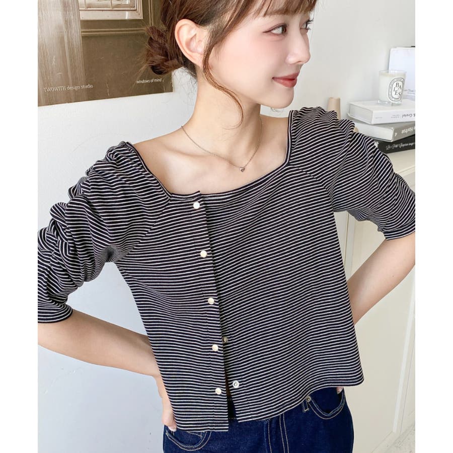 ・袖のギャザーやアシンメトリーにデザインされた小さなボタンが、シンプルでさりげなくお洒落見えする半袖ボーダートップスです♪
