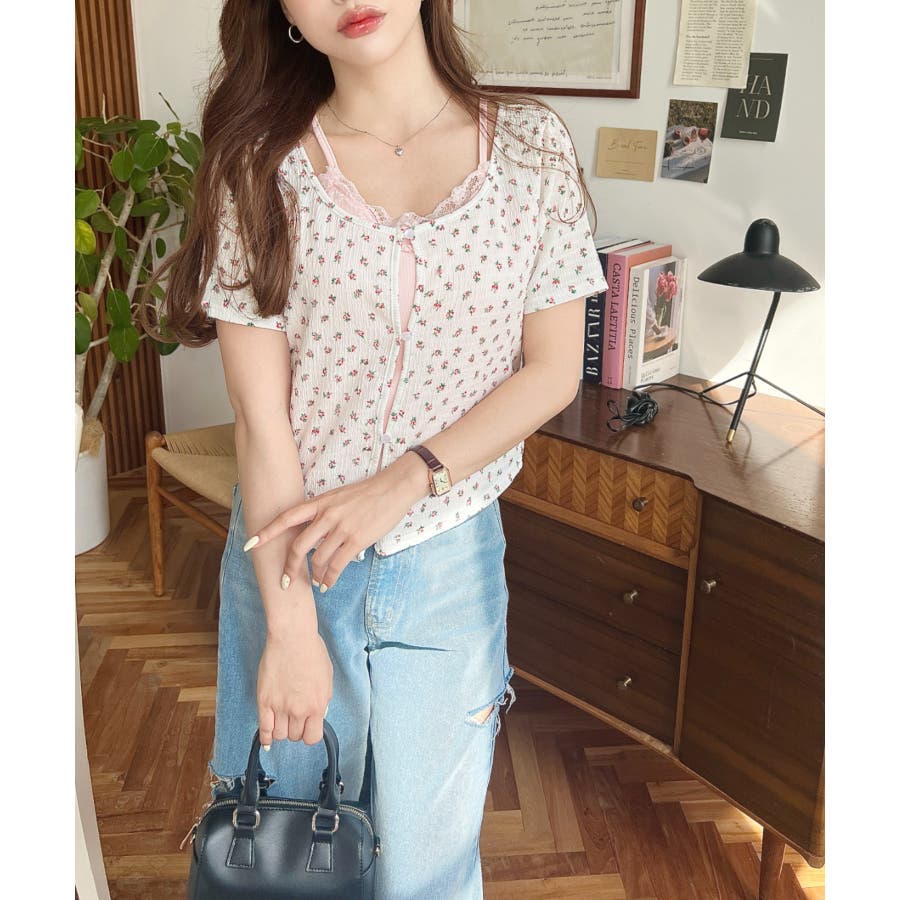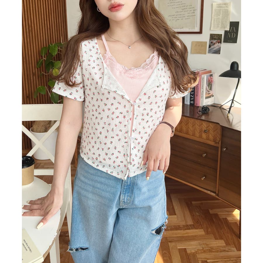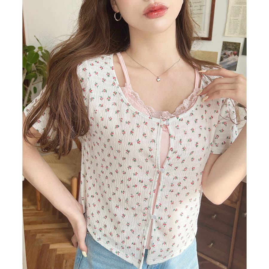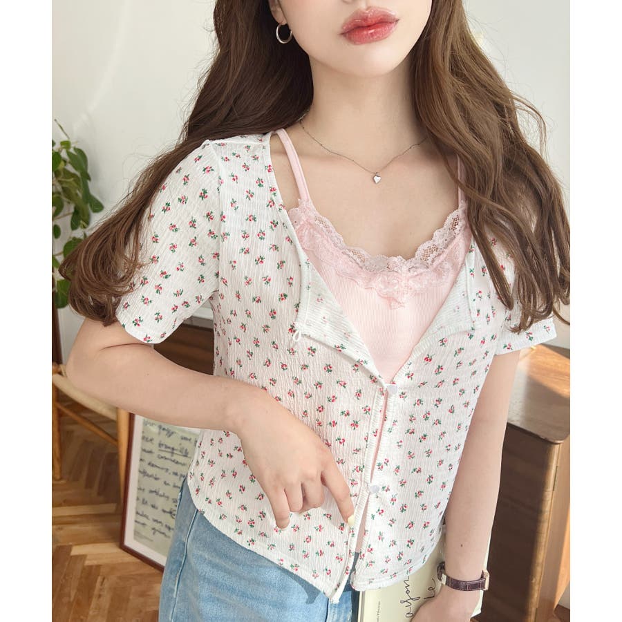 花柄カットソー:無地キャミソール