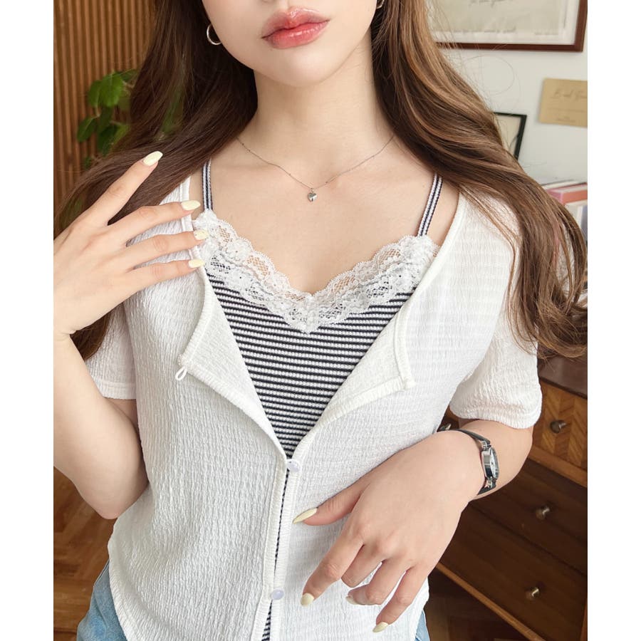 ・フロントボタンを開けるとレースのキャミソールがちらっと覗くお洒落さ。一番上のみ開けて抜け感を演出するとよりレイヤード感が伝わります◎