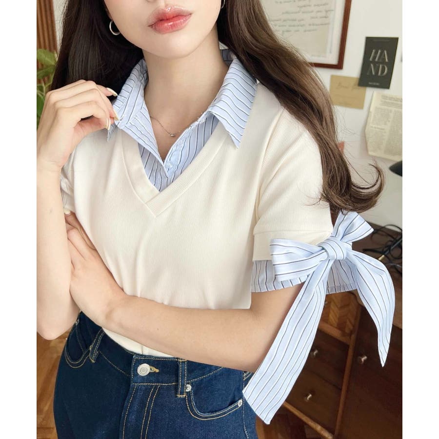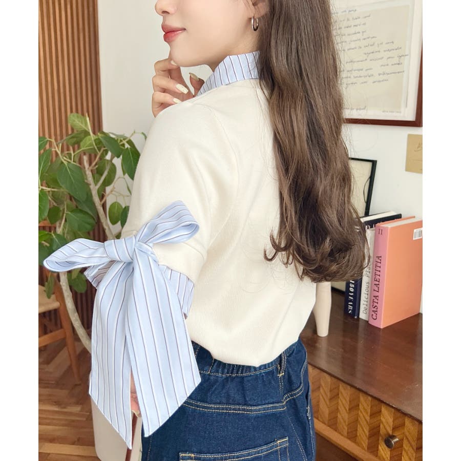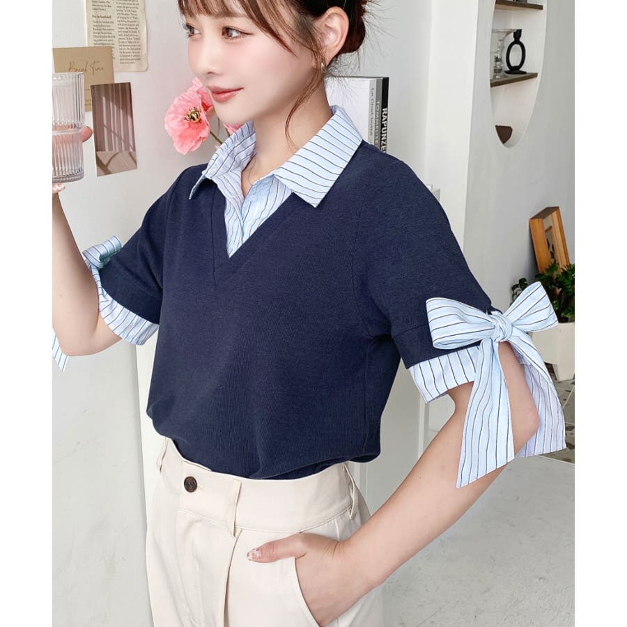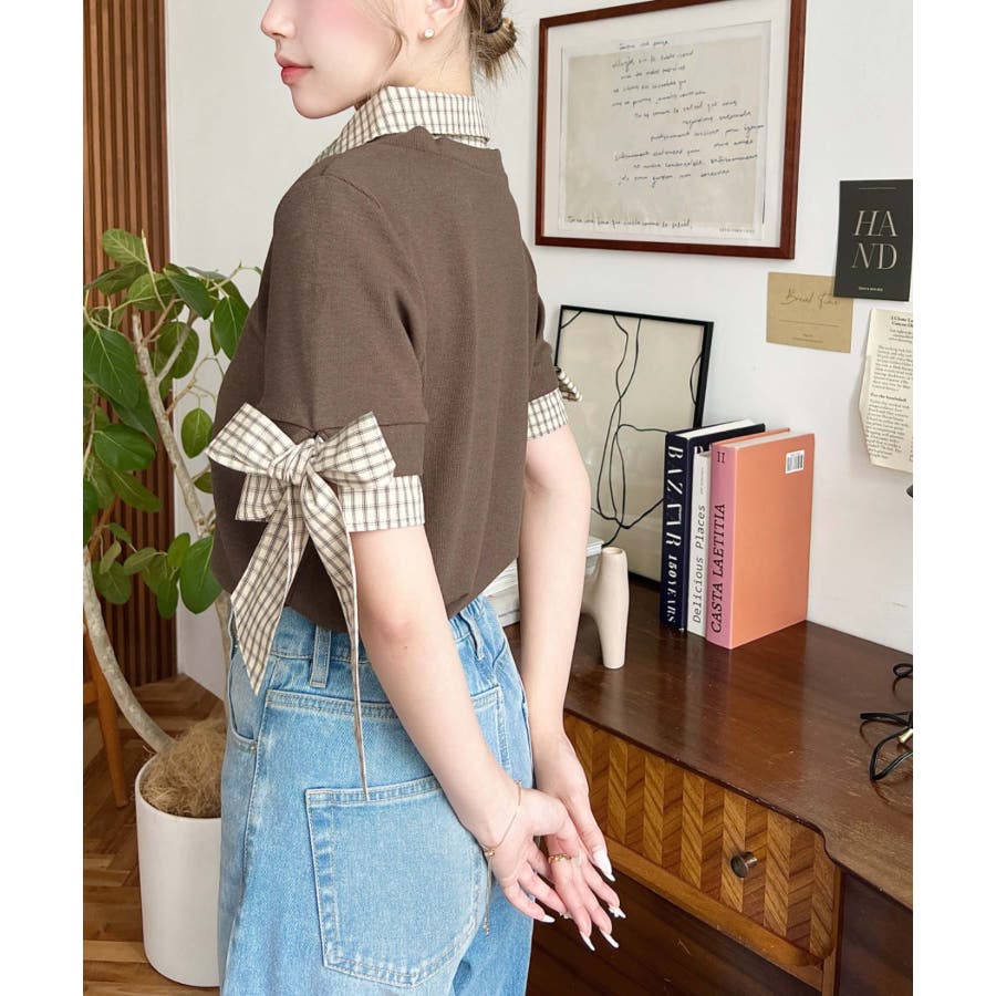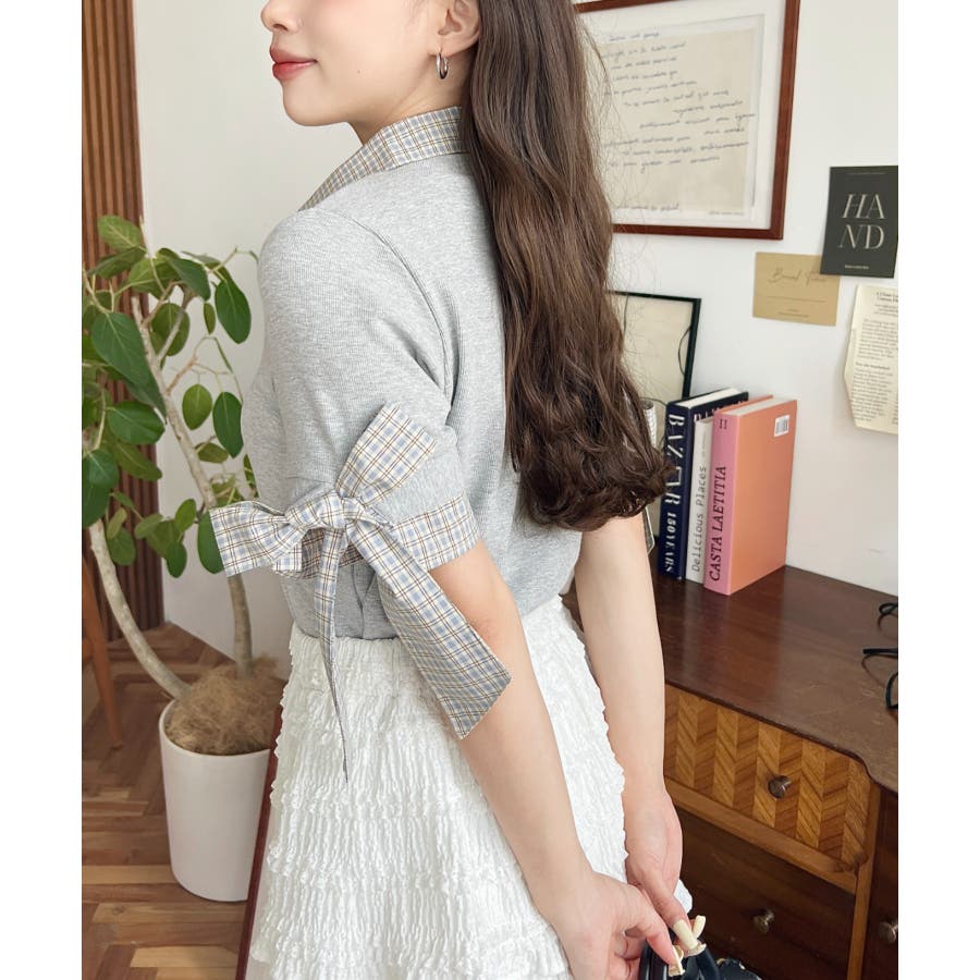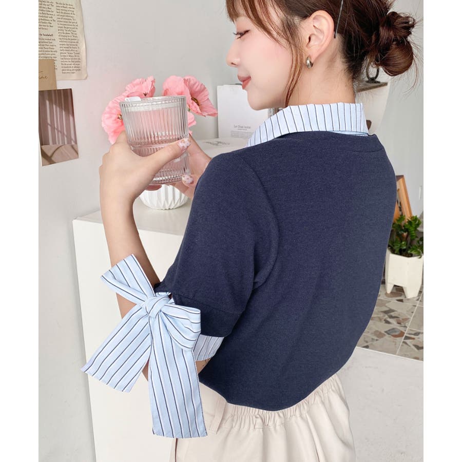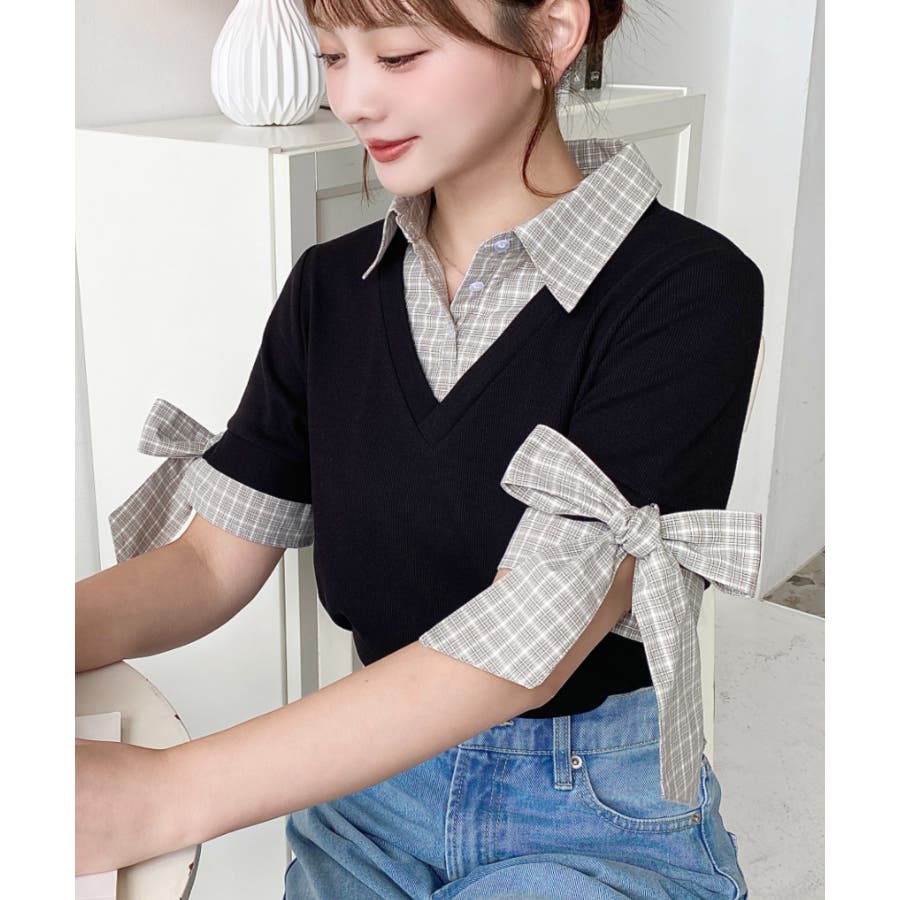 ・袖口にもシャツが重なり、大きなリボンがフェミニンで目を惹くポイントに◎