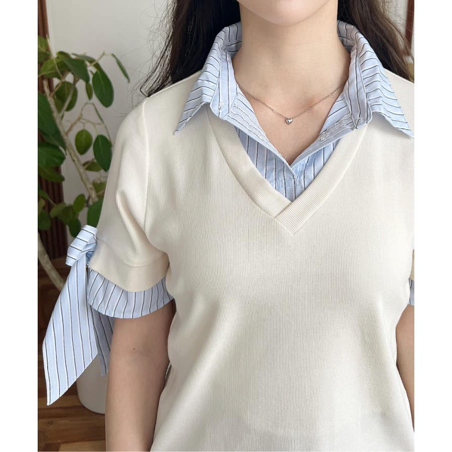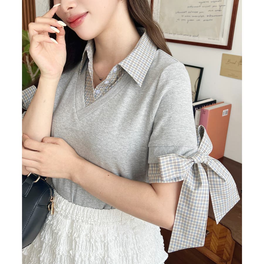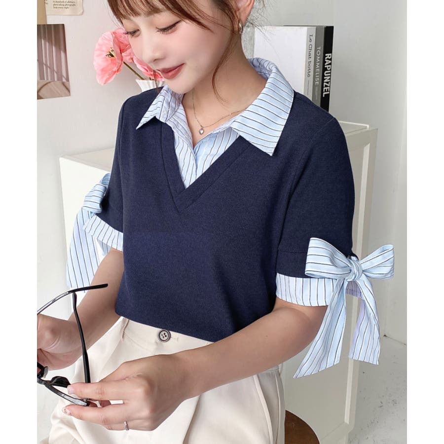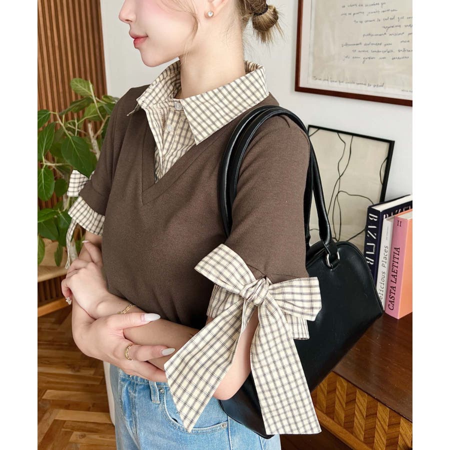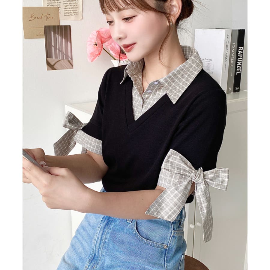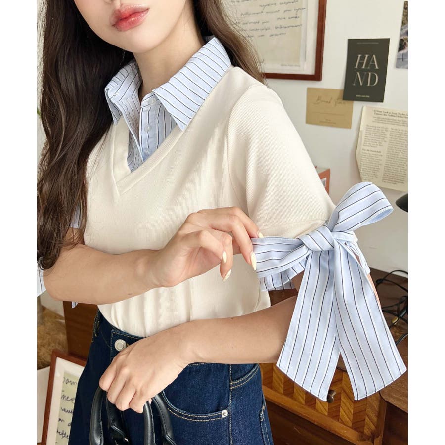 ・袖口にもシャツが重なり、大きなリボンがフェミニンで目を惹くポイントに◎