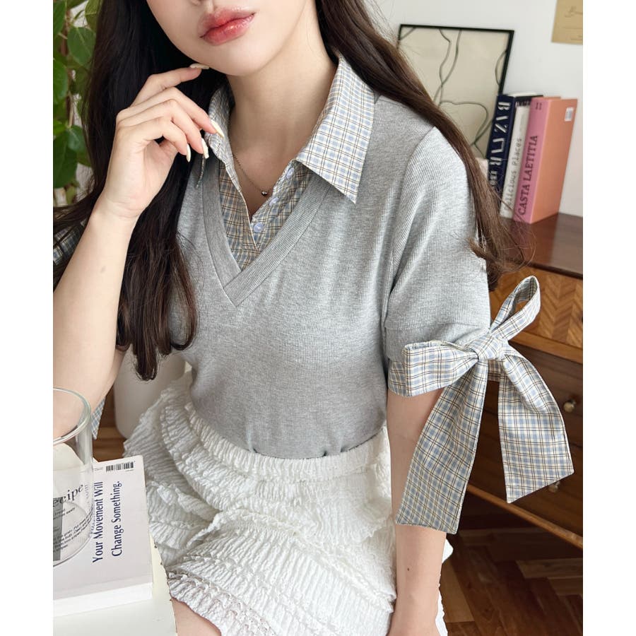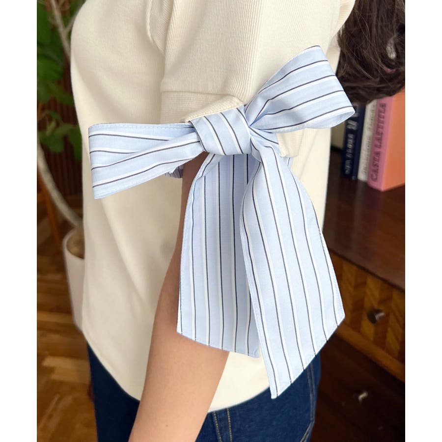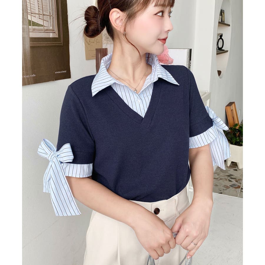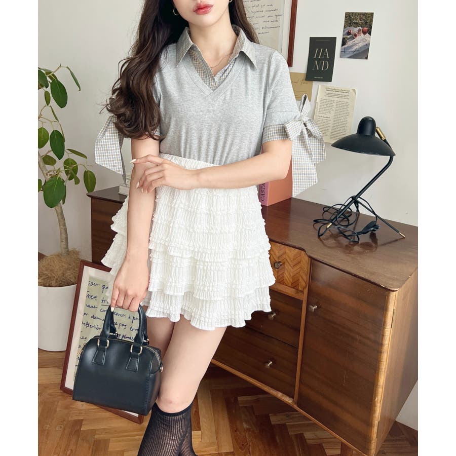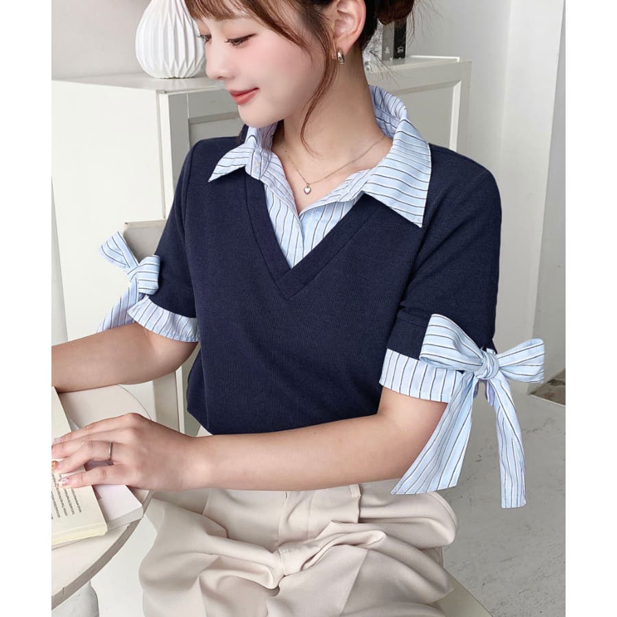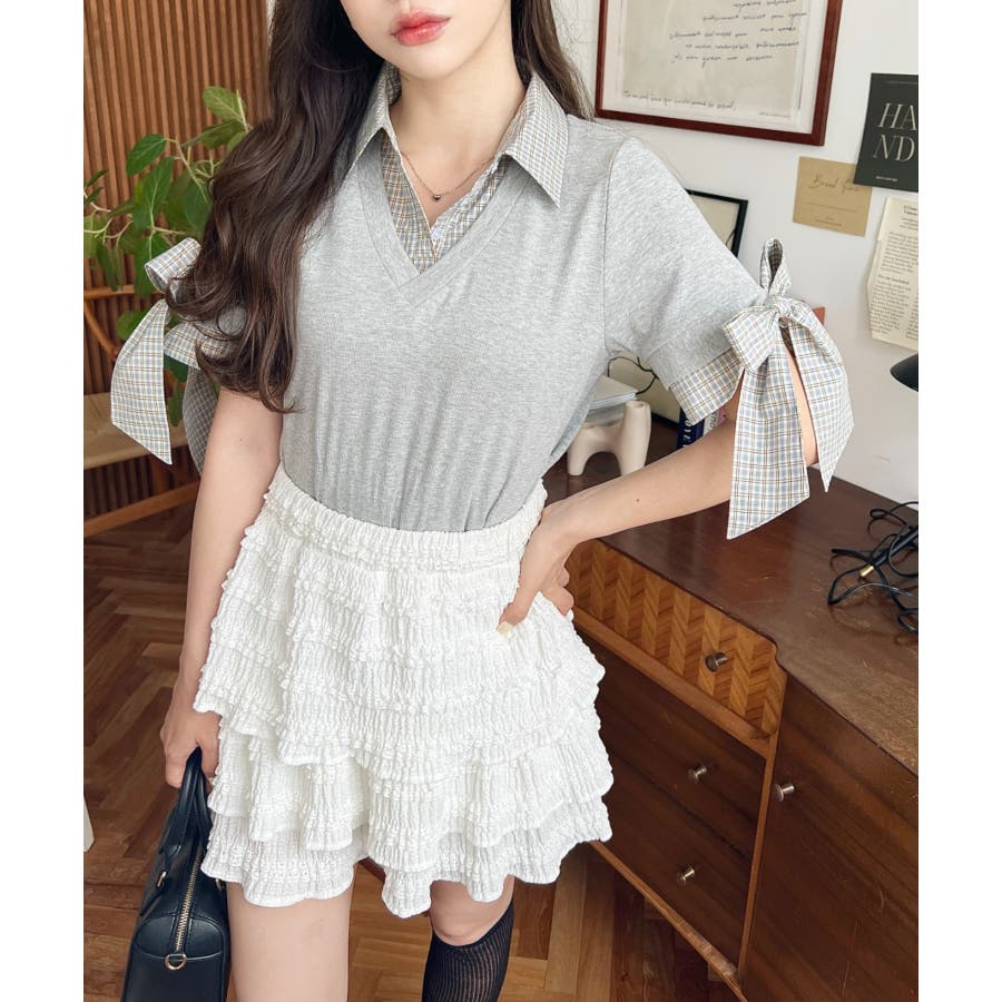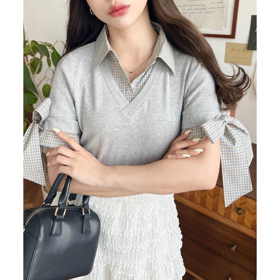 ・袖口にもシャツが重なり、大きなリボンがフェミニンで目を惹くポイントに◎