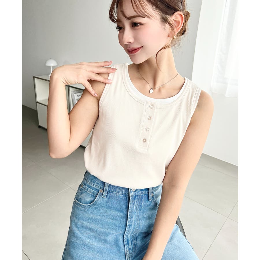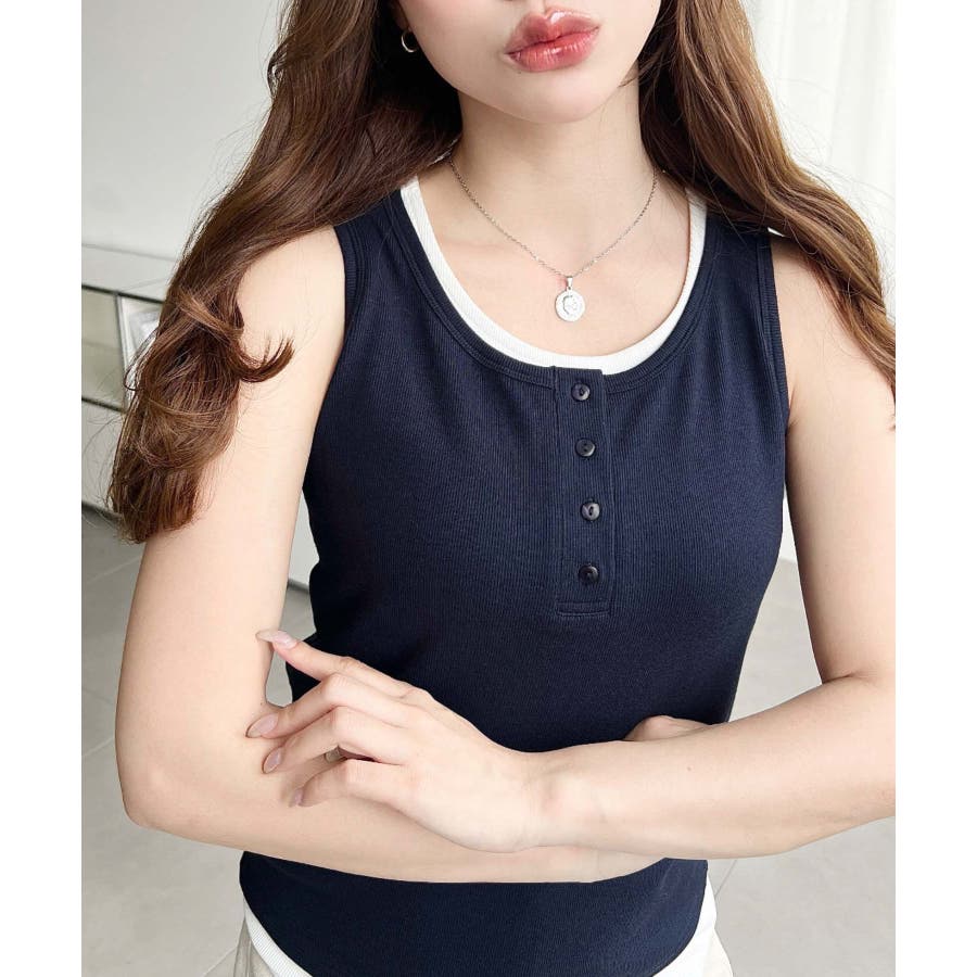 一見シンプルなタンクトップですがネックラインや裾からさりげなく覗く配色がトレンド感満載で、コーデが一気にこなれて見えます!