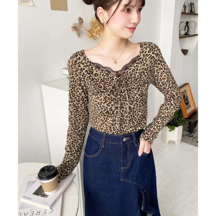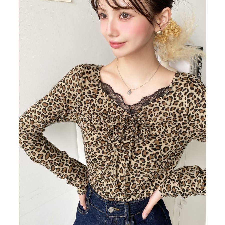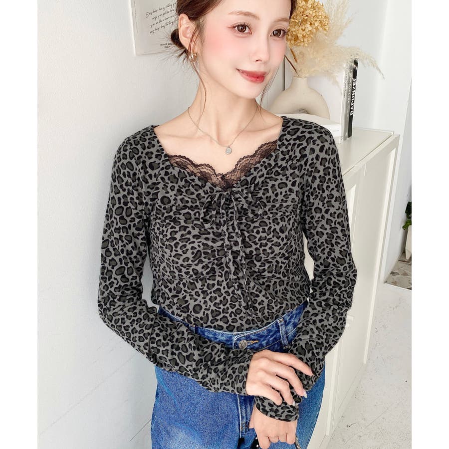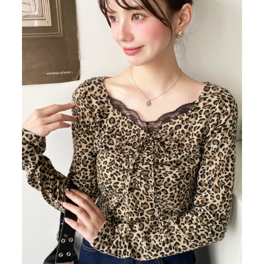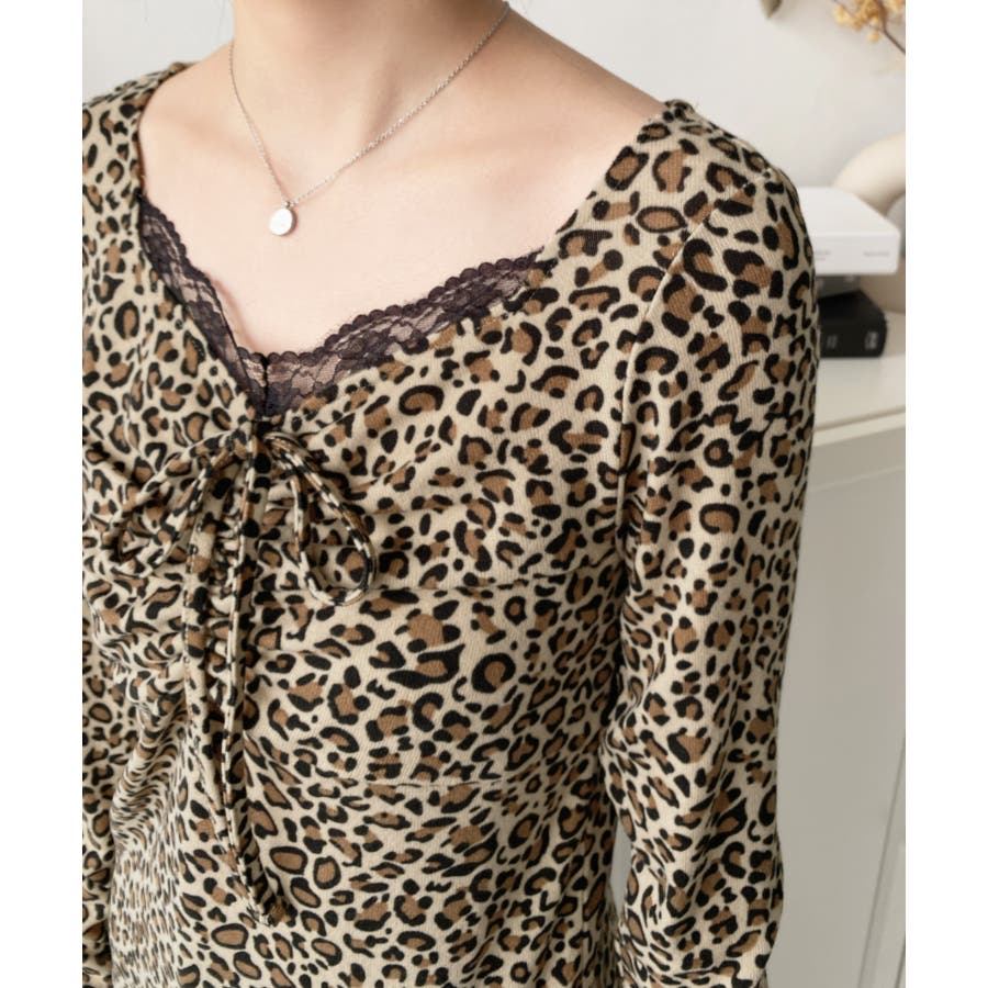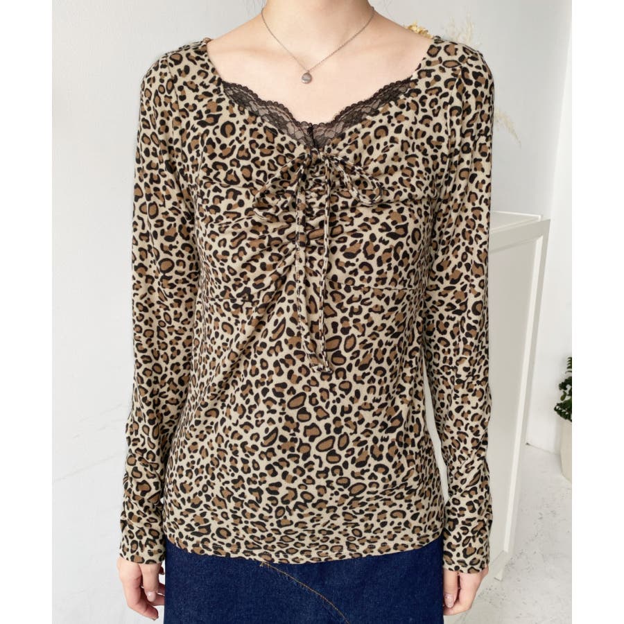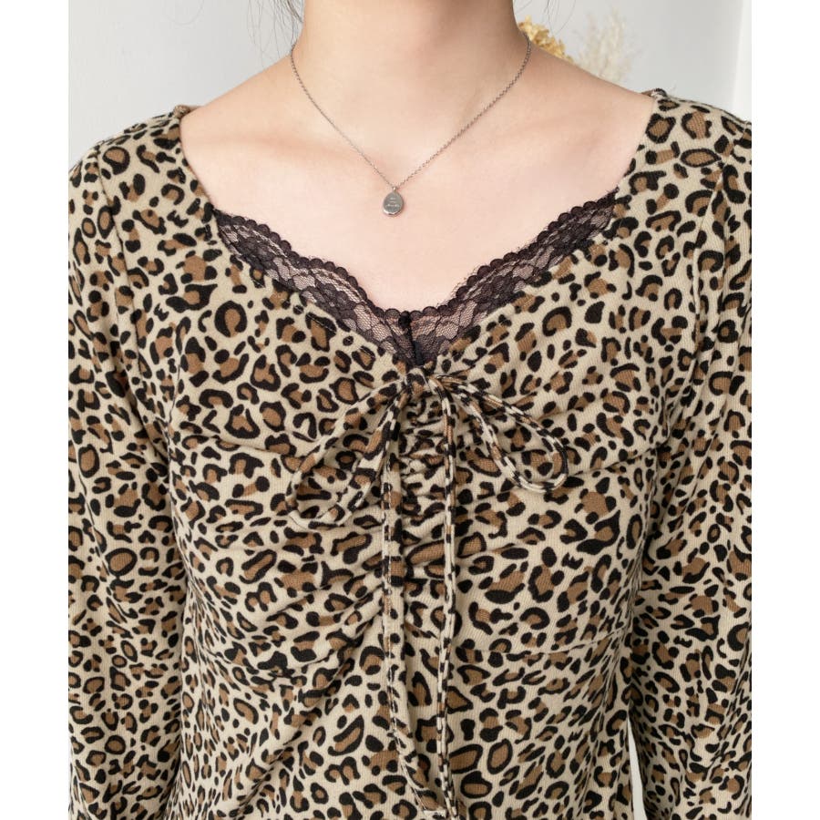 レオパードプリントフロントレースギャザーリボン長袖トップス