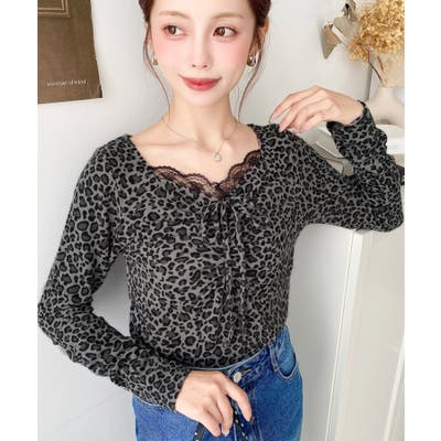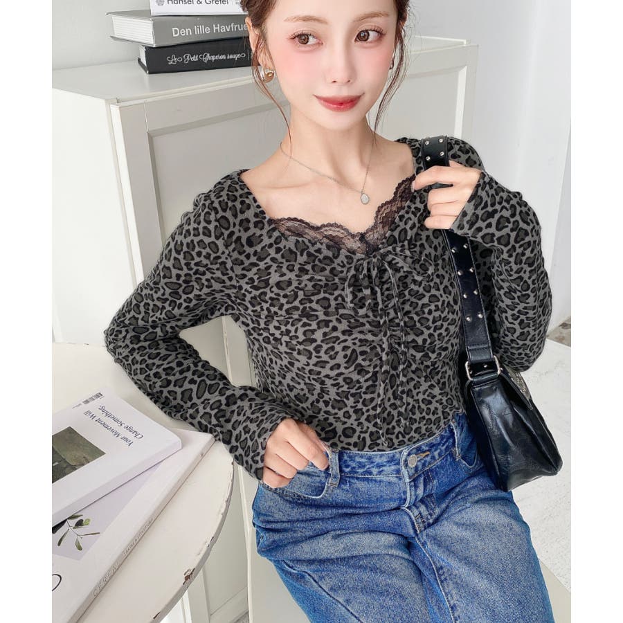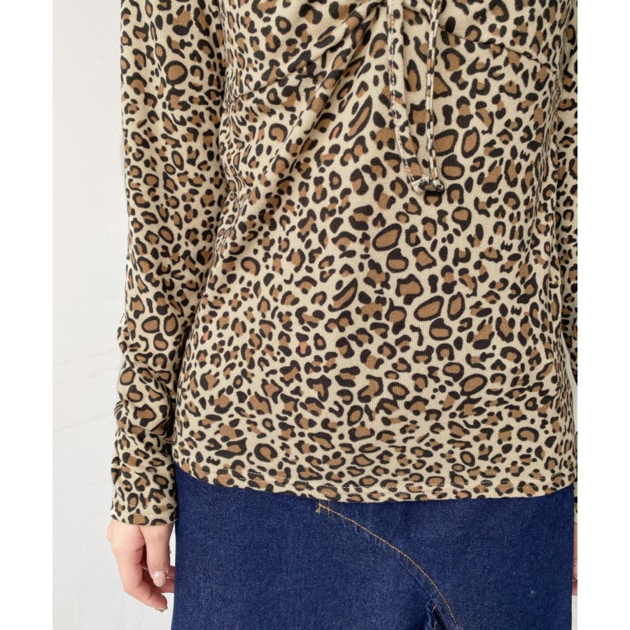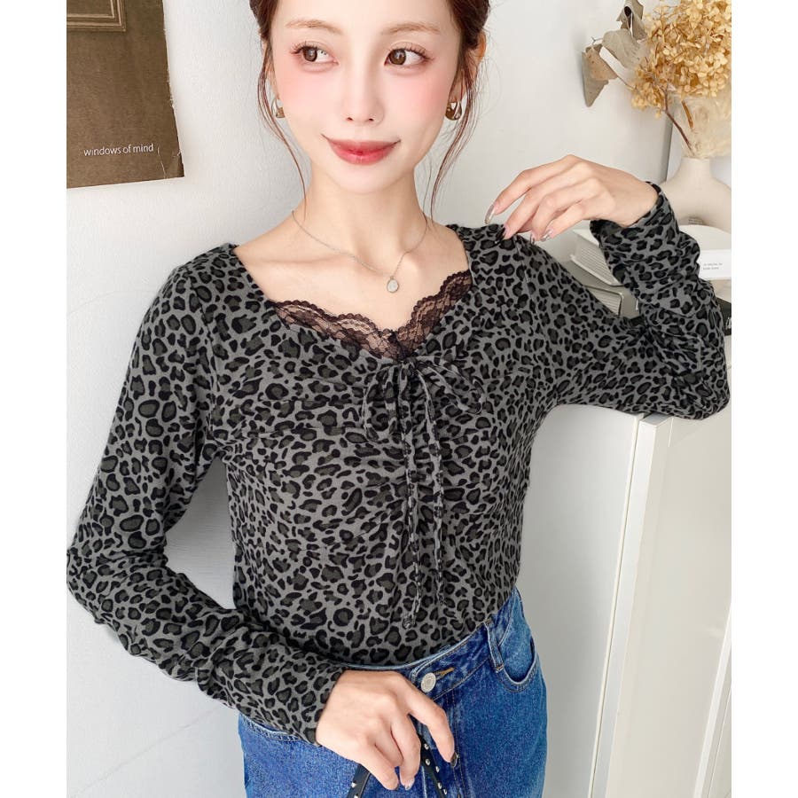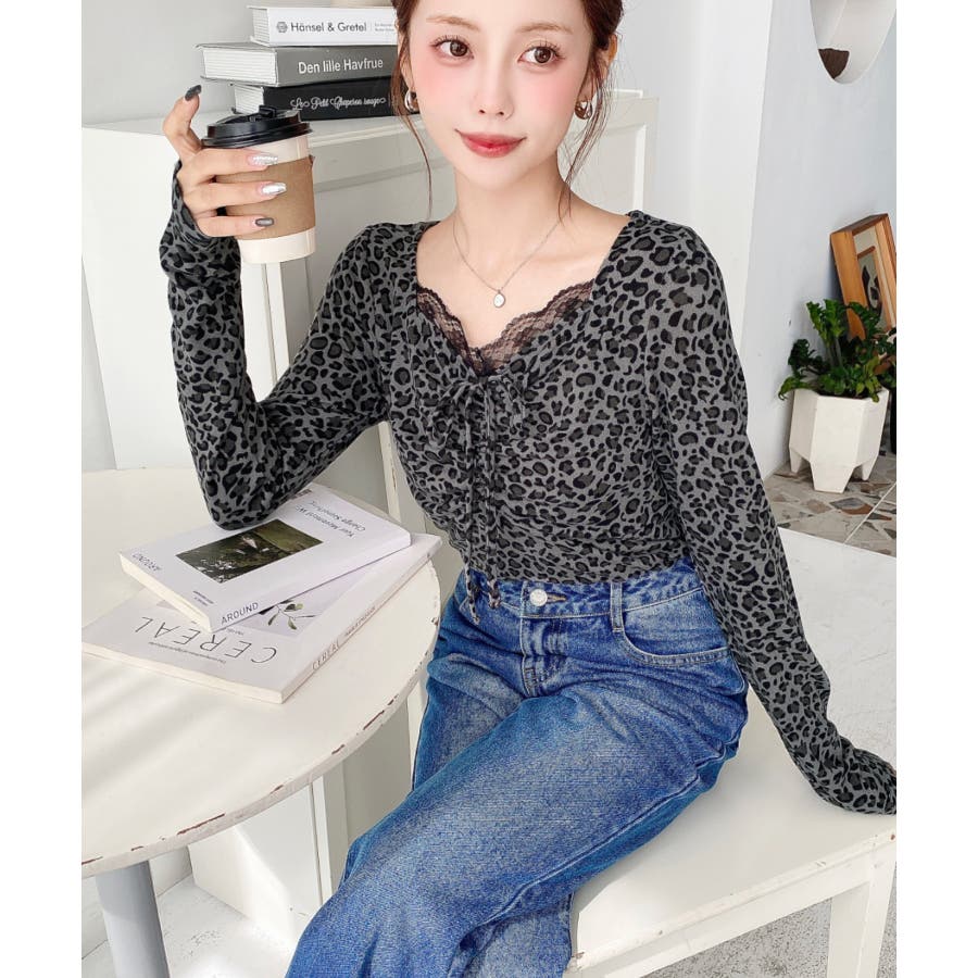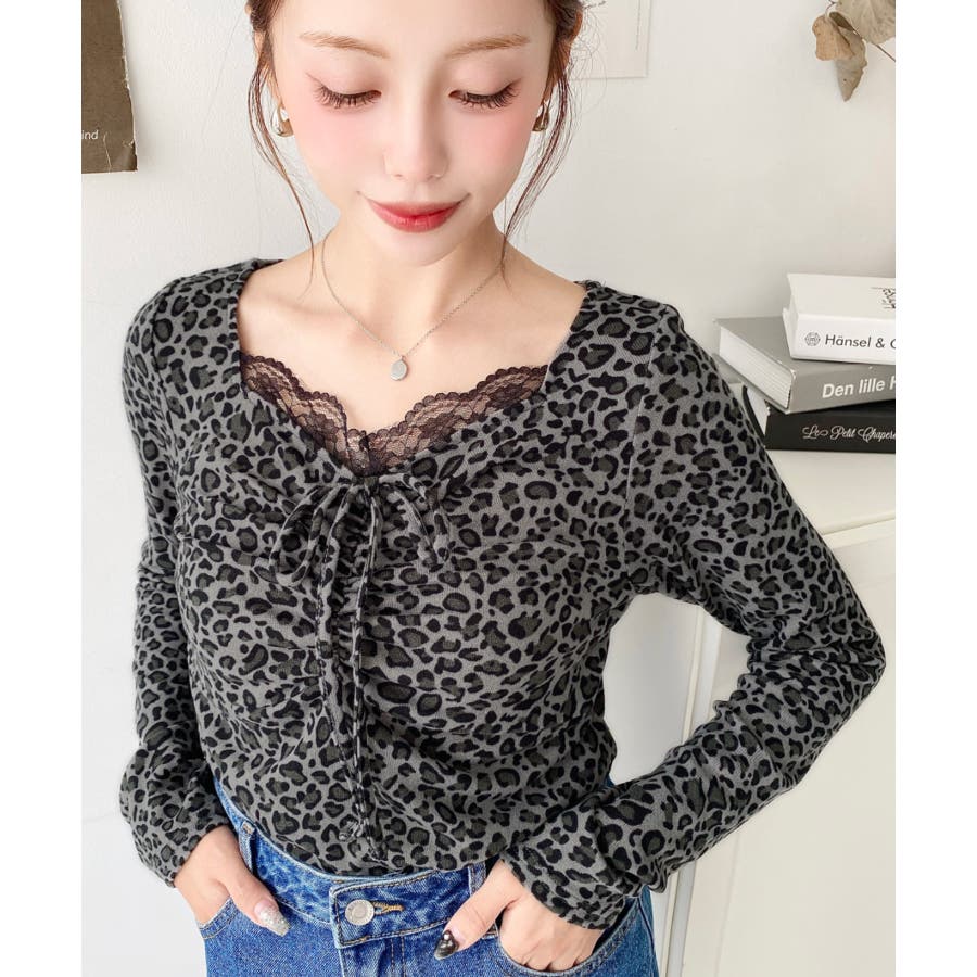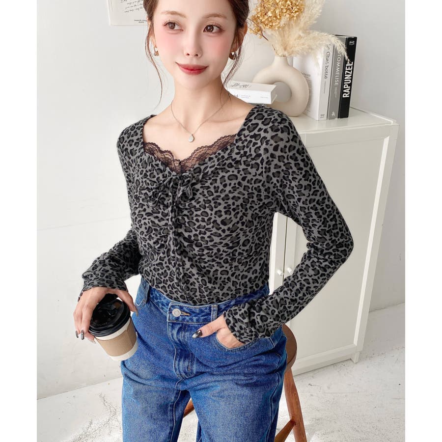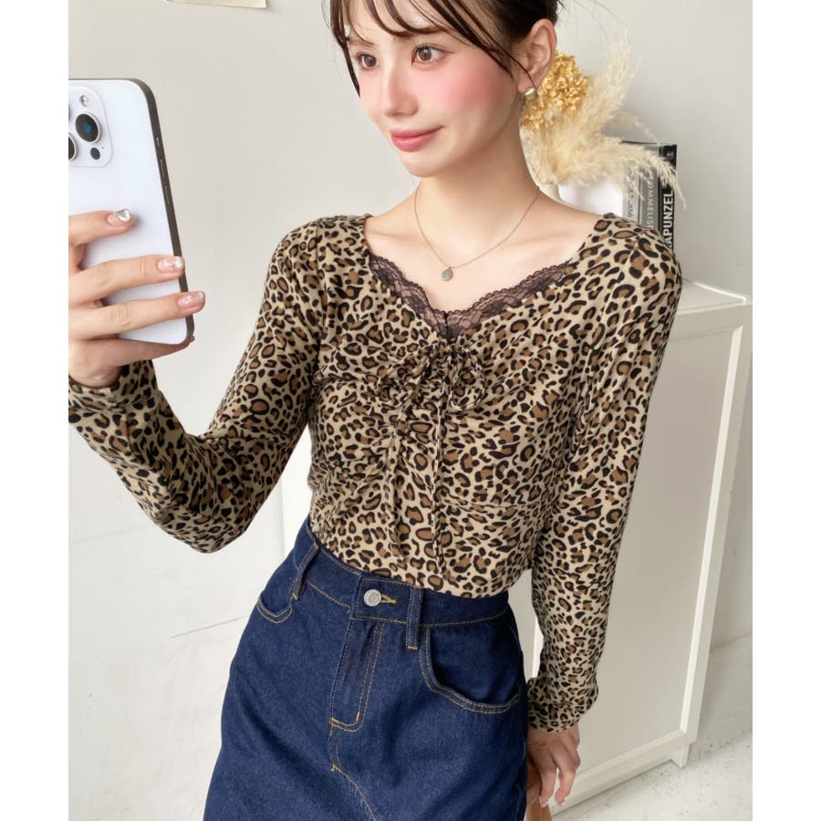 レオパードプリントフロントレースギャザーリボン長袖トップス