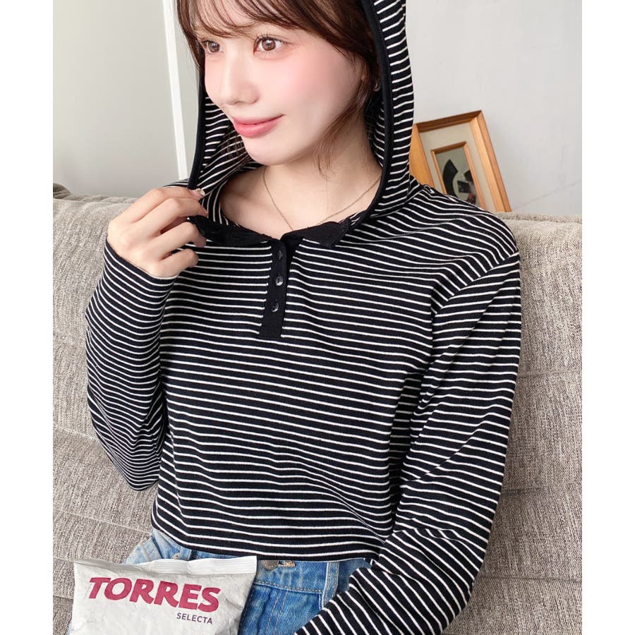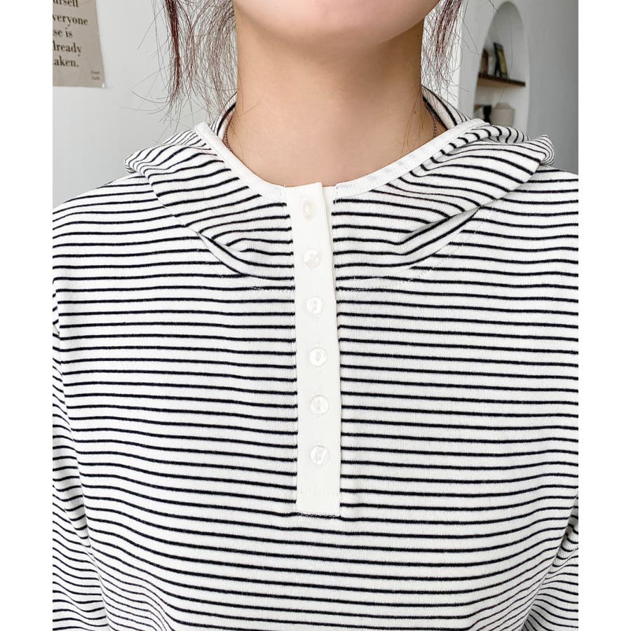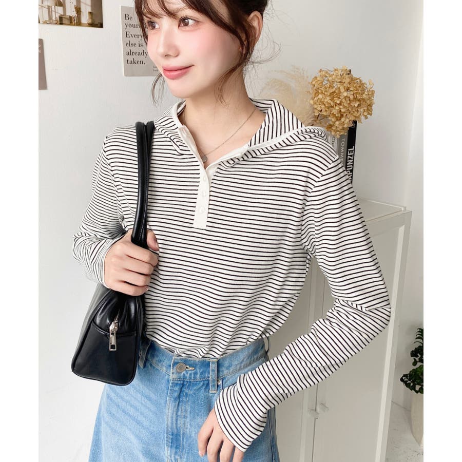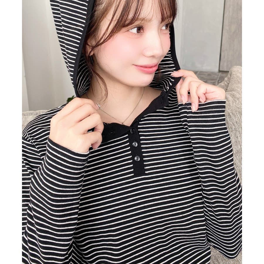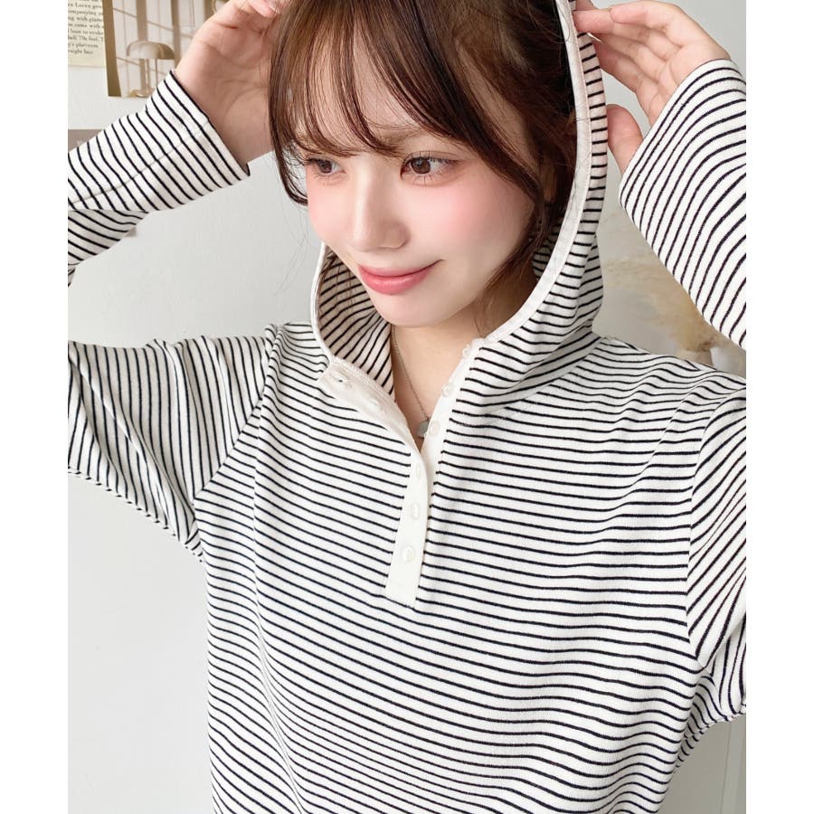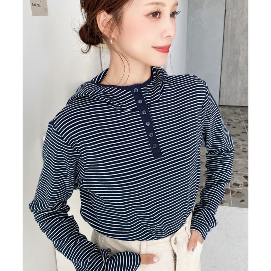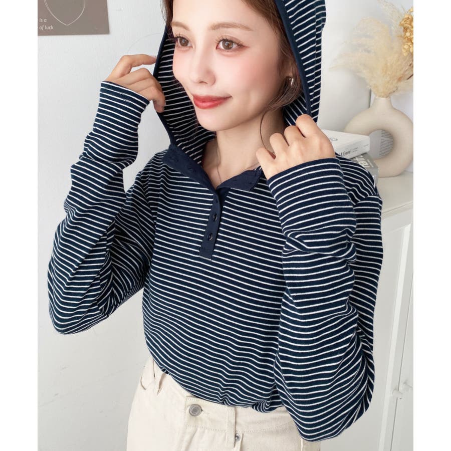 ・ヘンリーネックのボーダーTシャツをとフードの組み合わせでこなれ感のあるカジュアカットソーです♪