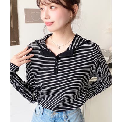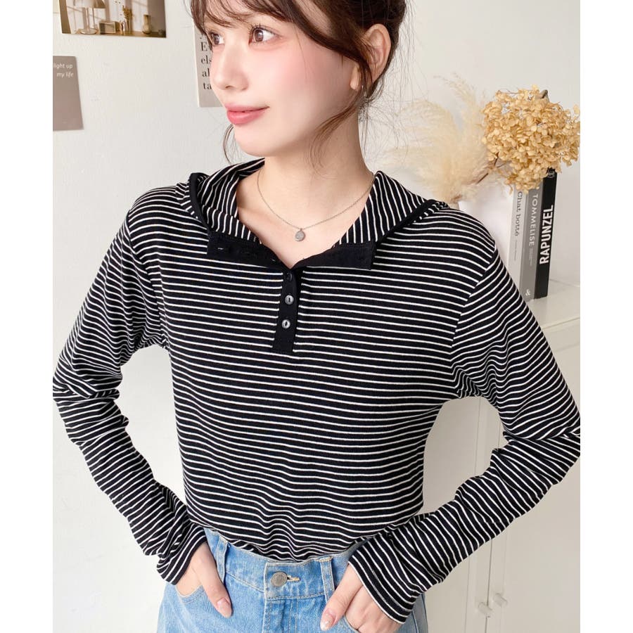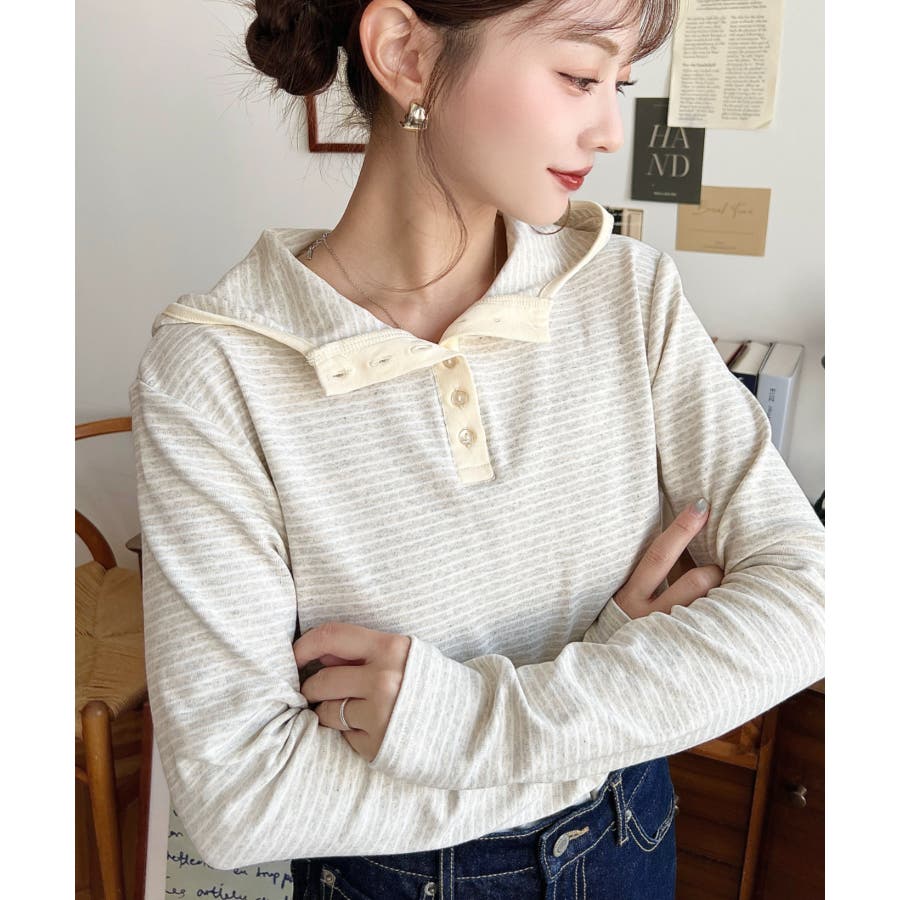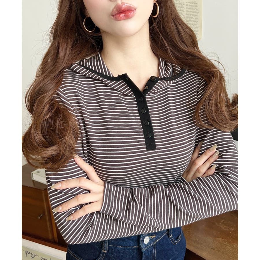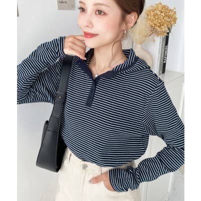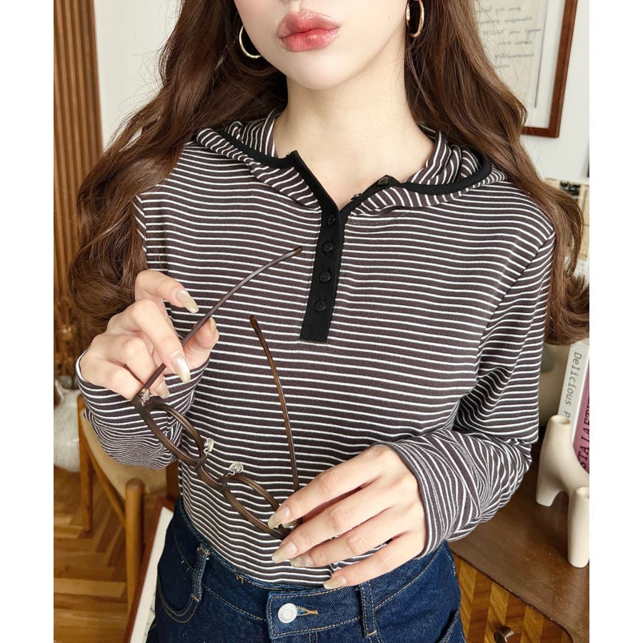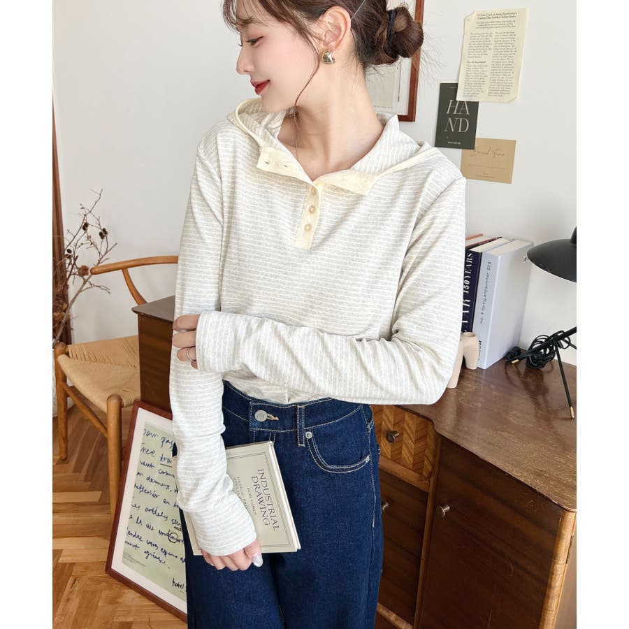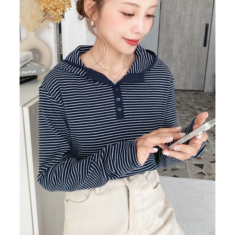 ・ヘンリーネックのボーダーTシャツをとフードの組み合わせでこなれ感のあるカジュアカットソーです♪