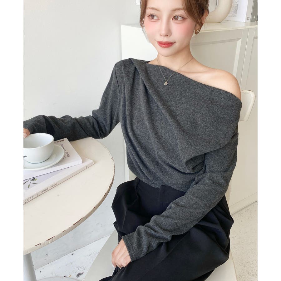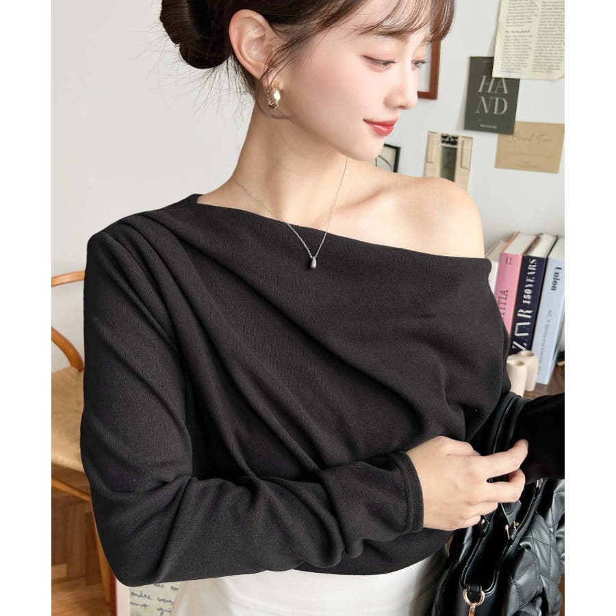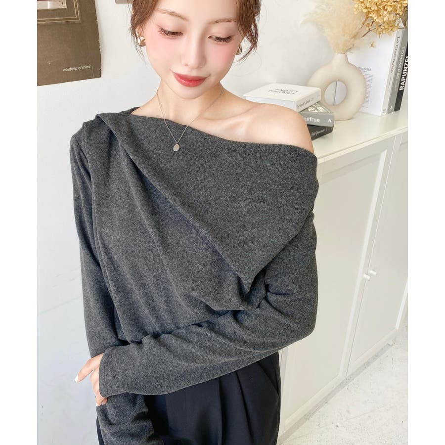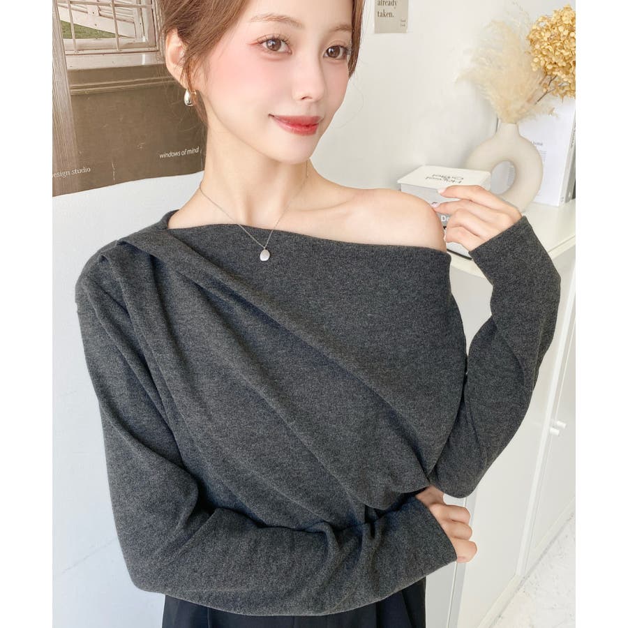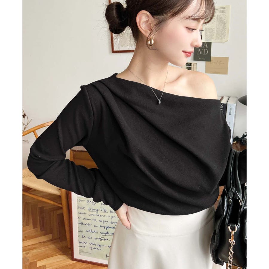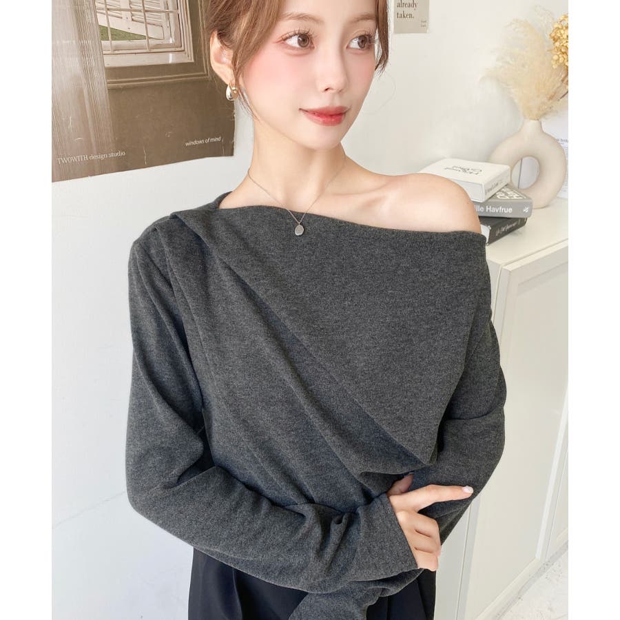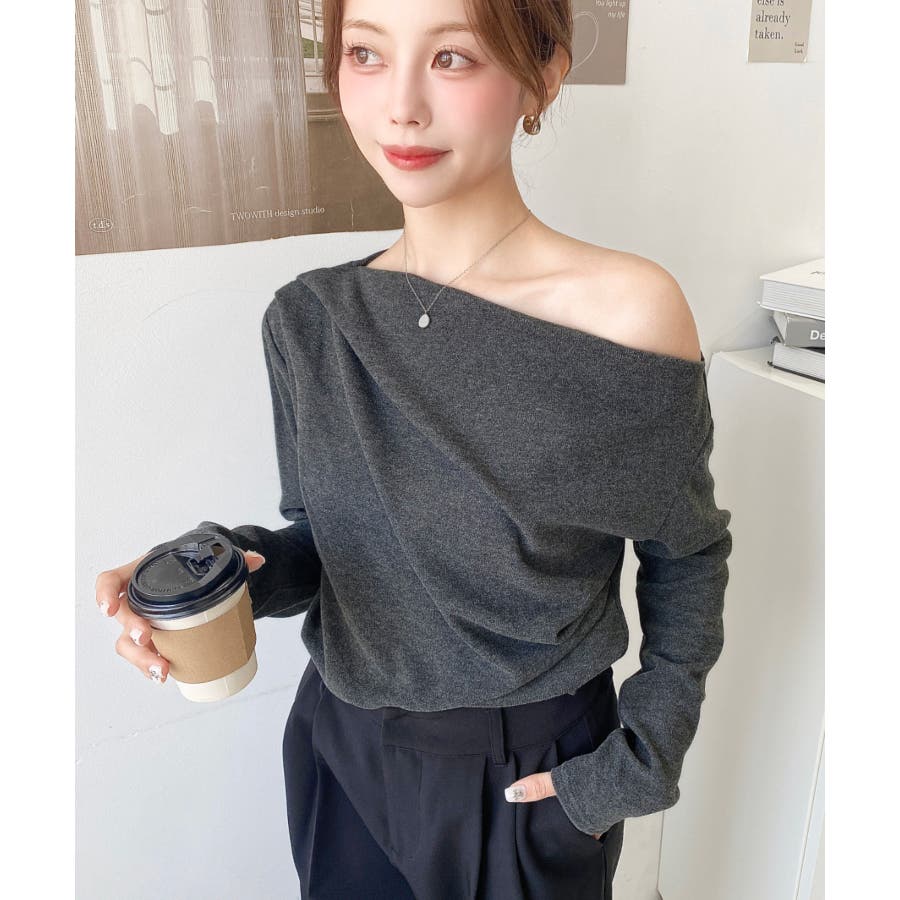 【一枚でフェミニンもカジュアルも楽しめる、ドレープが美しいオフショルニットソー♪】