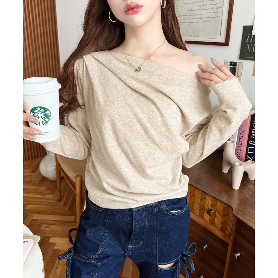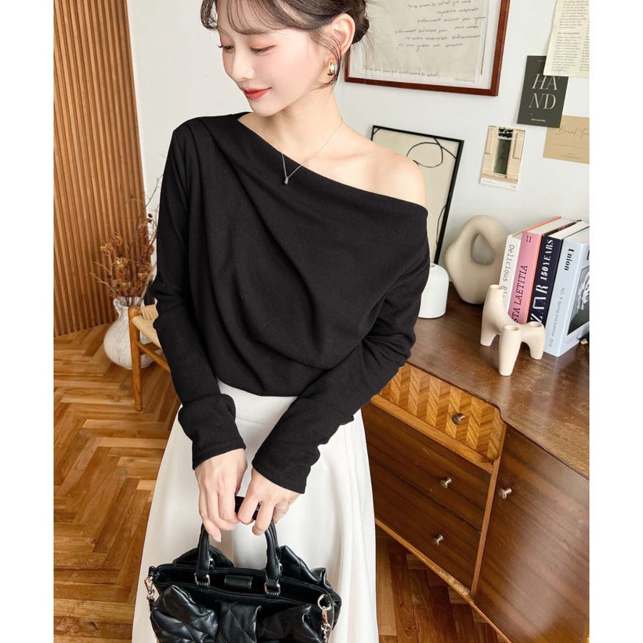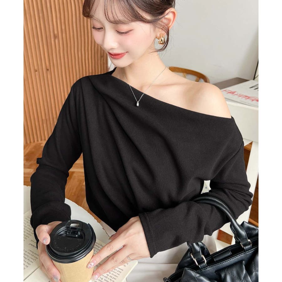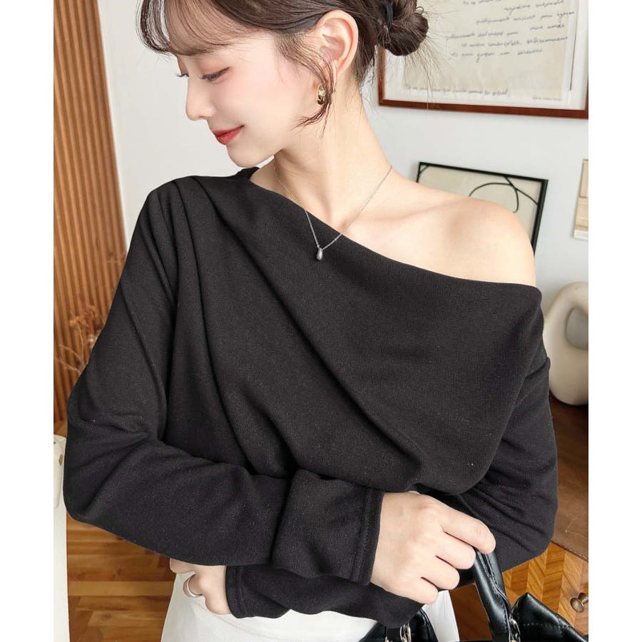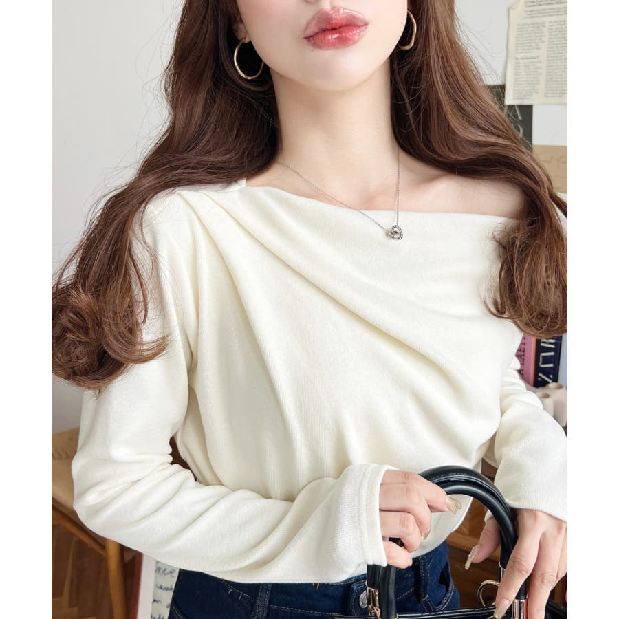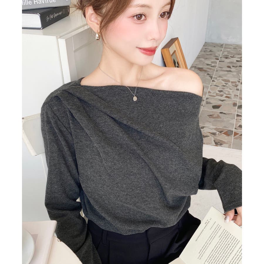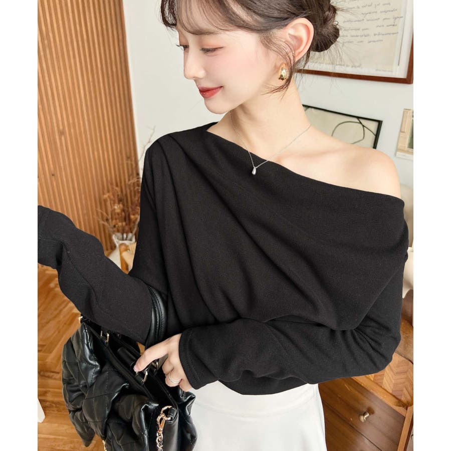 【一枚でフェミニンもカジュアルも楽しめる、ドレープが美しいオフショルニットソー♪】