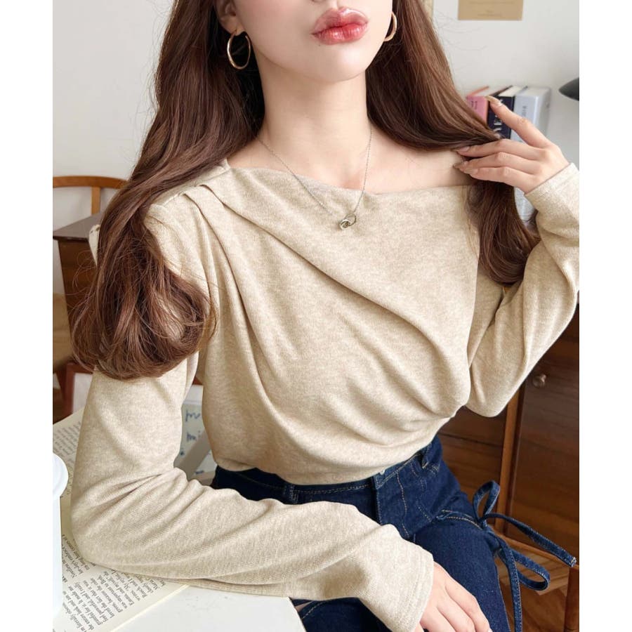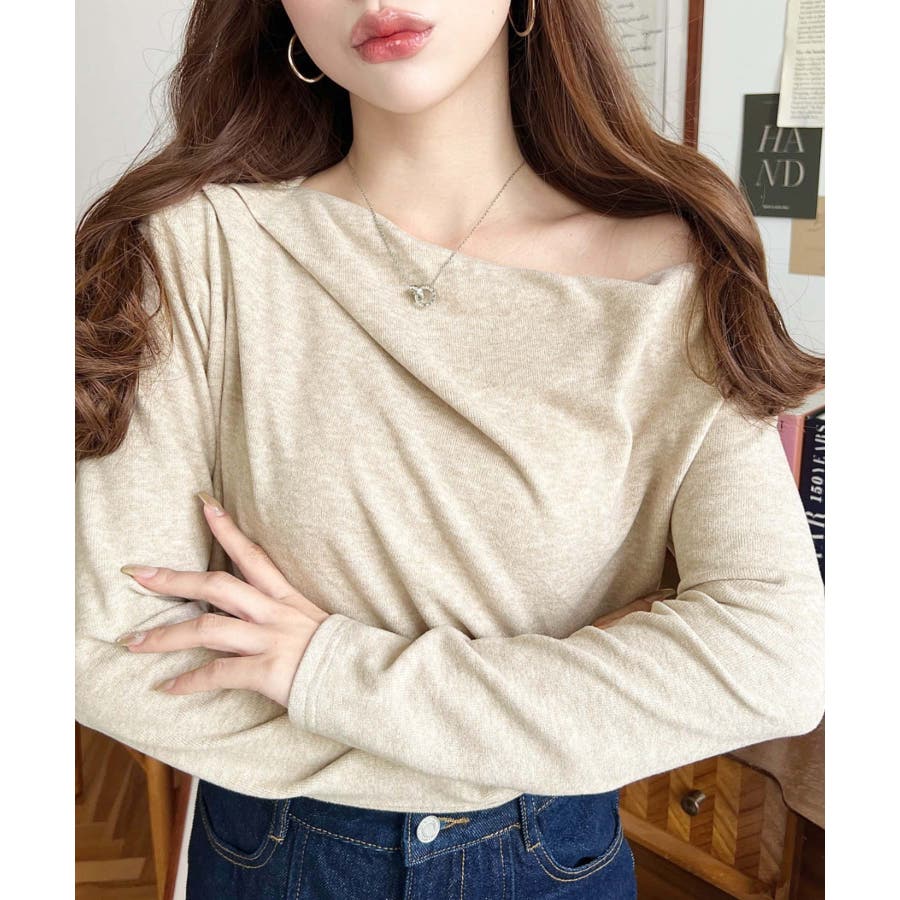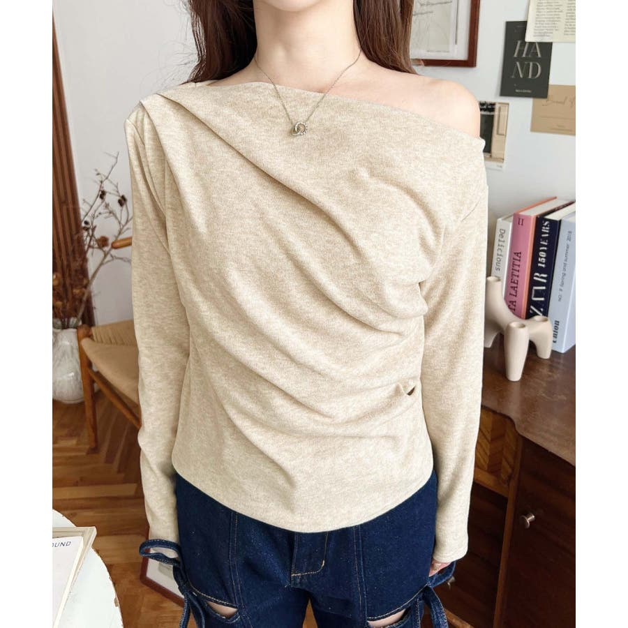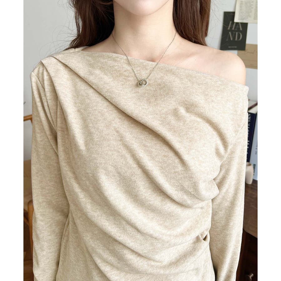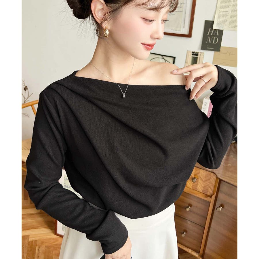 オフショルダーのドレープデザインで自然に肩まわりをカバーしてくれるので、肌見せが苦手でも挑戦しやすい印象♪