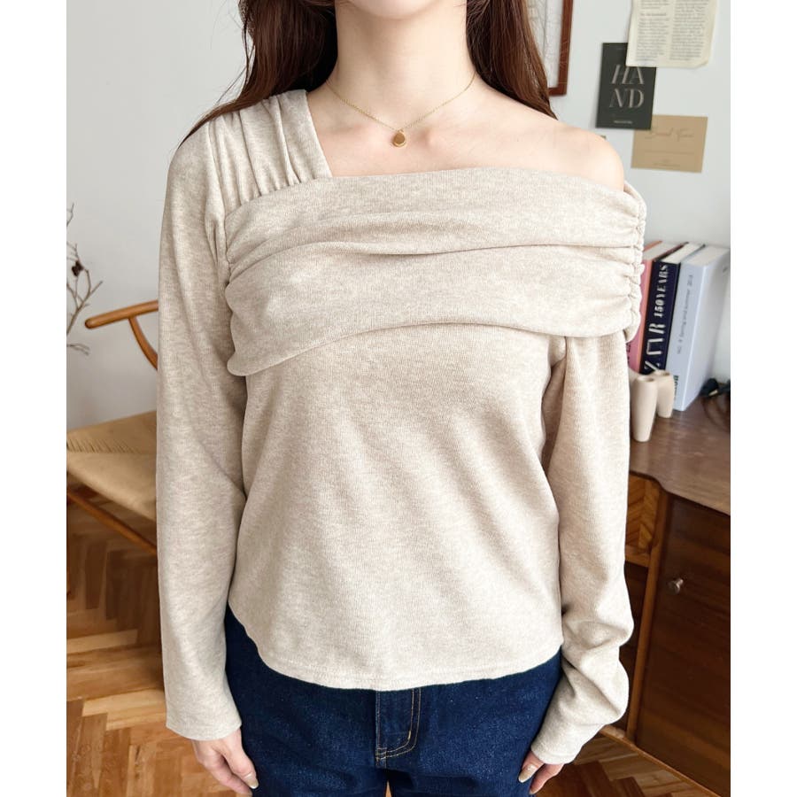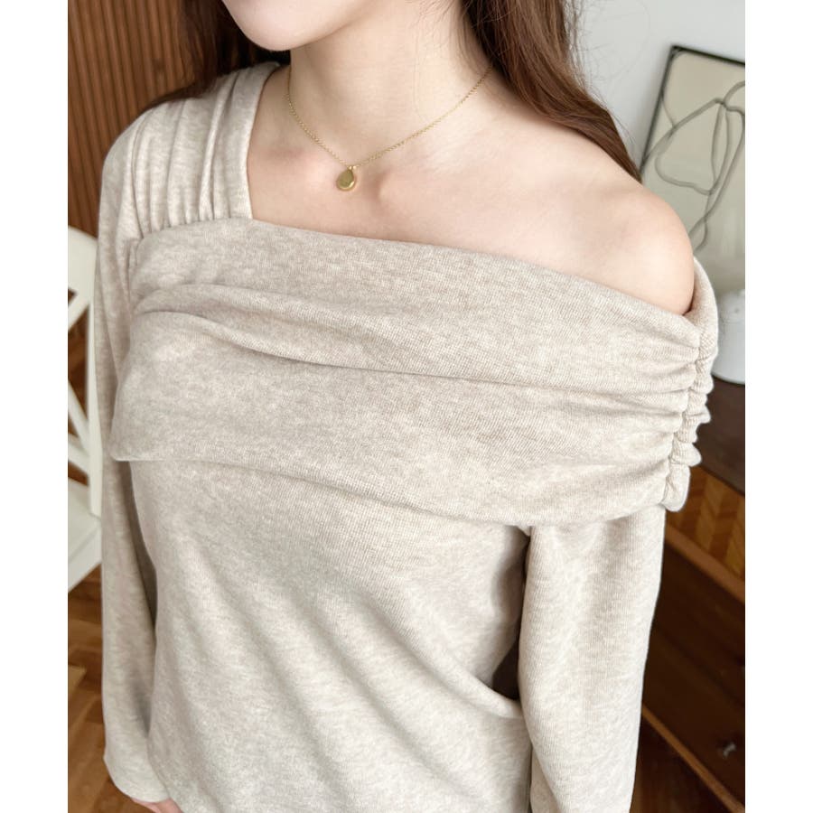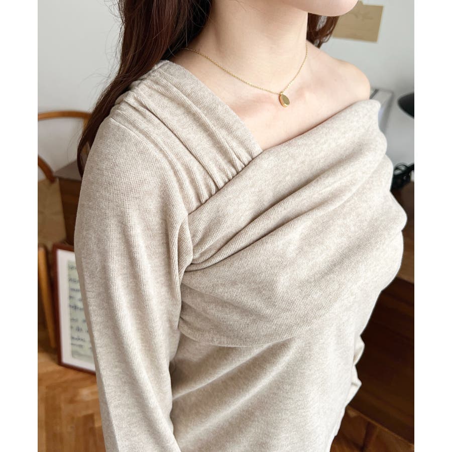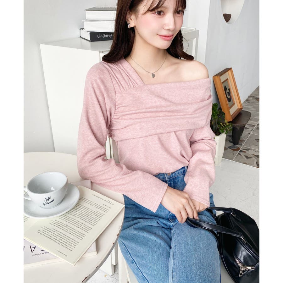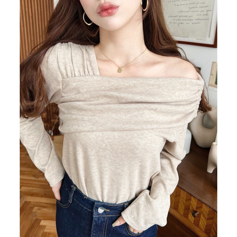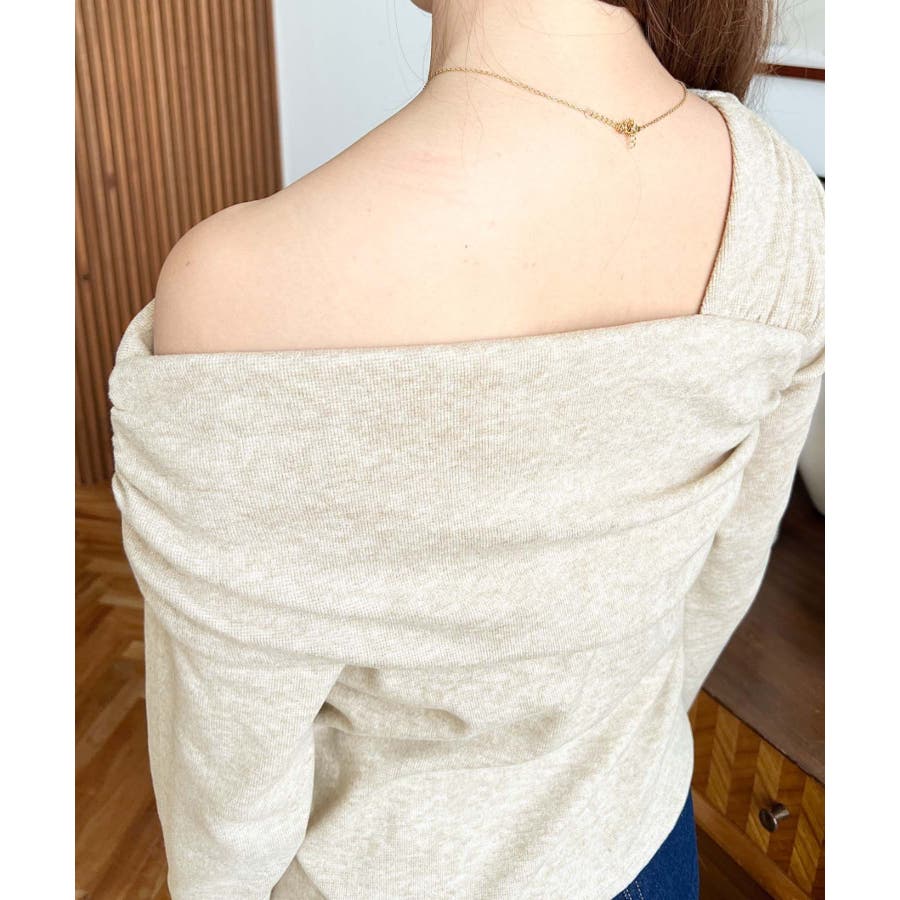 ・ワンショルデザインがデコルテラインを美しく見せつつ、女性らしい印象のプルオーバー。