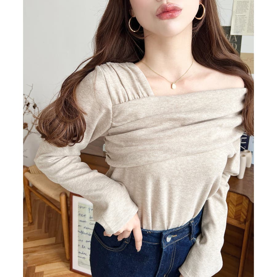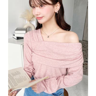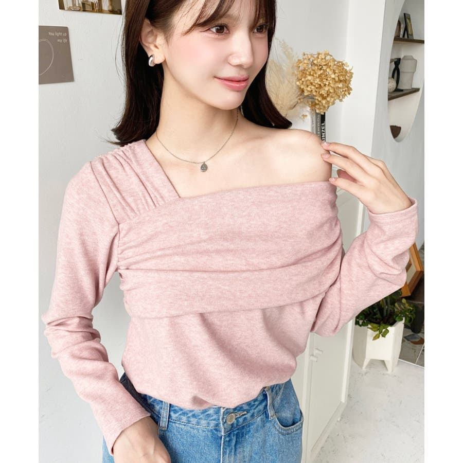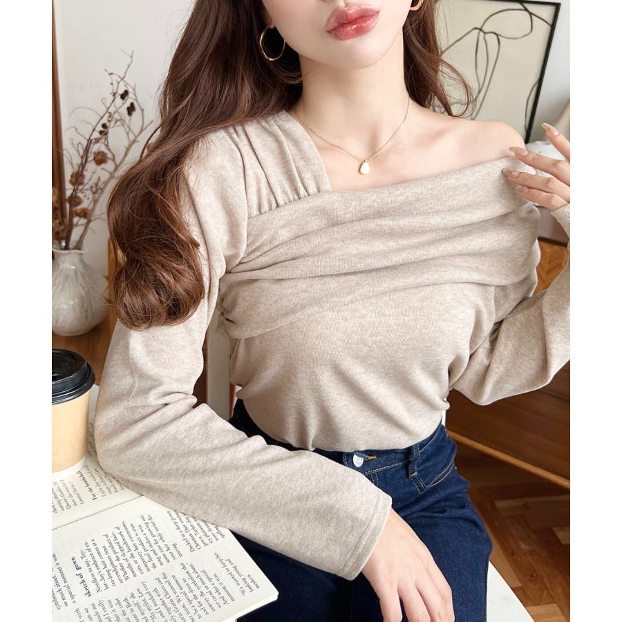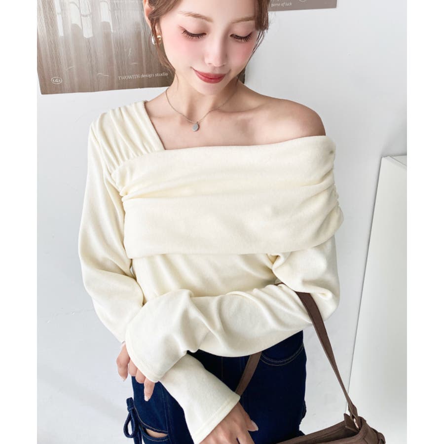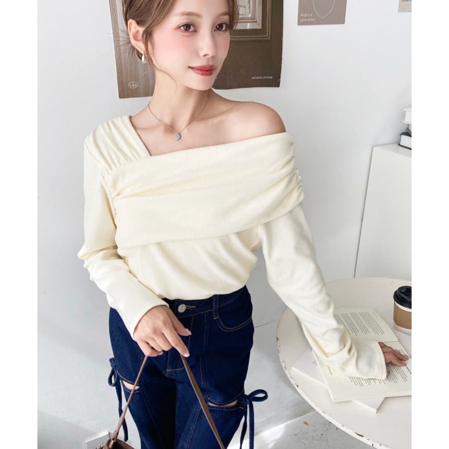 ・ワンショルデザインがデコルテラインを美しく見せつつ、女性らしい印象のプルオーバー。
