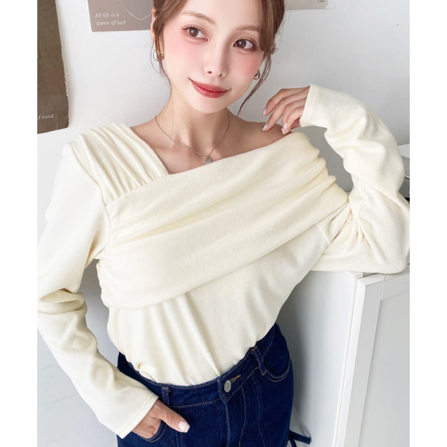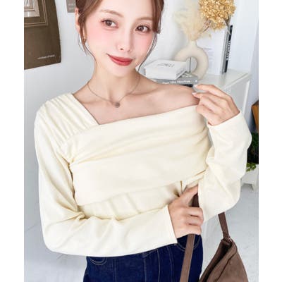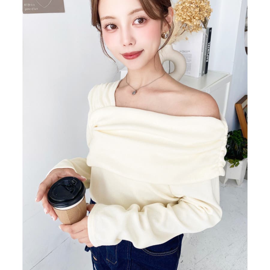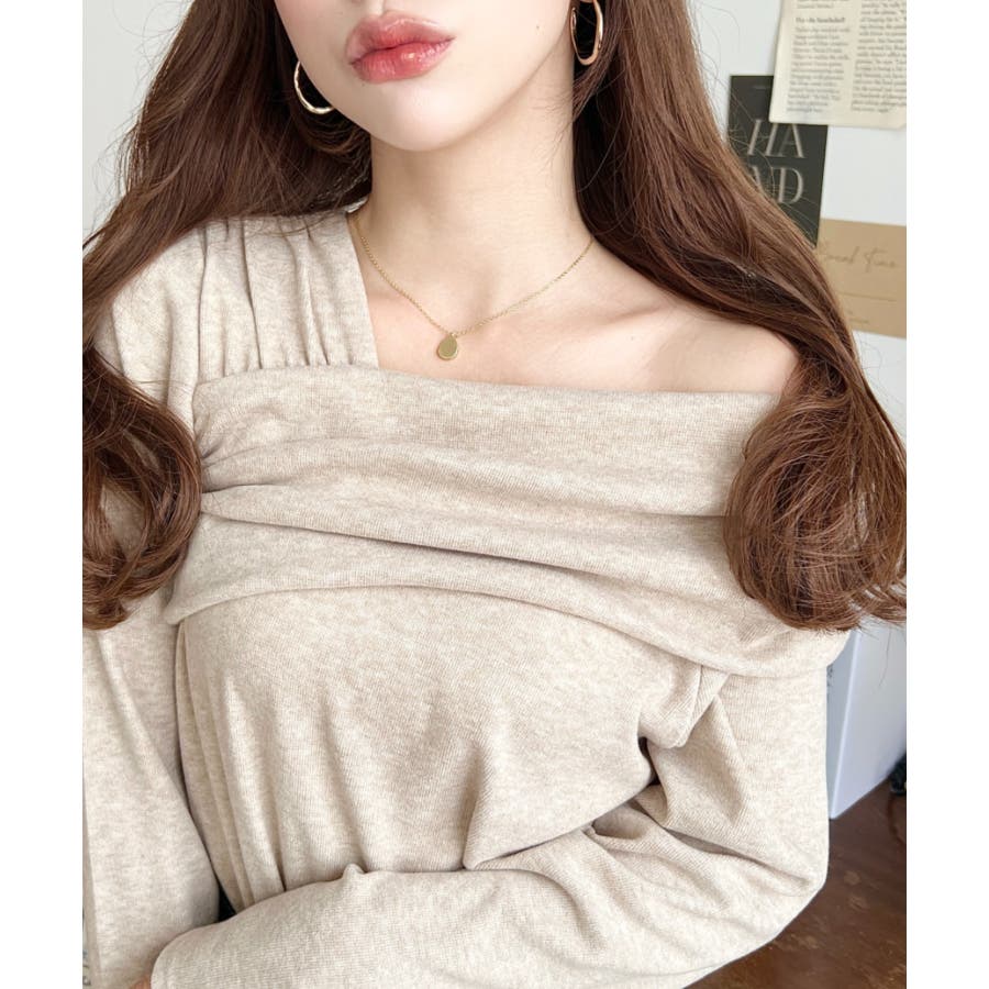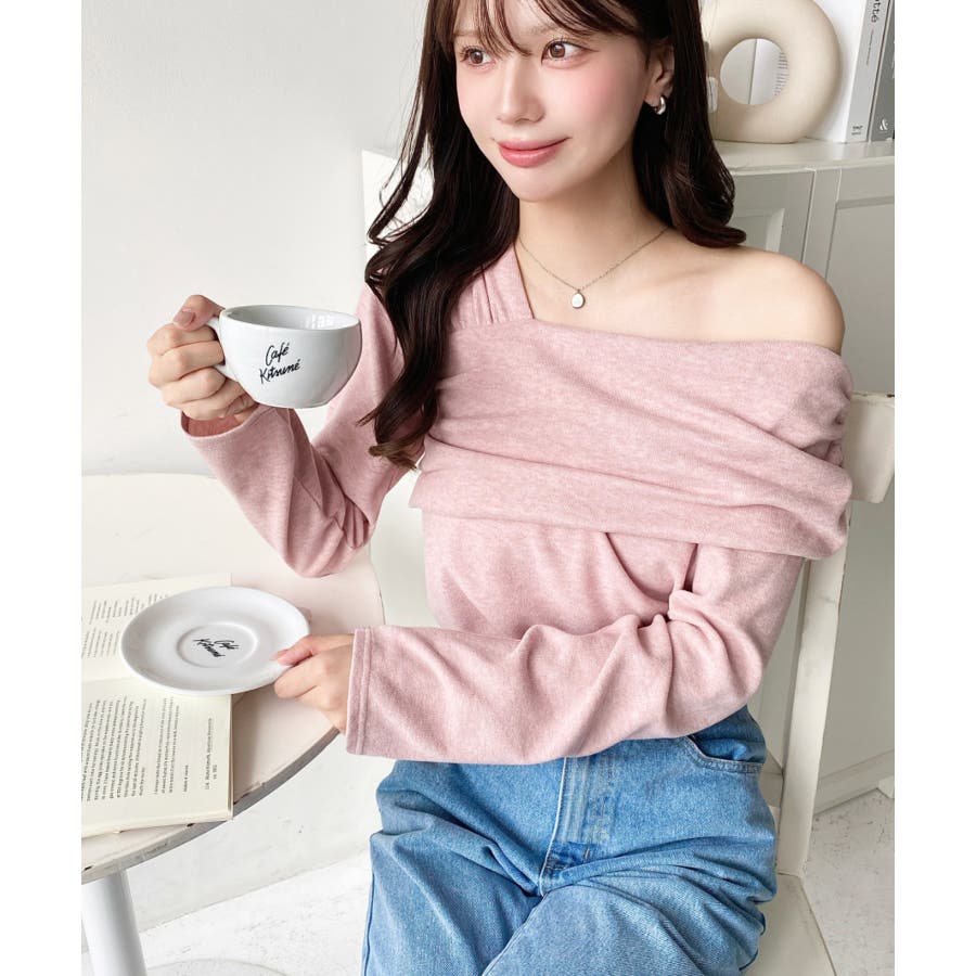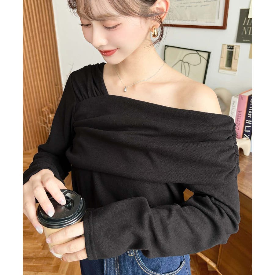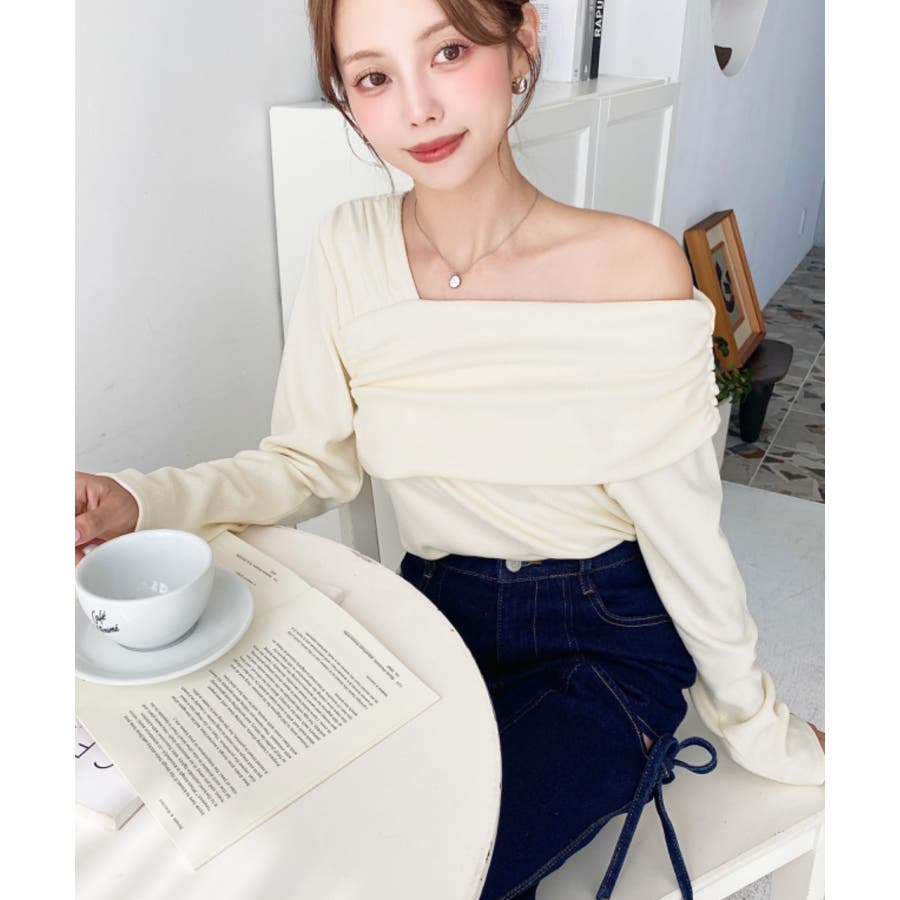 ・ワンショルデザインがデコルテラインを美しく見せつつ、女性らしい印象のプルオーバー。