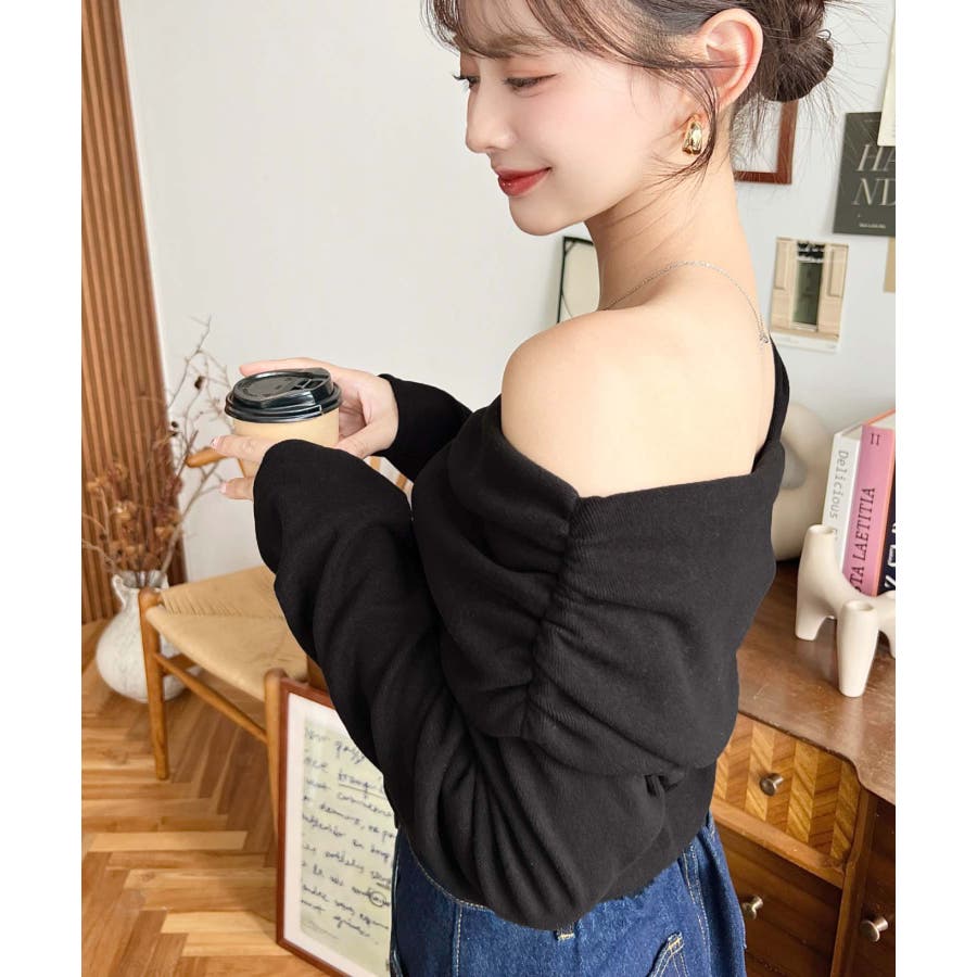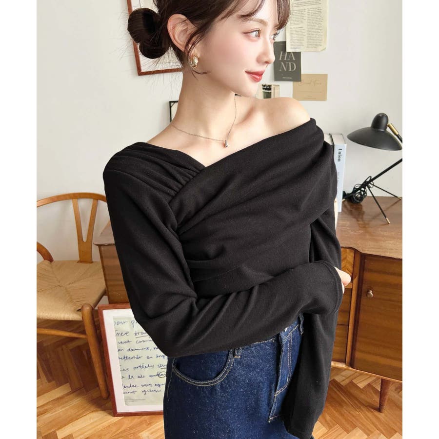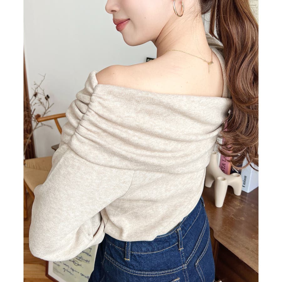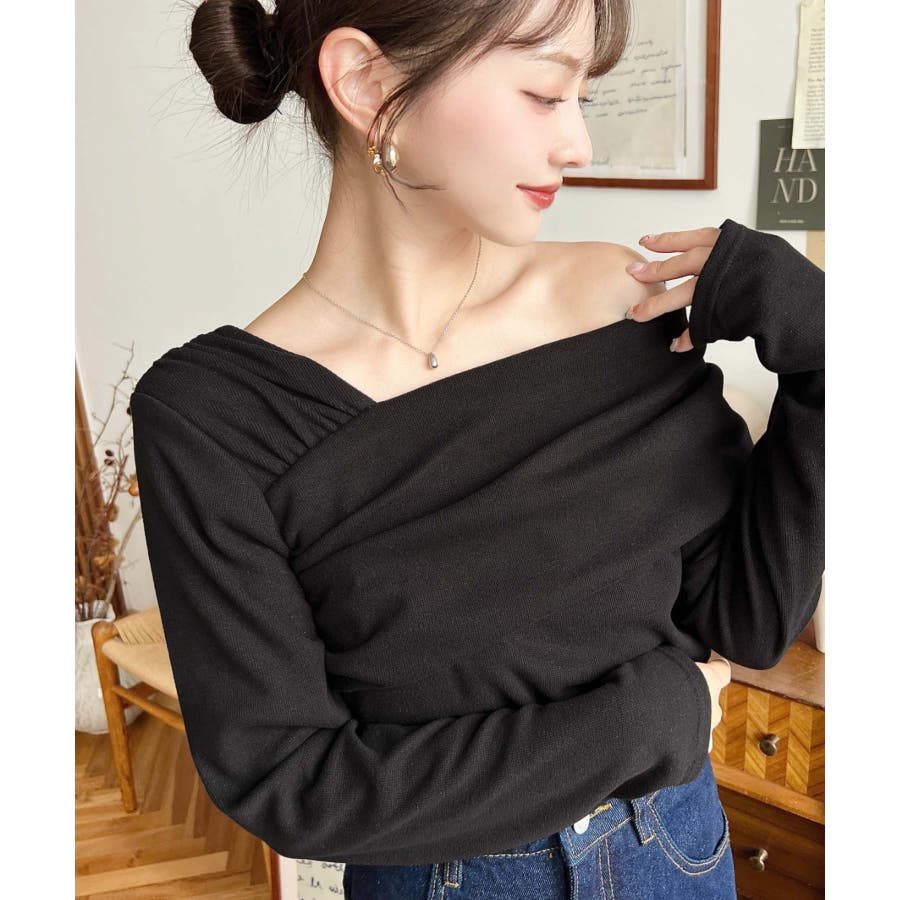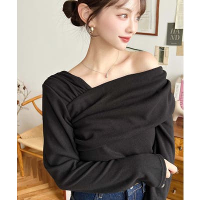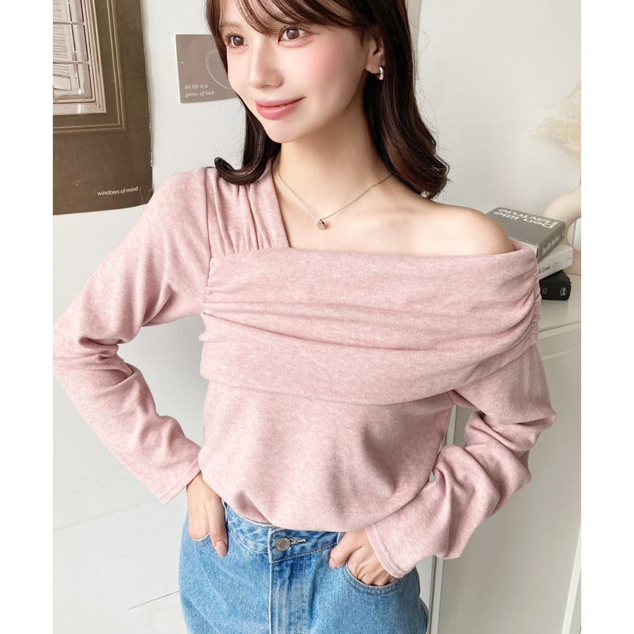 ・ワンショルデザインがデコルテラインを美しく見せつつ、女性らしい印象のプルオーバー。