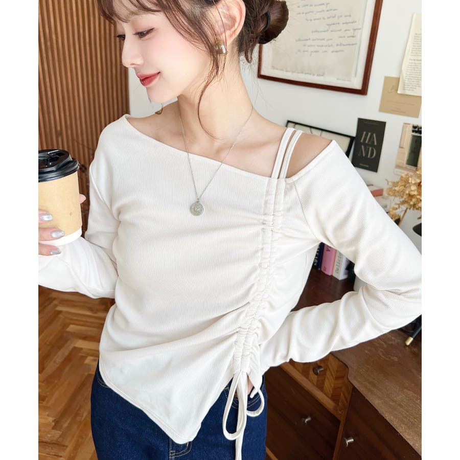 【ワンショルダー×リボンがポイント♪ 長袖リブカットソートップス】