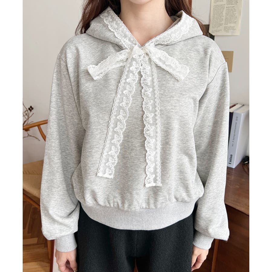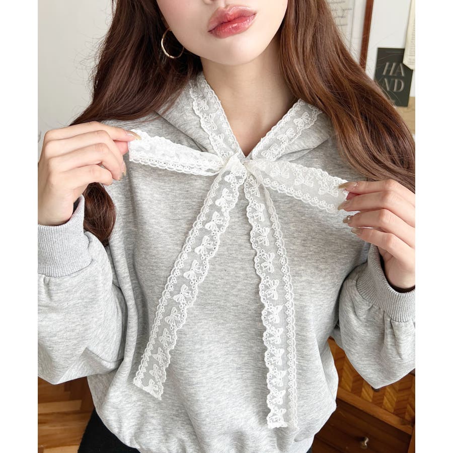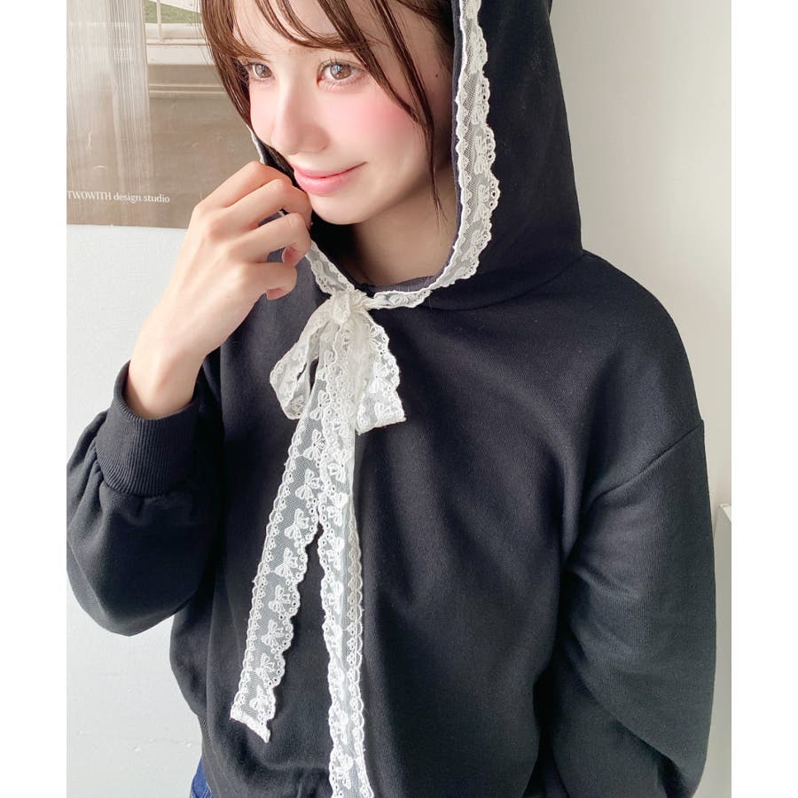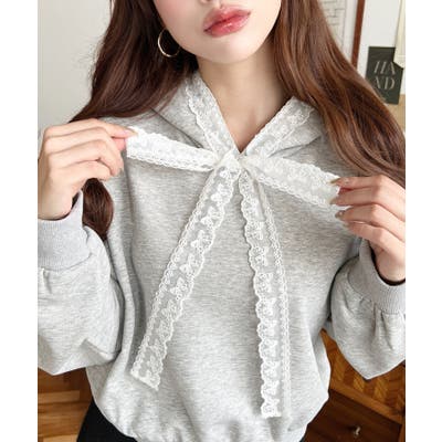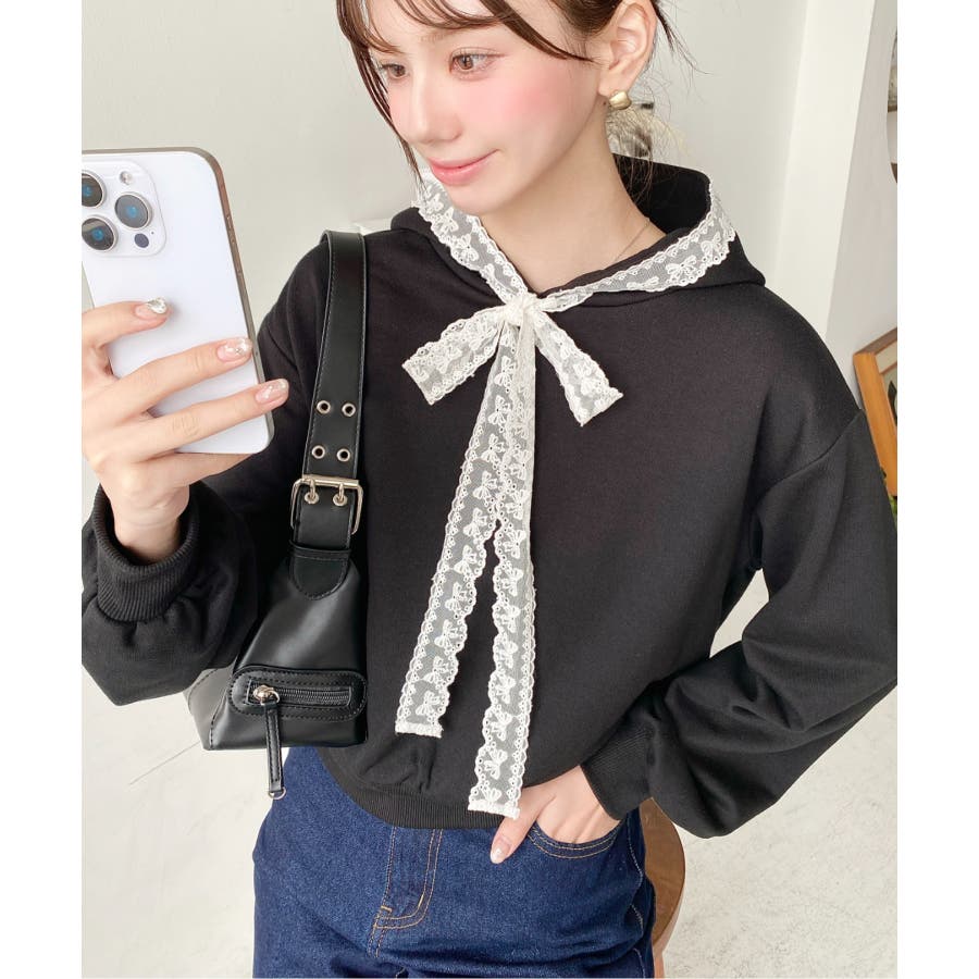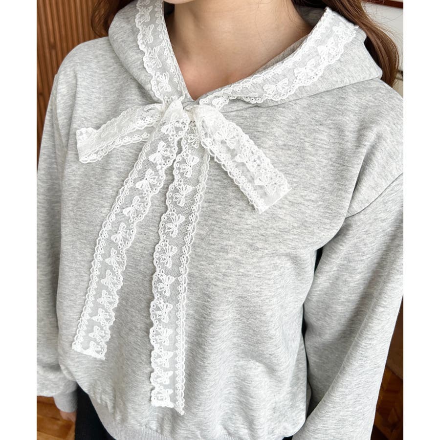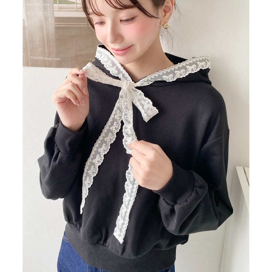 ・シンプルなボディにレースリボンが映えて、ラフなパーカーを華やかに格上げしてくれます。